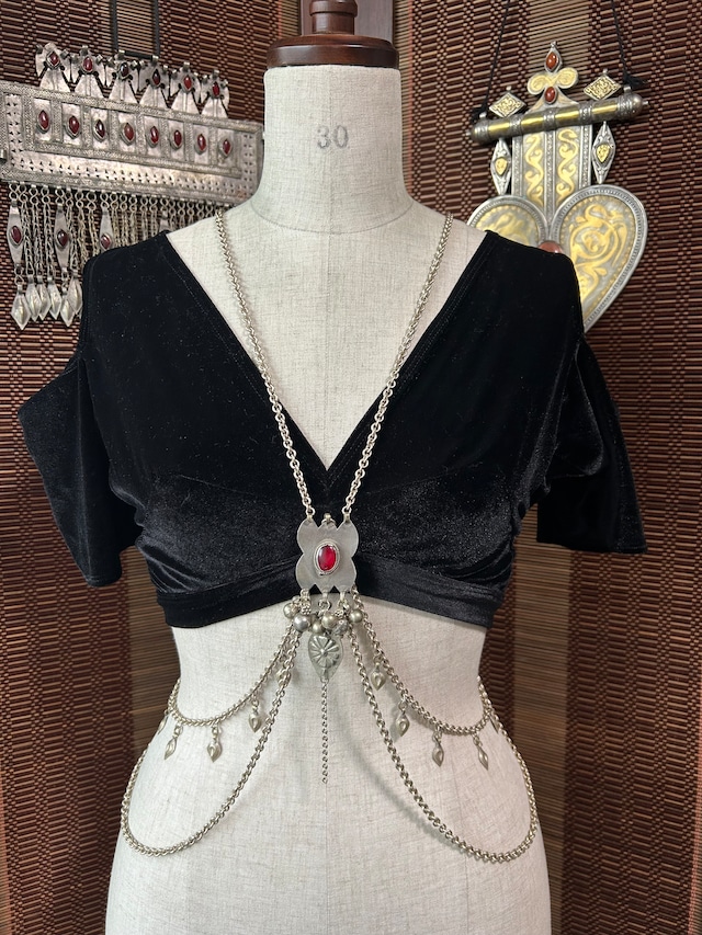 上質なヴィンテージパーツのみを使用。 チェーンはアンティークシルバーカラ。コーティングされた日本製です。チョリを着た時の胸の下にポイントがくるようにしています。胸の下が華やかになるようチェーンはやや短めなので、フェイドやスピンも不安なく行っていただけます。首まわりはヘアガーデンを作った後からでも被れる広さ。背面にもこだわり、チョリやブラの結び紐と重ならない位置にチェーンや飾りを配置。オープンバックに映えるデザインとなっています。 ※微調整いたしますので、ご購入時に備考欄より身長と胸囲をお知らせください。 Only high-quality vintage parts are used. The chain is antique silver colored and coated, made in Japan. It is designed to sit just below the bust when wearing a choli. The chain is slightly short, so you can easily fade or spin the hairstyle. The neckline is wide enough to wear even after creating a hair garden.The back has also been carefully designed, with the chain and decorations positioned so they do not overlap with the choli or bra strings. The design makes the open back stand out.