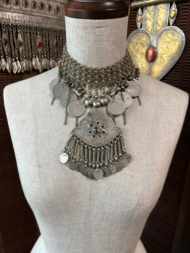 コインやカシミールペンダントを使ったチョーカーと、パールのように美しいアフガニスタンのシルバービーズを使ったチョーカーの組み合わせ。ヴィンテージシルバービーズをピカピカになりすぎない程度に磨いていますが、経年による変色がところどころ見受けられます。 ペンダントに使っているのは天然石ヘマタイトです。 A combination of chokers made with coins and Kashmir pendants, and chokers made with beautiful Afghan silver beads that look like pearls.The silver beads are not pure silver, but are thought to be of a high purity.They have been polished just enough to avoid making them too shiny.