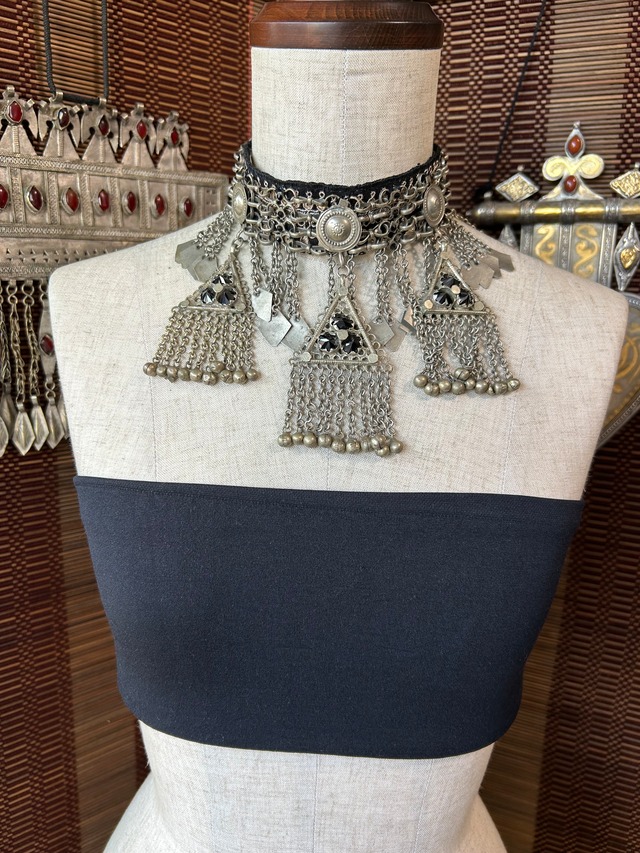 ジェットブラックの大粒スワロフスキーを入れたトルクメンネックレス。わりと新しいお品のようで、 溶接による焼けはありますが、経年による変色はほとんどなくきれいです。赤白のビーズで縁取りしてありましたが、フュージョンでも使いやすいように除去しました。 本来は衣服の上から着用するため首まわりが大きめですが、こちらは首まわりが細い方ように縮めました。標準の首まわりの方ですと画像くらい後ろが開きます。 ★中央に垂れ下がった飾りが要らなければ除去して 1,500円引きいたします。もしくはチェーン代2,000円追加でチョーカーとボディチェーンに分けることもできます。ご相談ください。 This Turkmen necklace features large jet black Swarovski crystals. It appears to be a fairly new item, and although there is some discoloration from welding, it is in excellent condition with almost no discoloration due to age. It was originally edged with red and white beads, but these have been removed to make it easier to use with Fusion. It is originally designed to be worn over clothing, so it fits larger around the neck, but this one has been shortened to fit those with smaller necks. For standard neck size wearers, the back will open as shown in the image.