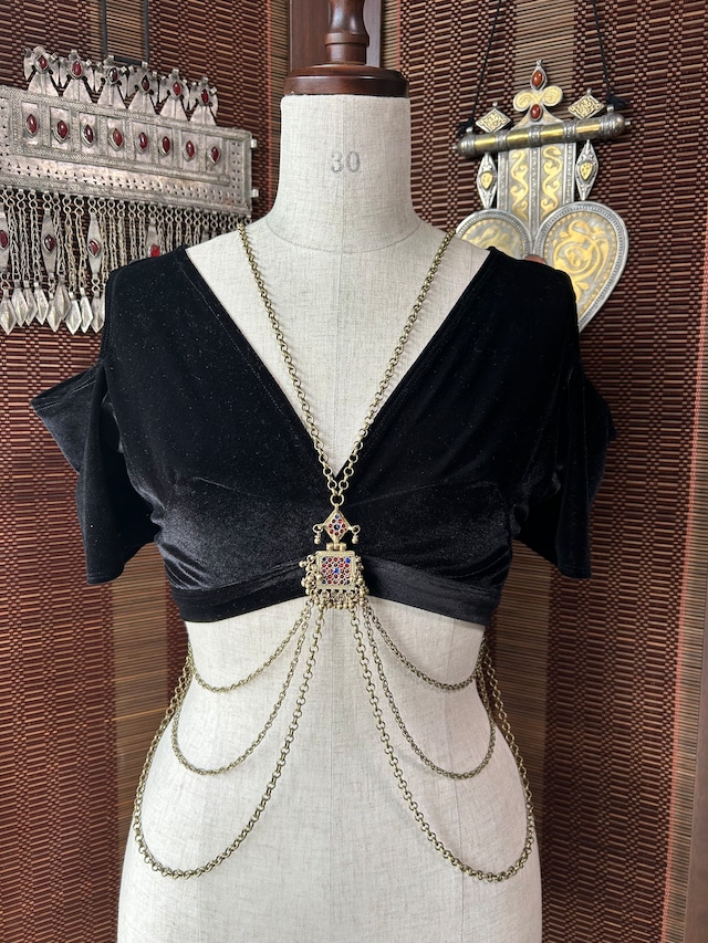 上質なヴィンテージパーツのみを使用。 チェーンはアンティークシルバーカラーで、コーティングありの日本製。チョリを着た時の胸の下にポイントがくるようにしています。 チェーンはやや短めなので、フェイドやスピンも不安なく行っていただけます。首まわりはヘアガーデンを作った後からでも被れる広さ。 背面にもこだわり、チョリ やブラの結び紐と重ならない位置にチェーンや飾りを配置。オープンバックに映えるデザインとなっています。 ※微調整いたしますので、ご購入時に備考欄より身長と胸囲をお知らせください。 Only high-quality vintage parts are used. The chain is antique silver colored and coated in Japan. It is designed to be the focal point under the bust when worn with a choli. The chain is slightly short to add a touch of elegance to the area under the bust, allowing you to fade or spin without worry. The neckline is wide enough to be worn even after creating a hair garden. The back has also been carefully designed, with the chain and decorations positioned so that they do not overlap with the choli or bra strings. The design stands out against an open back.