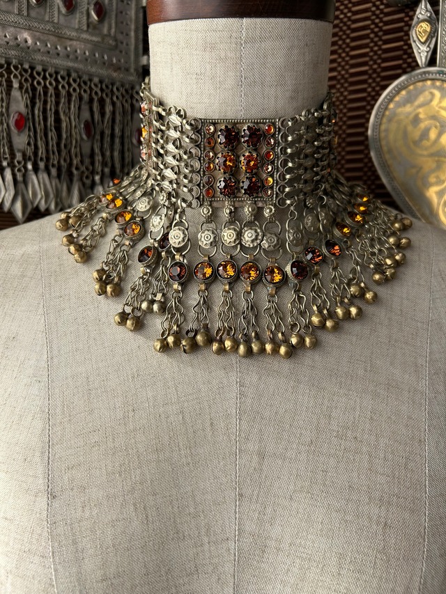ジェットブラックの大粒スワロフスキーを入れたトルクメンネックレス。わりと新しいお品のようで、 溶接による焼けはありますが、経年による変色はほとんどなくきれいです。赤白のビーズで縁取りしてありましたが、フュージョンでも使いやすいように除去しました。 本来は衣服の上から着用するため首まわりが大きめですが、こちらは首まわりが細い方ように縮めました。標準の首まわりの方ですと画像くらい後ろが開きます。 ★中央に垂れ下がった飾りが要らなければ除去して 1,500円引きいたします。もしくはチェーン代2,000円追加でチョーカーとボディチェーンに分けることもできます。ご相談ください。 This Turkmen necklace features large jet black Swarovski crystals. It appears to be a fairly new item, and although there is some discoloration from welding, it is in excellent condition with almost no discoloration due to age. It was originally edged with red and white beads, but these have been removed to make it easier to use with Fusion. It is originally designed to be worn over clothing, so it fits larger around the neck, but this one has been shortened to fit those with smaller necks. For standard neck size wearers, the back will open as shown in the image.