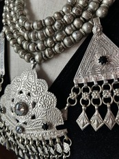 A gorgeous four-strand Kashmir necklace. The colored ornaments have been replaced with monotone colors.