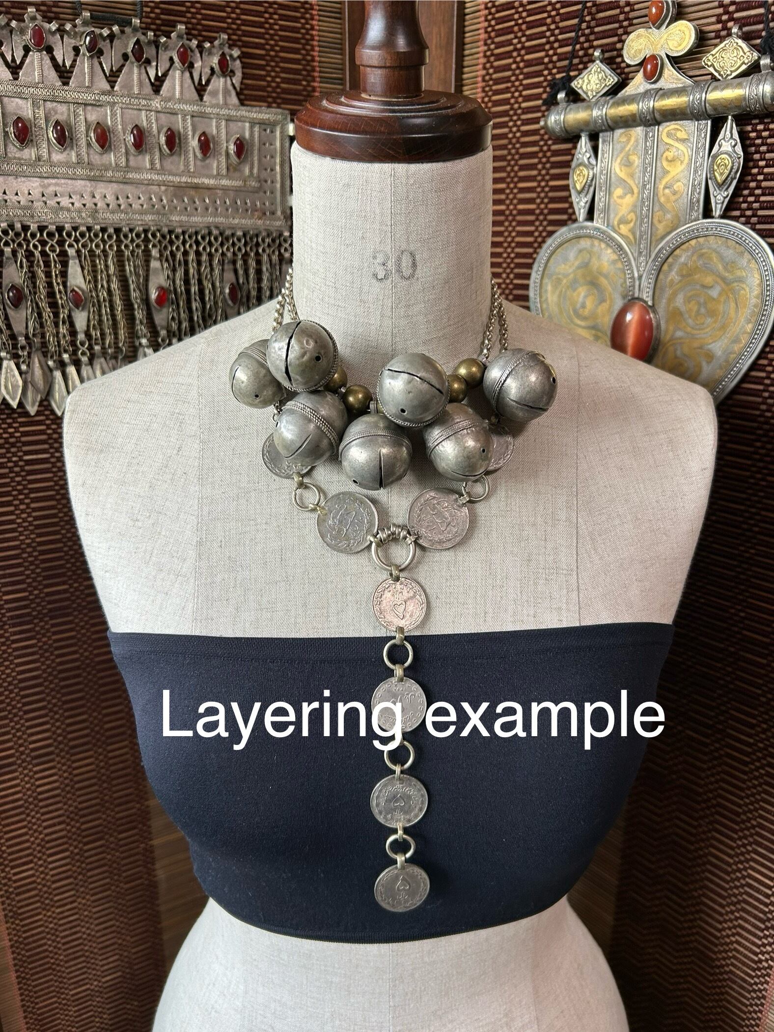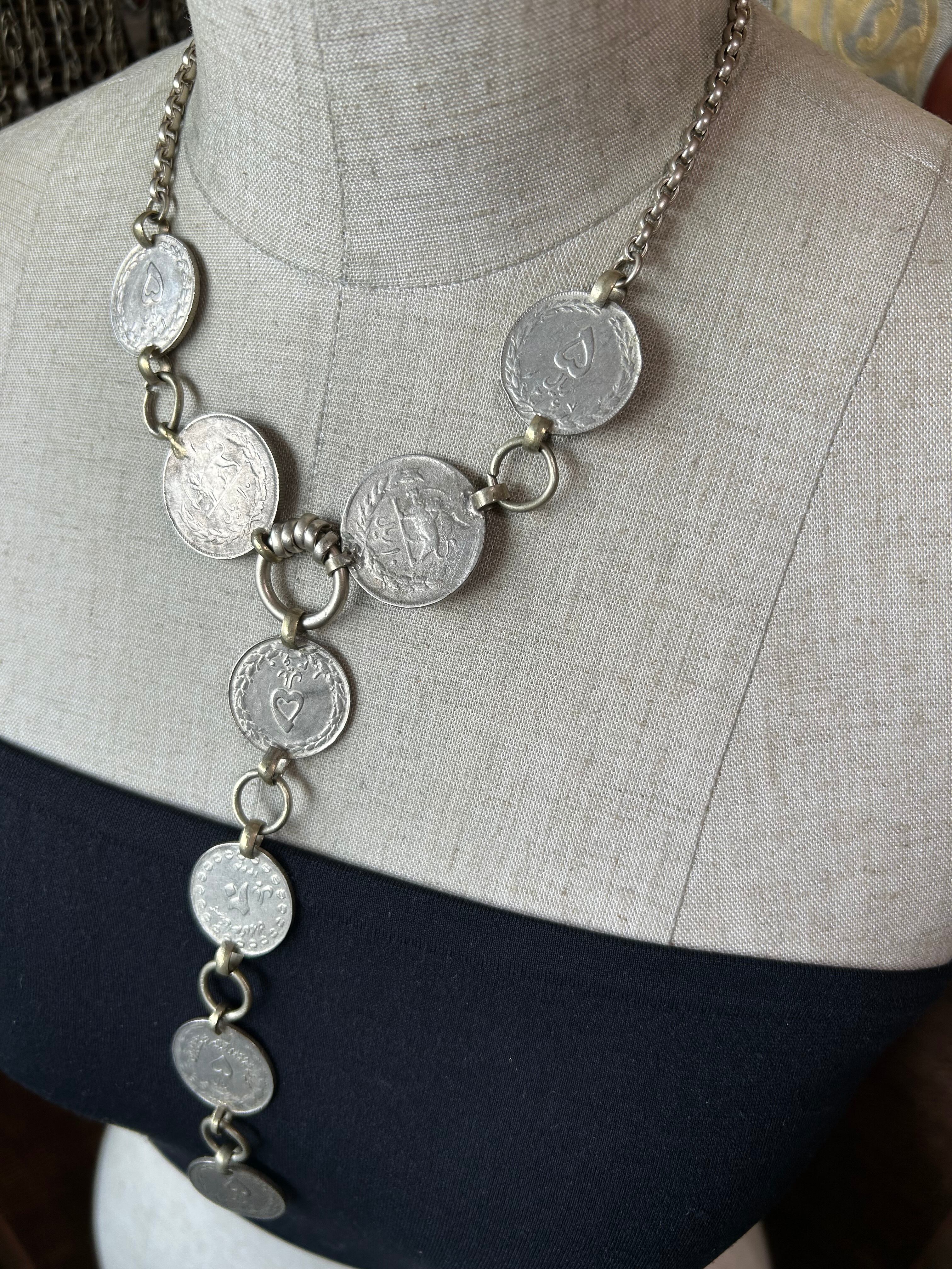 Coins with thin loops on the top and bottom are rare, and this necklace features one in excellent condition. This long necklace is beautiful whether worn alone or layered. The chain has been replaced with one coated by my store.