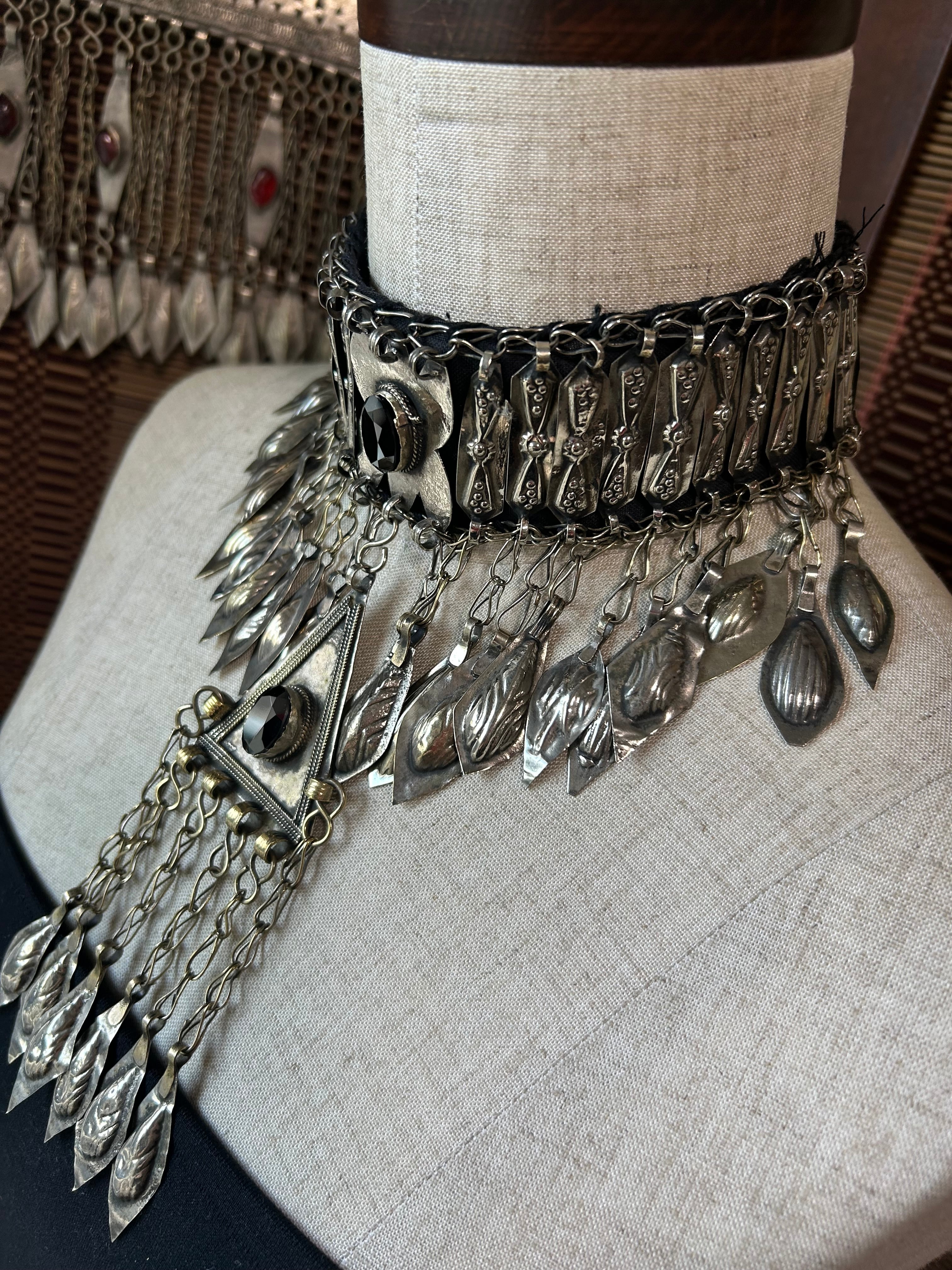 This Turkmen necklace features large hematite-colored (blackish silver) Swarovski crystals. It's a fairly new piece, and although there's some discoloration from welding, it's in excellent condition with almost no discoloration due to age.