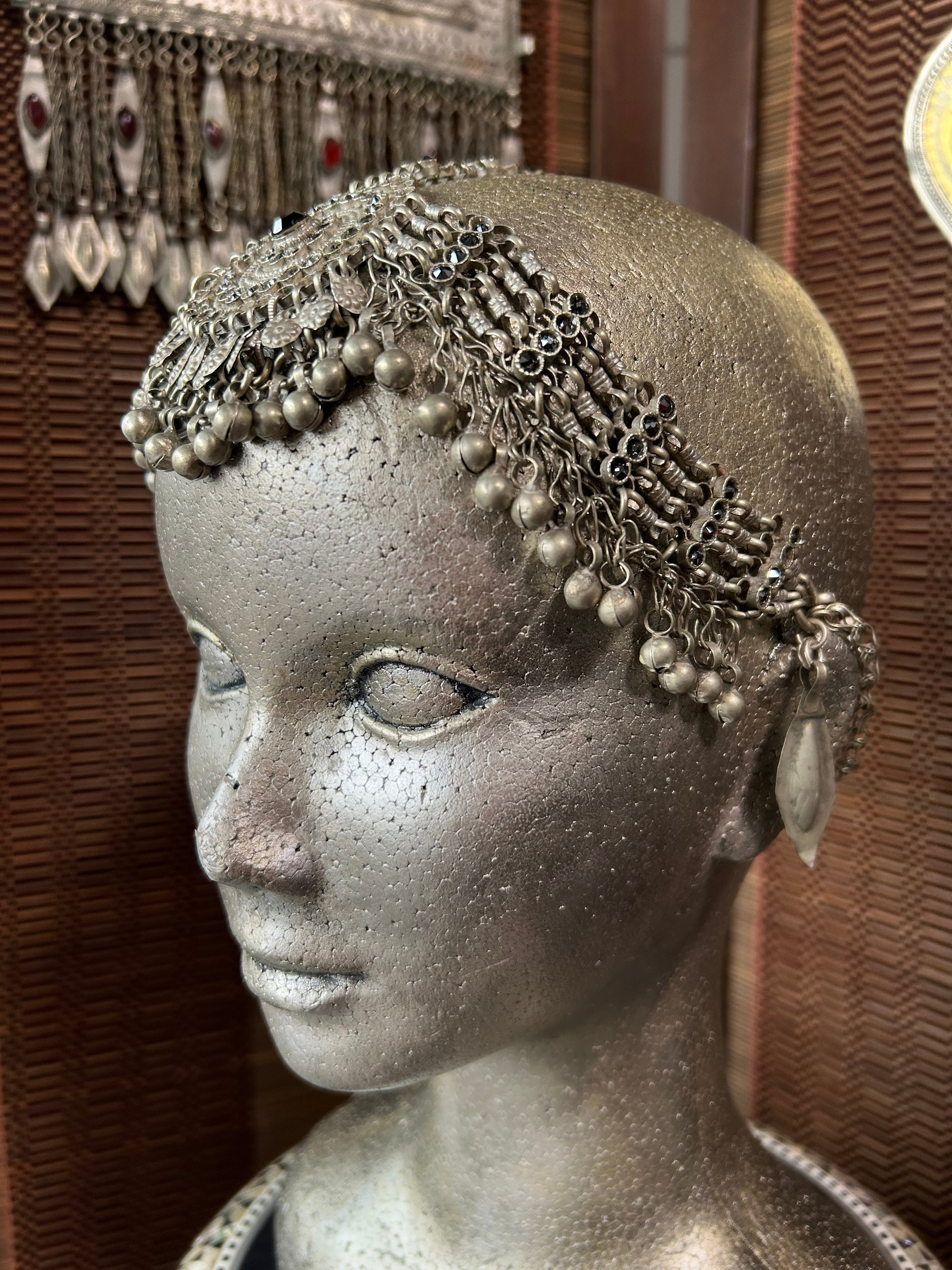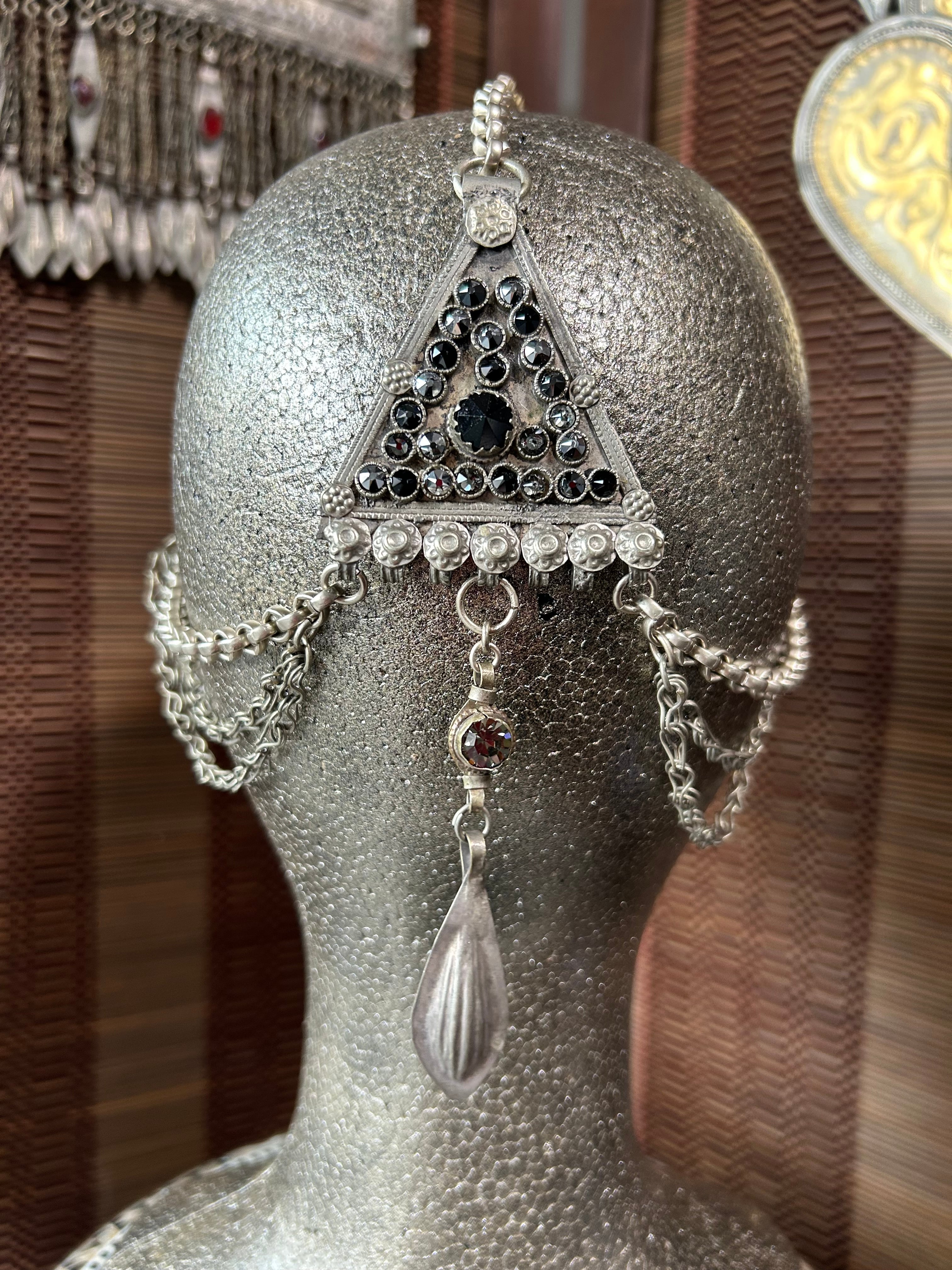 ベースはクチ族のヘッドドレスです。仕入れたときについていた裏布が短すぎてどうにもならなかったのでチェーンを付けてリメイクしました。フォークロアスタイルをモノトーンで装いたいときにぴったりです。