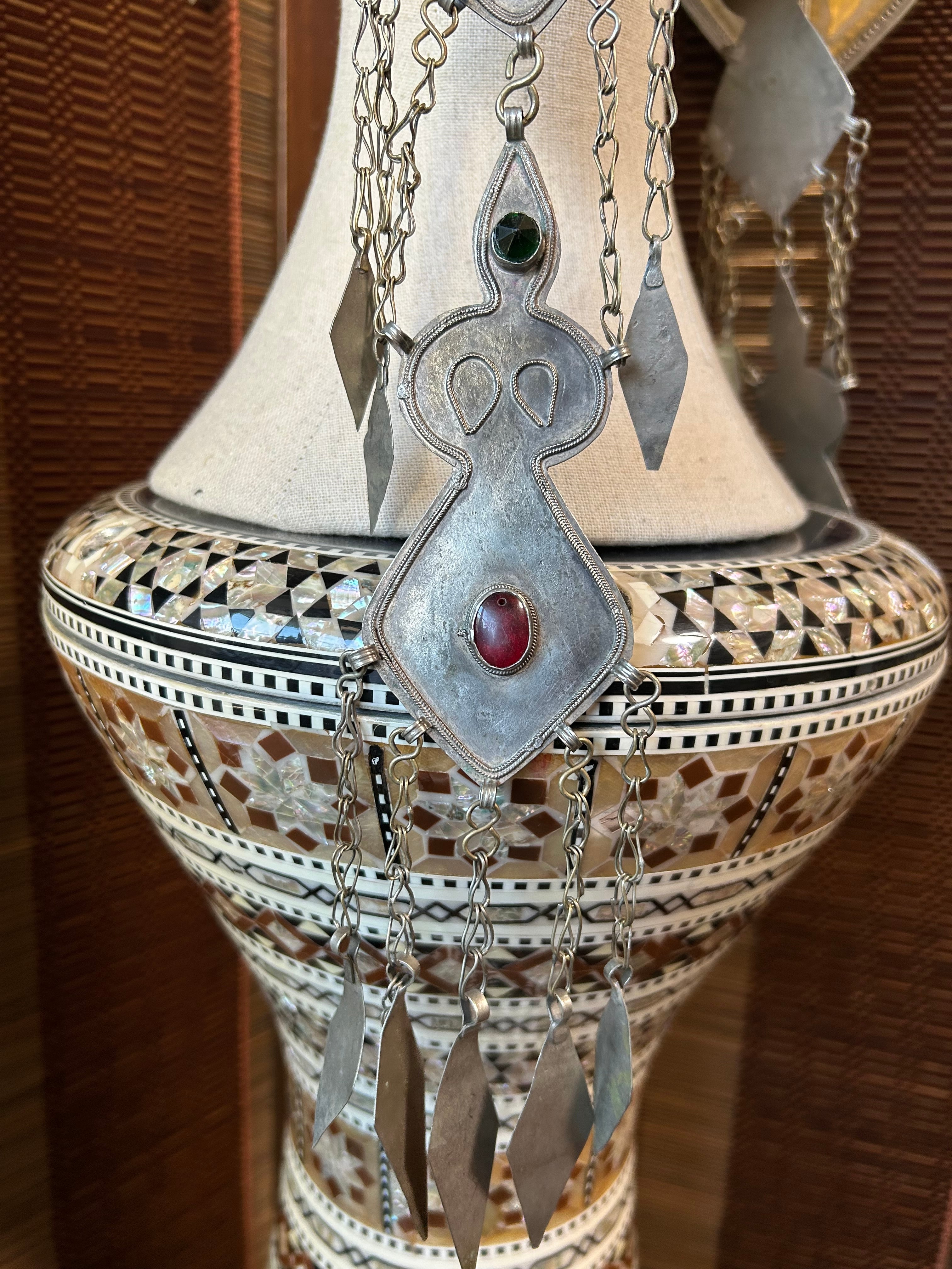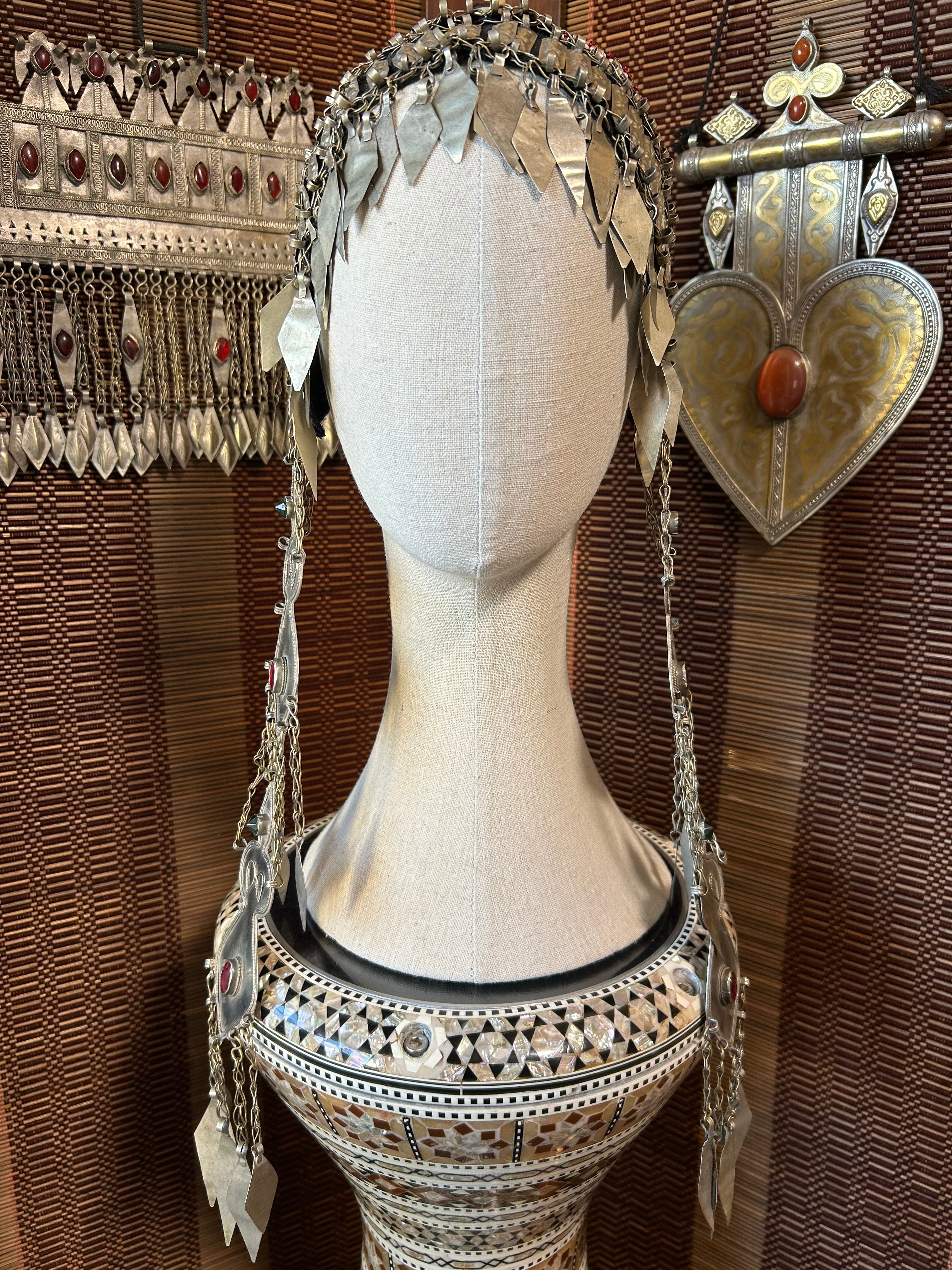 This Turkmen headdress is made in Afghanistan. Its decorative design around the face is very exotic. It's used in fusion and folklore styles, and more recently in FCBD. Feel free to remake it into a belt or choker.