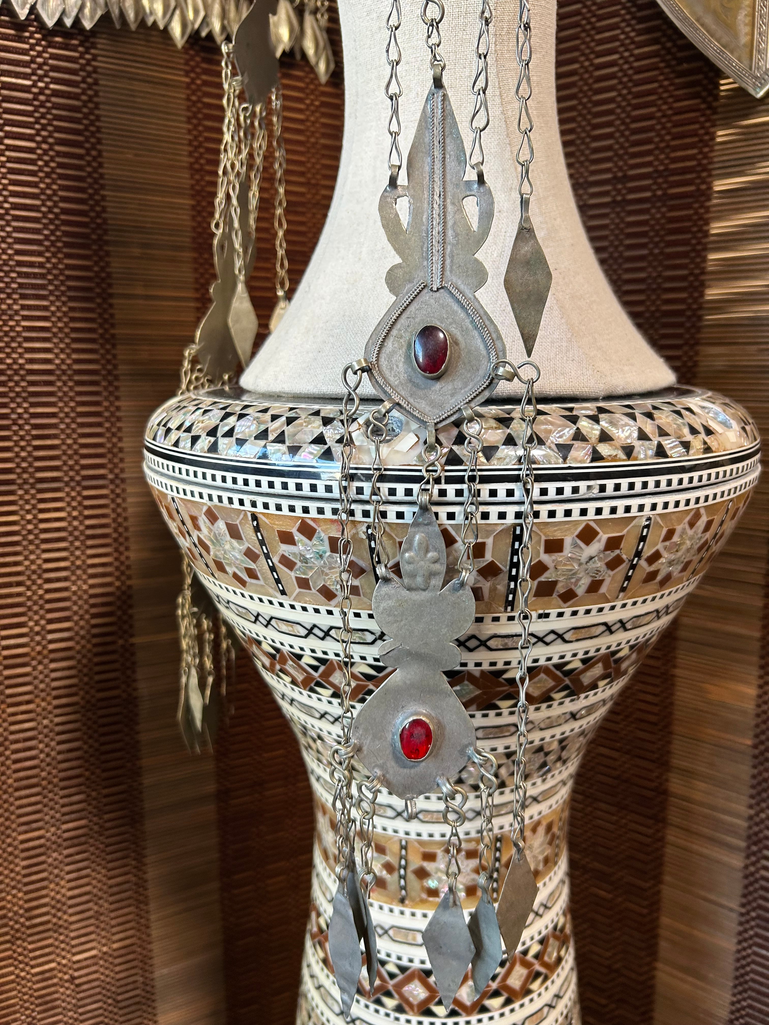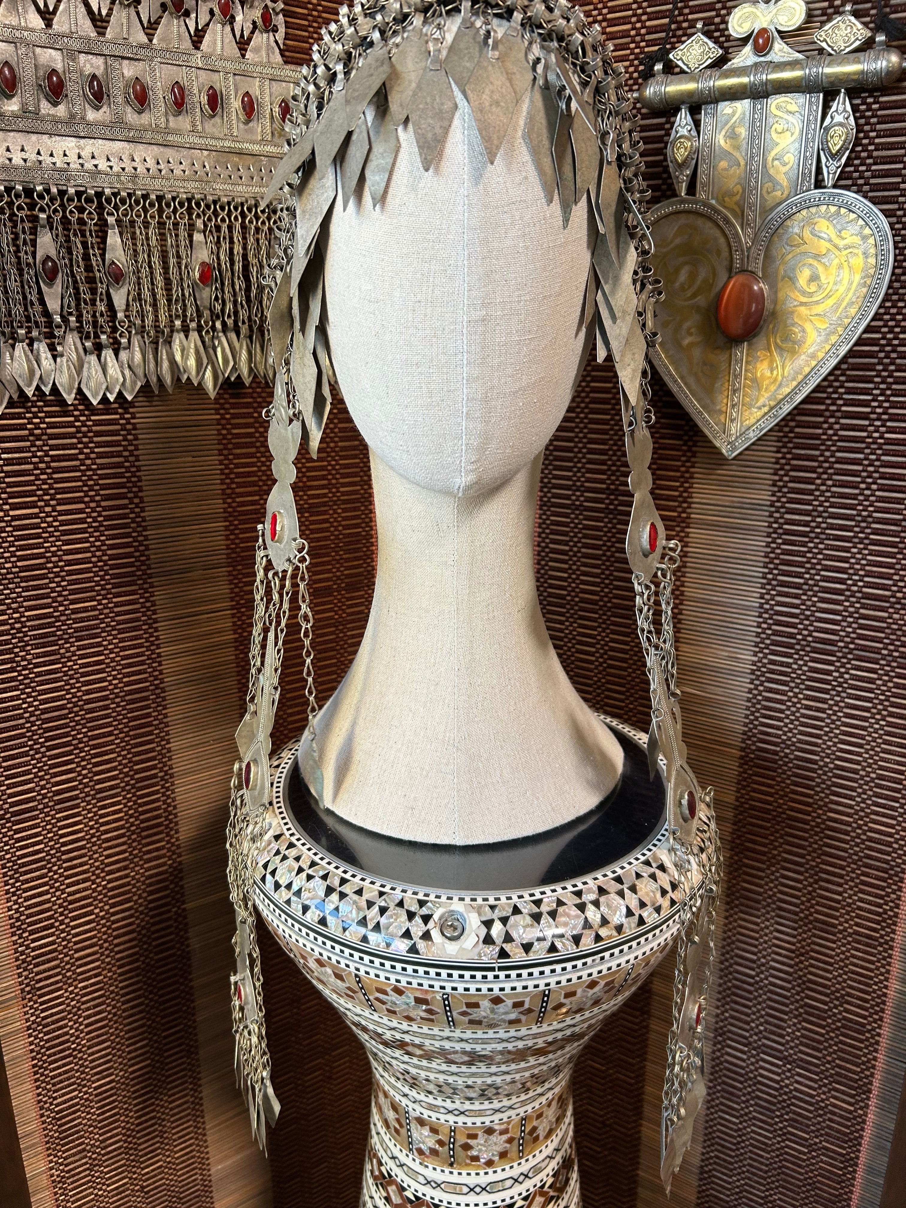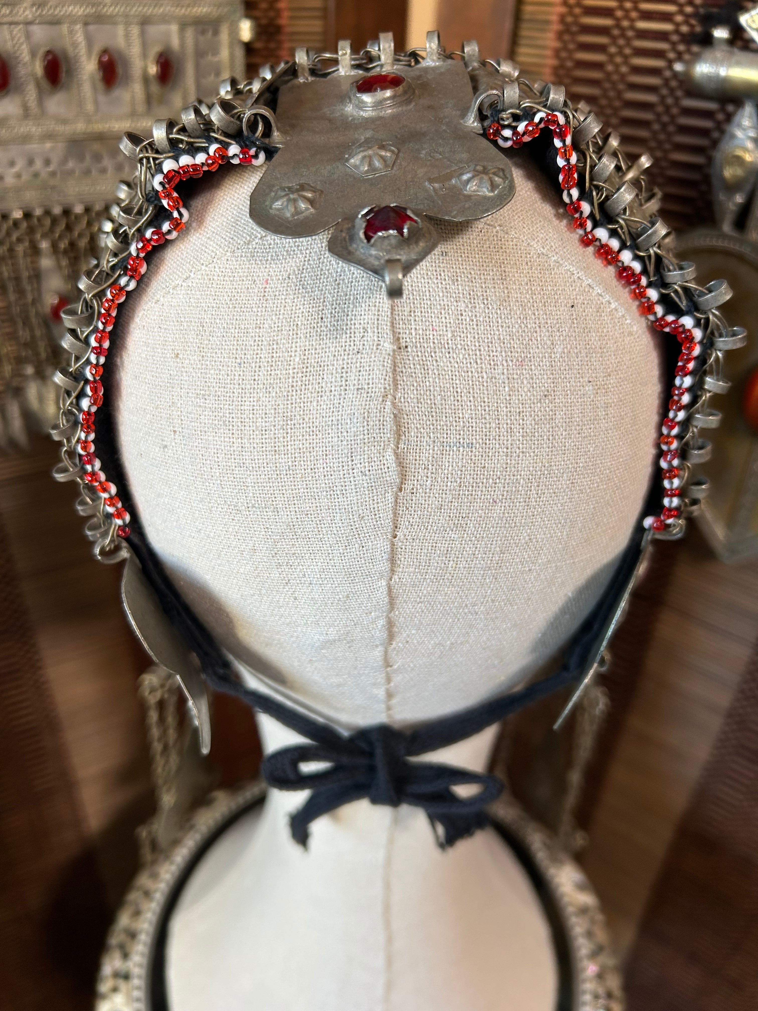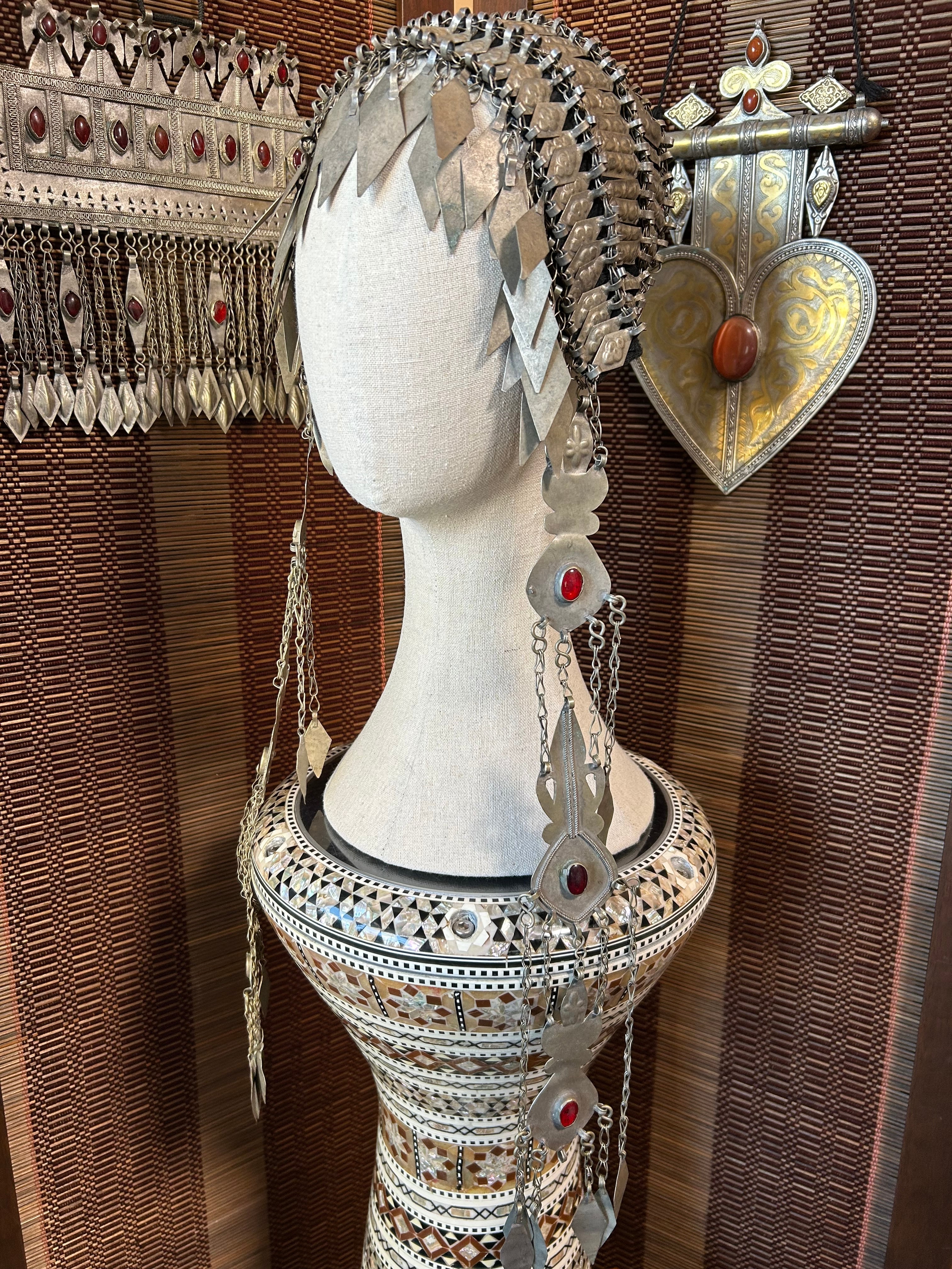 This Turkmen headdress is made in Afghanistan. Its decorative design around the face is very exotic. It's used in fusion and folklore styles, and more recently in FCBD. Feel free to remake it into a belt or choker.