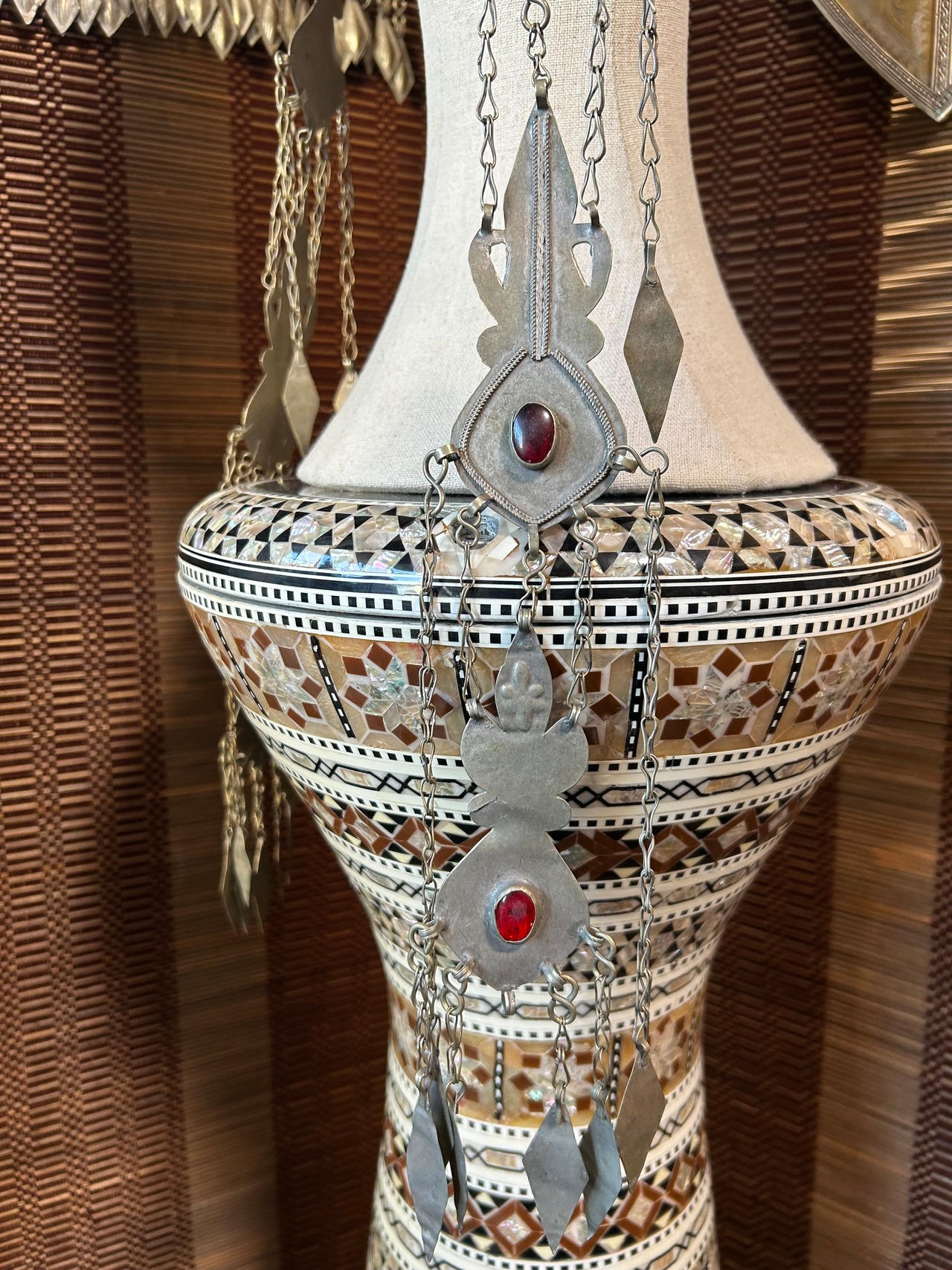 顔の周りを飾るデザインがとてもエキゾチックです。フュージョンやフォークロア、最近ではFCBDでも使われています。洗浄済み。裏布は新品です。
