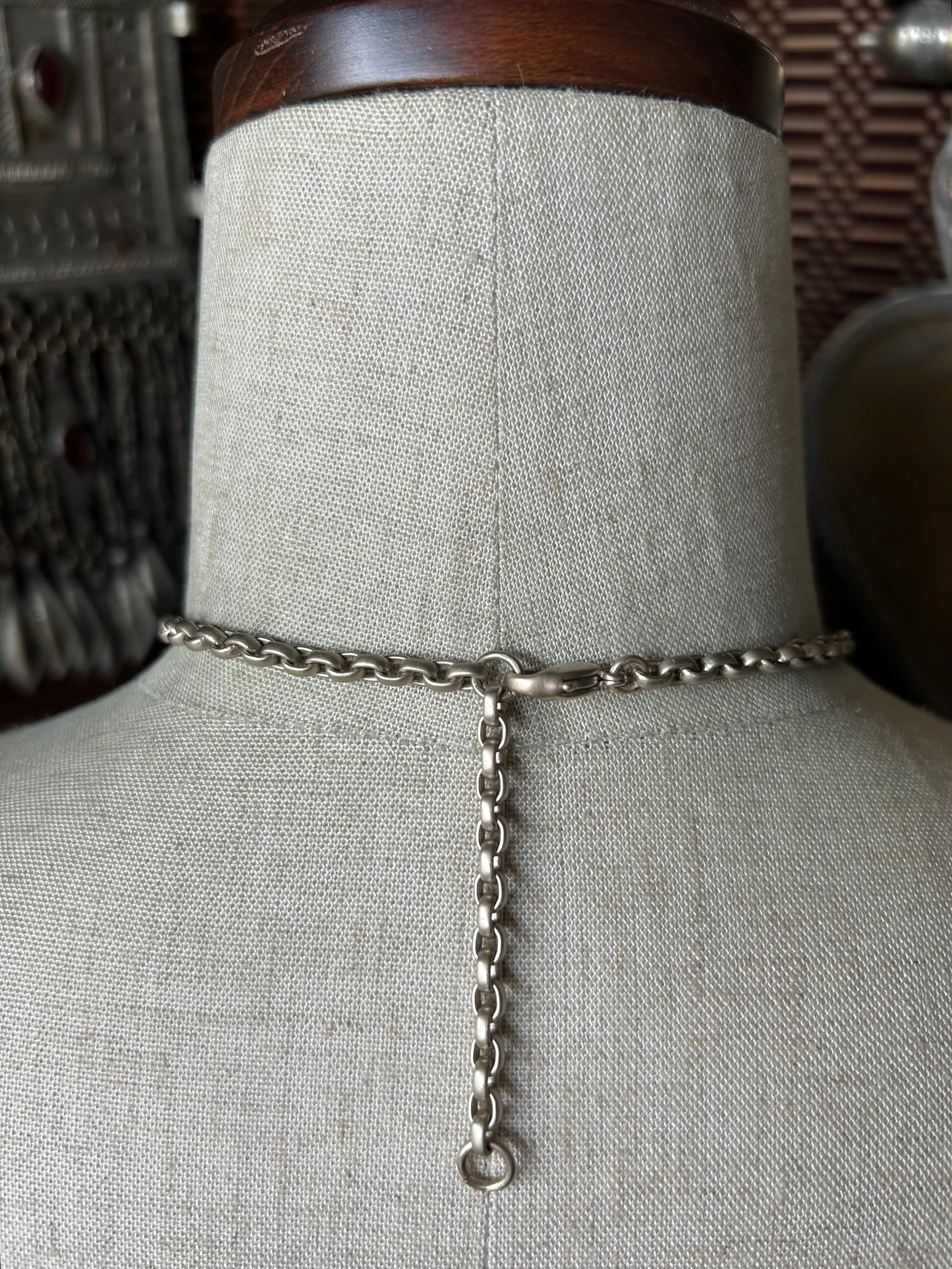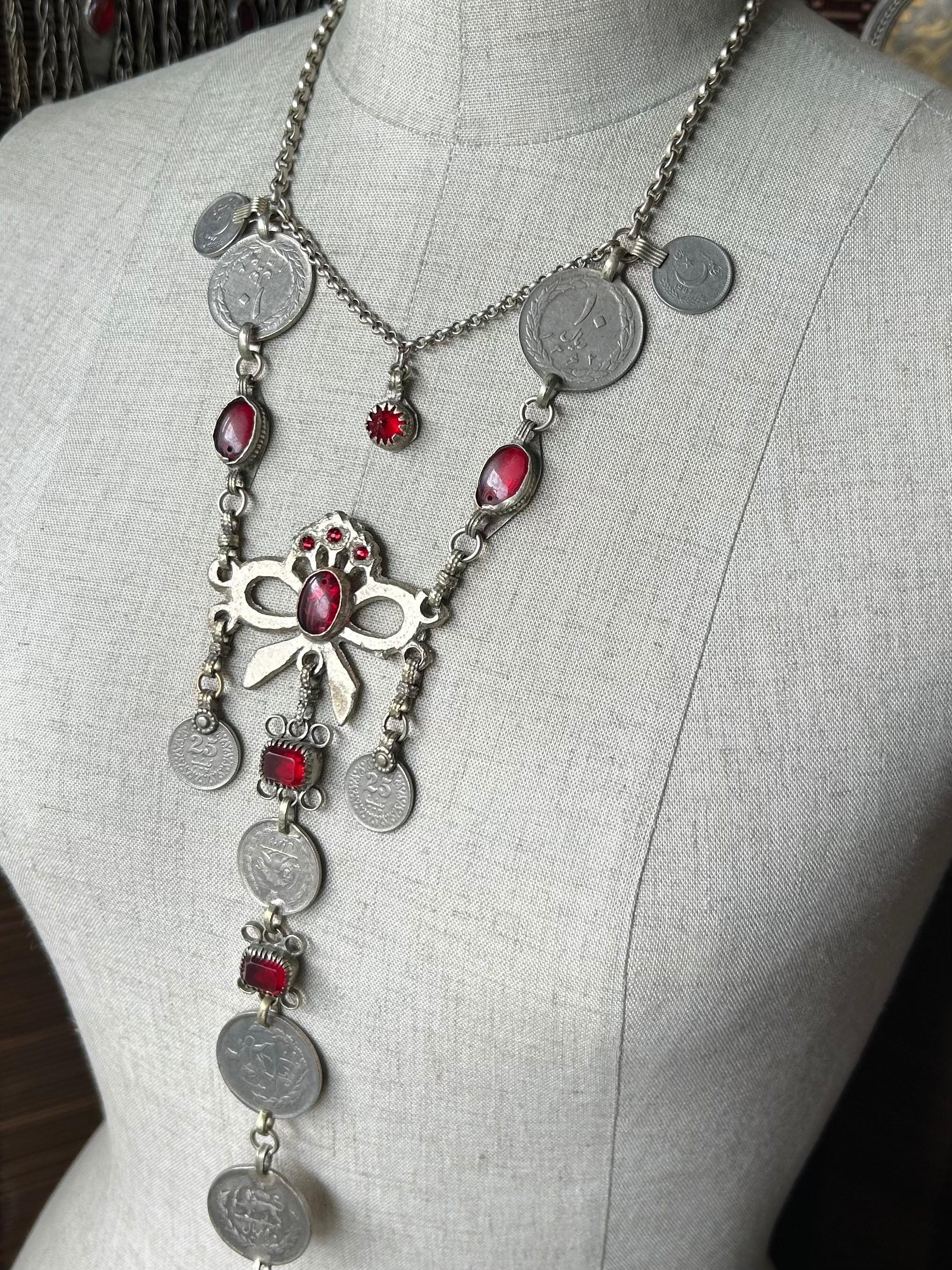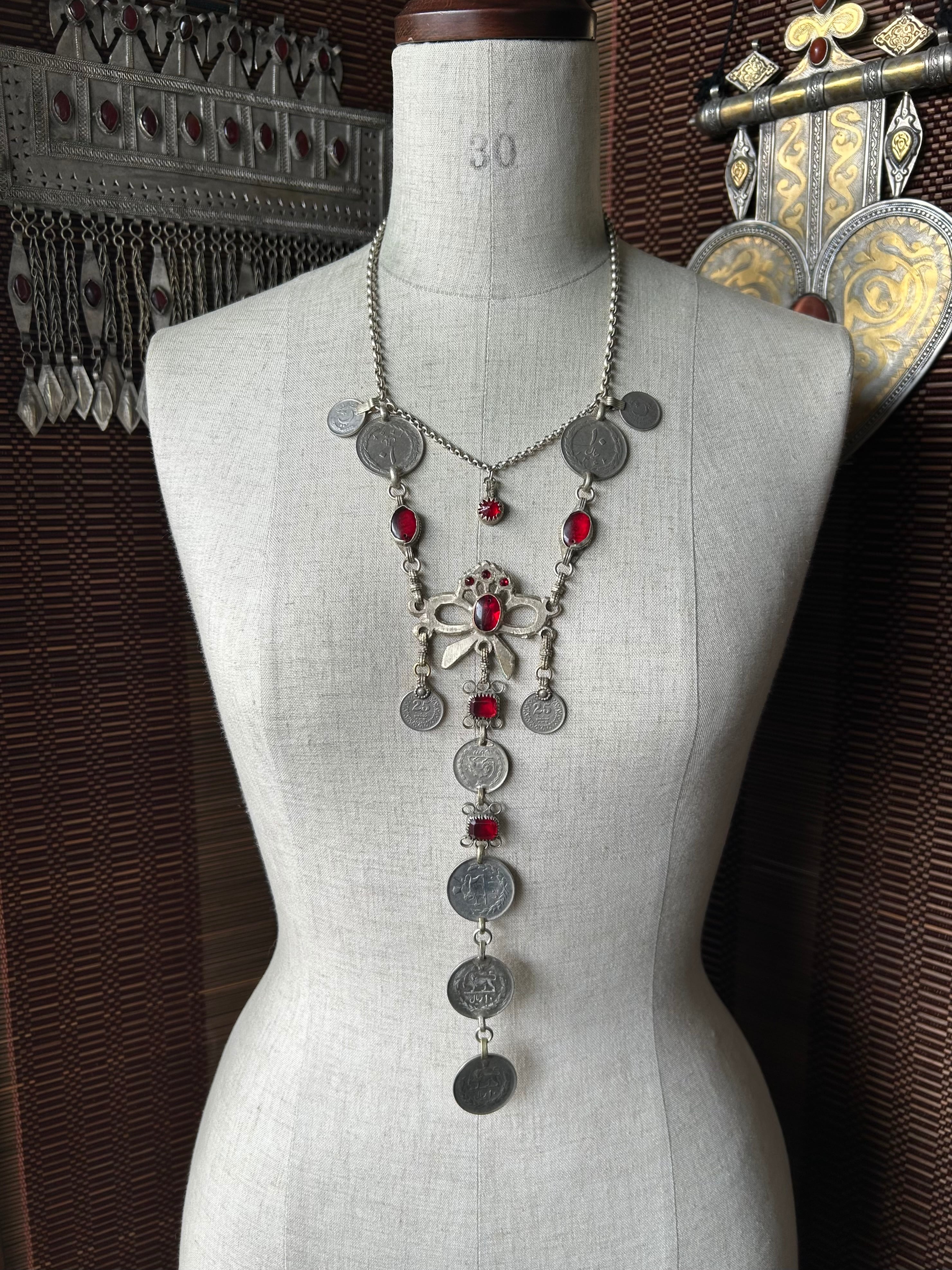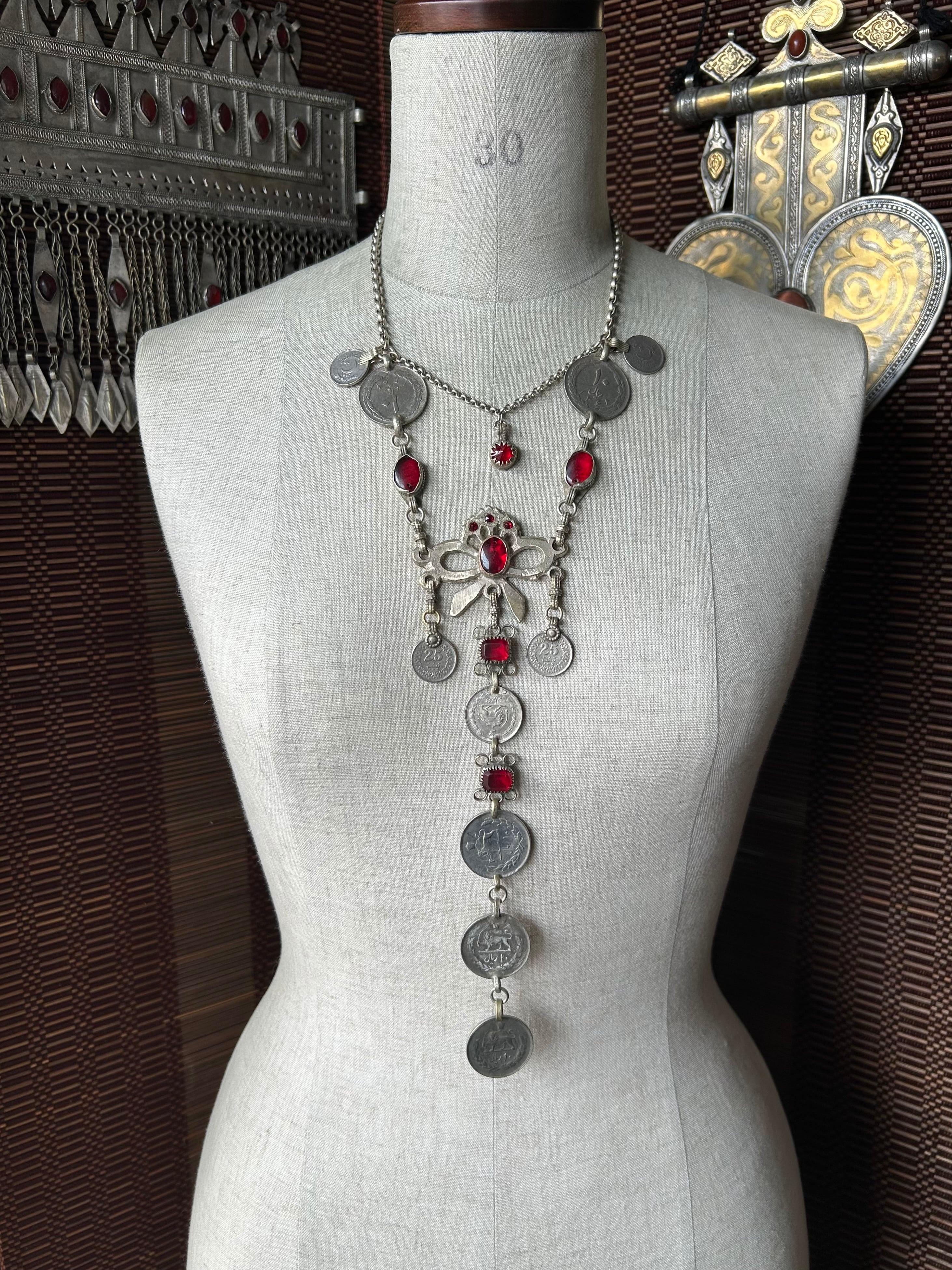 ヴィンテージパーツを使って組み上げたロングネックレス。赤い飾りが綺麗です。シンプルなな装いに合いそうですが、FCBDでブラに重ねても。アジャスターで少し伸ばせます。