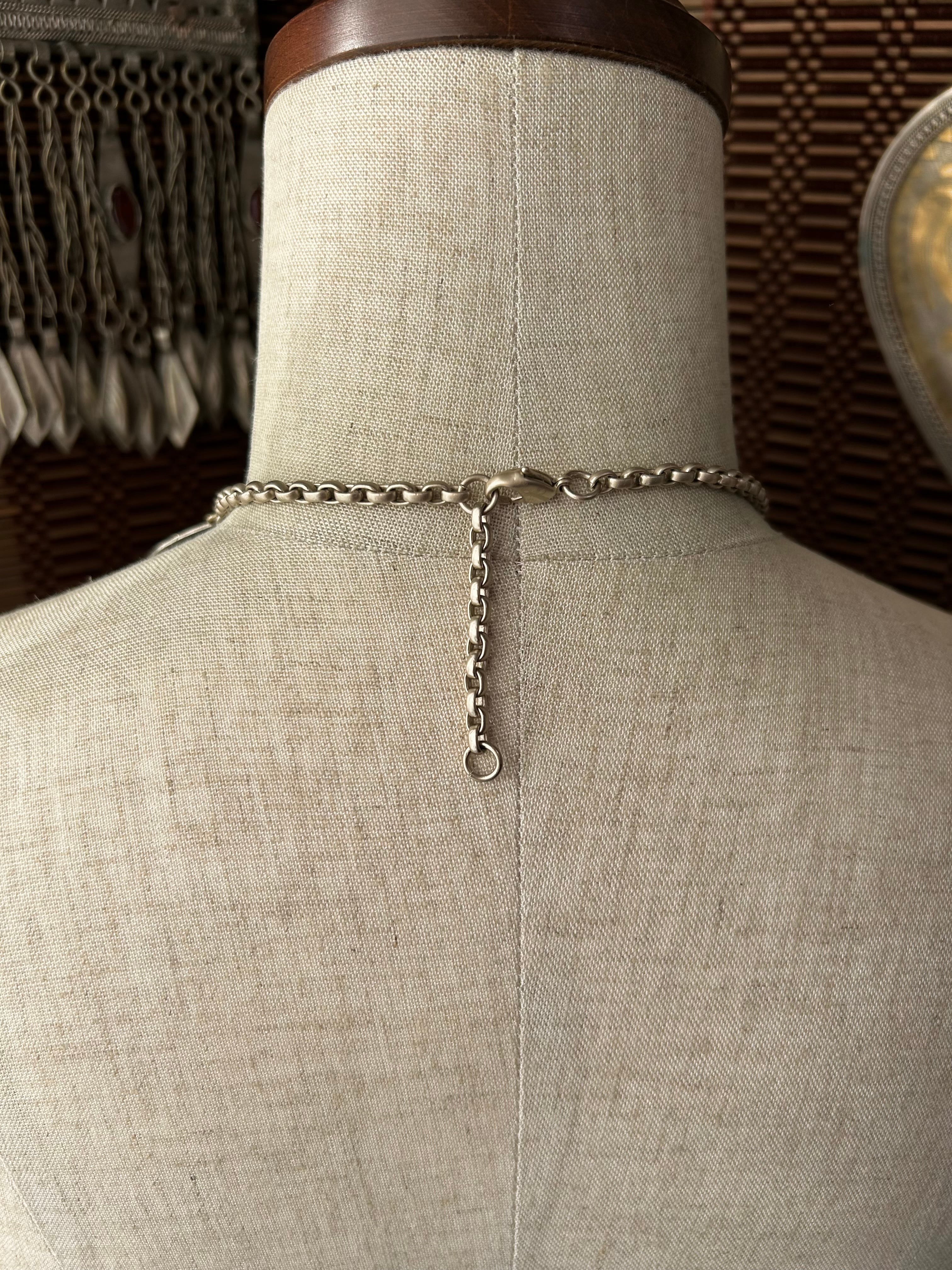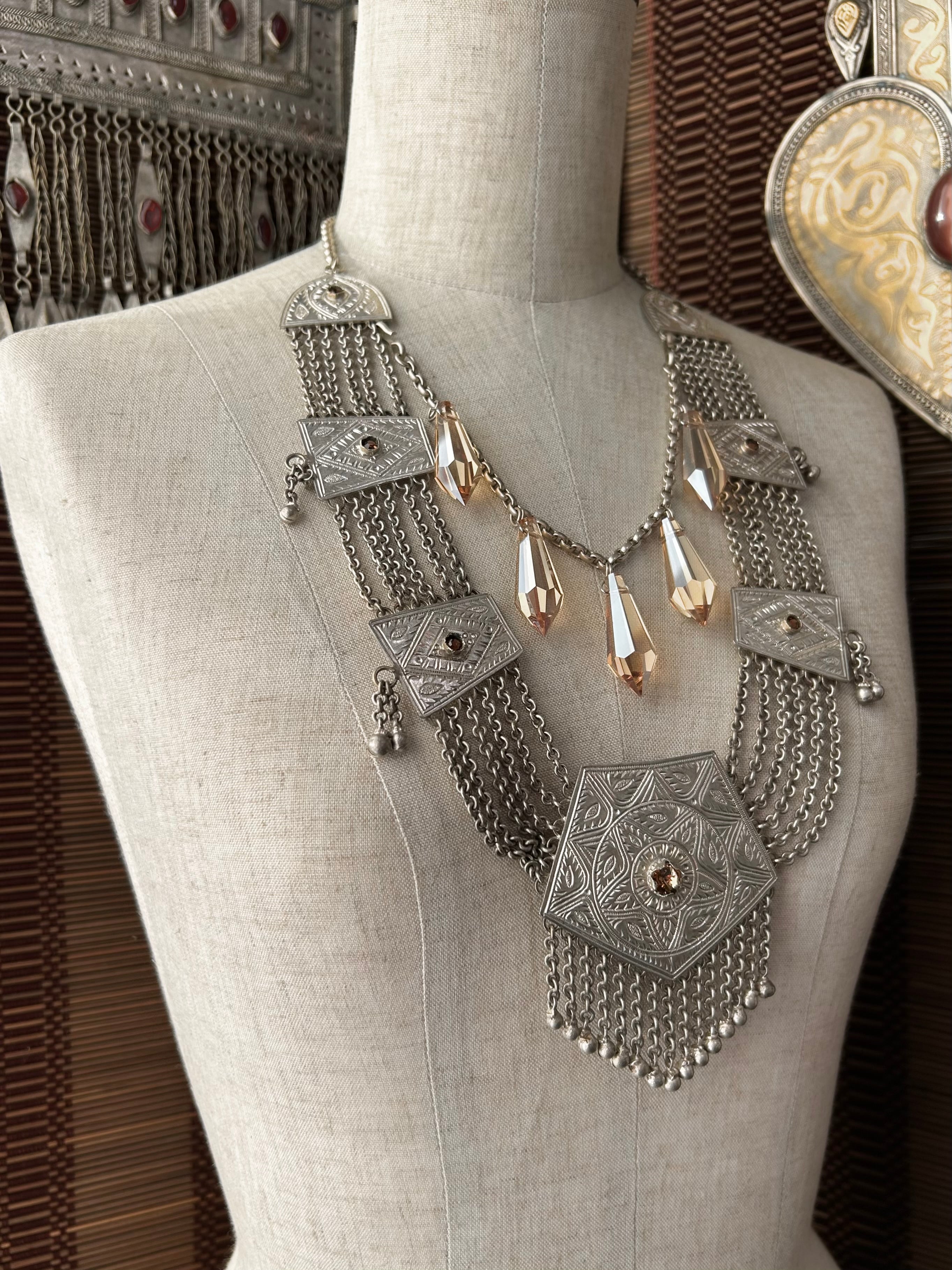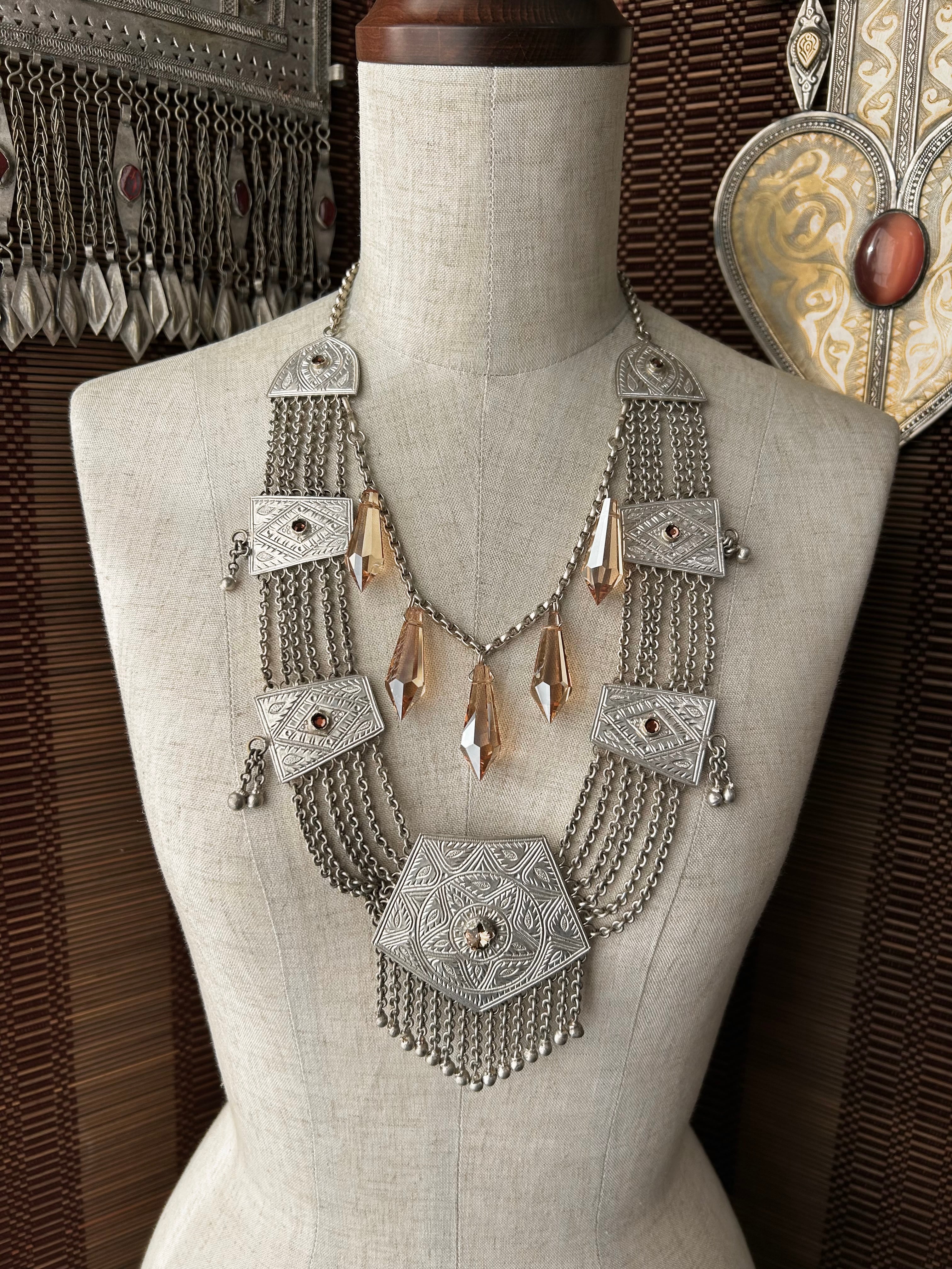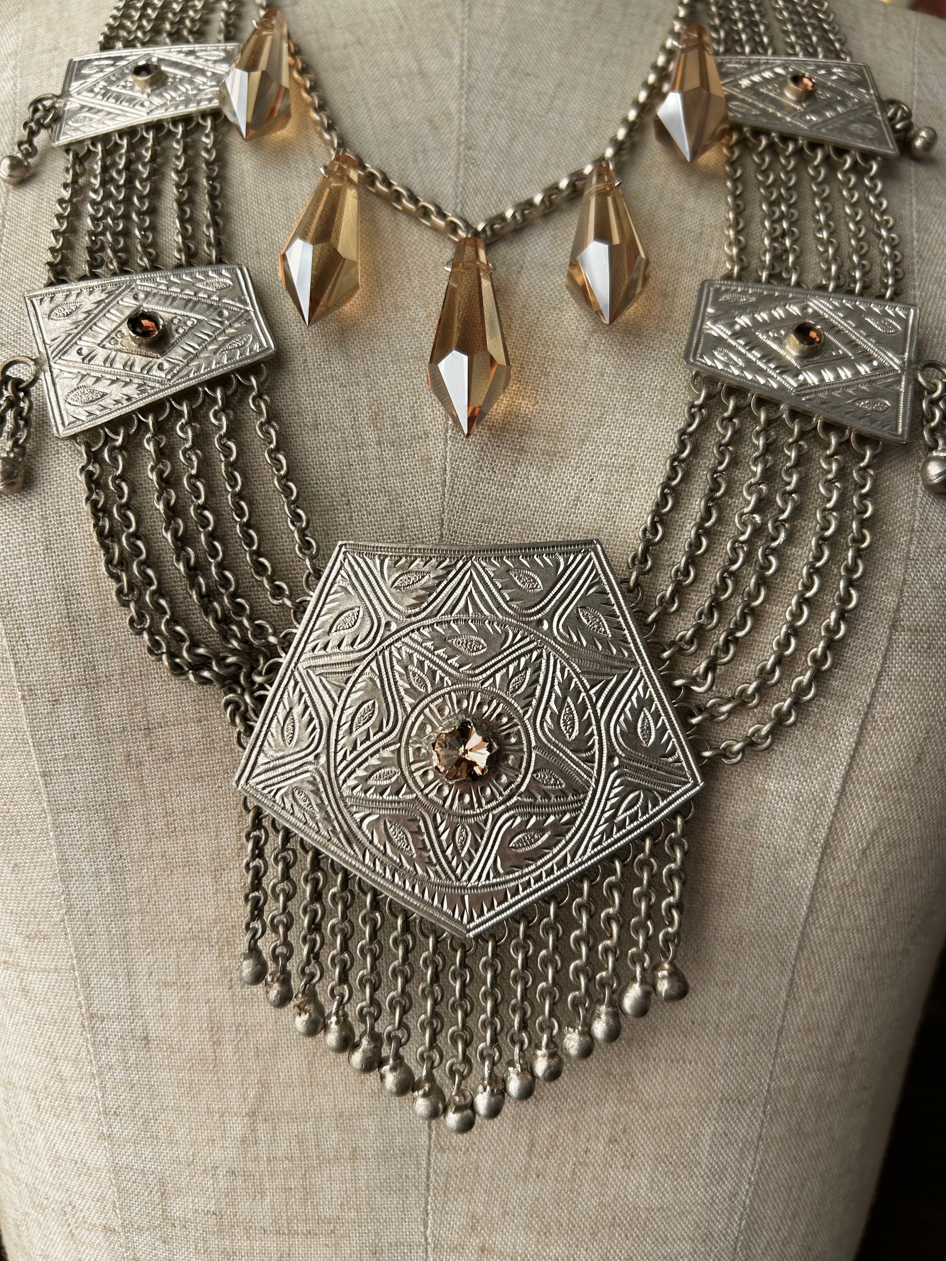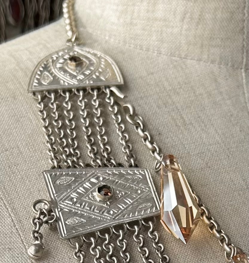 This is a fairly new item and has almost no tarnish. It's been given a glamorous look with Swarovski and crystal-like ornaments. The fourth image is the closest to the actual item.