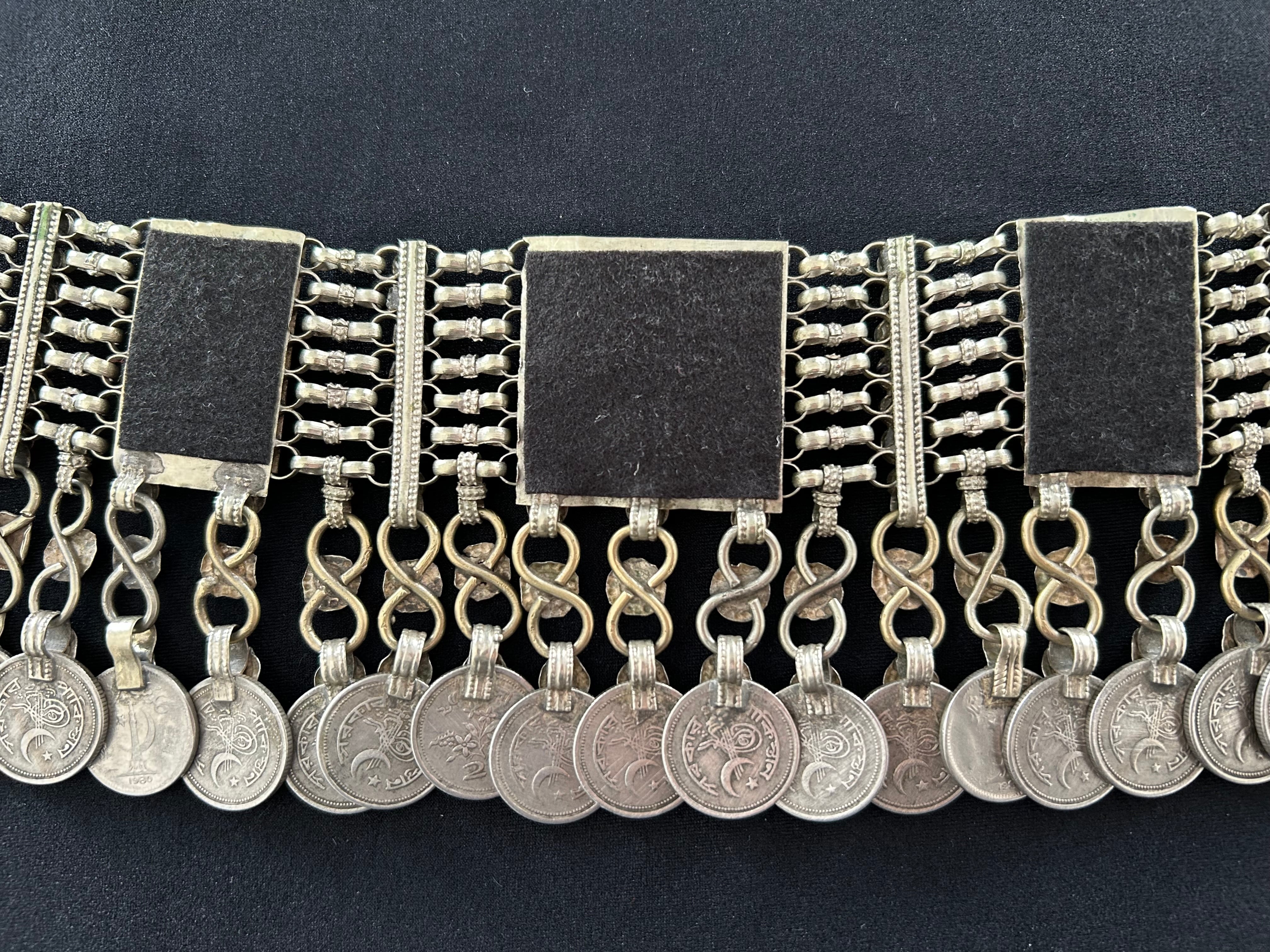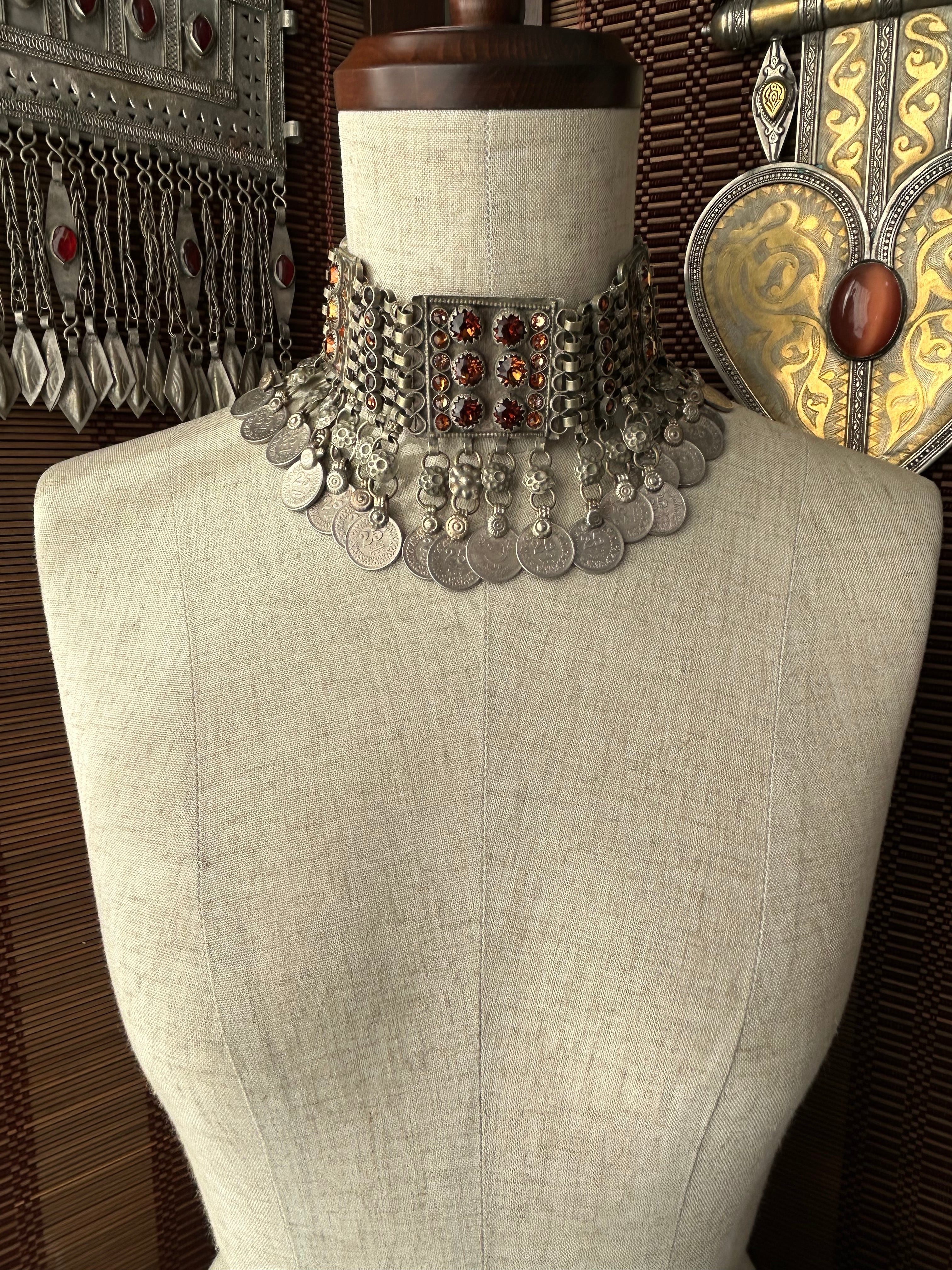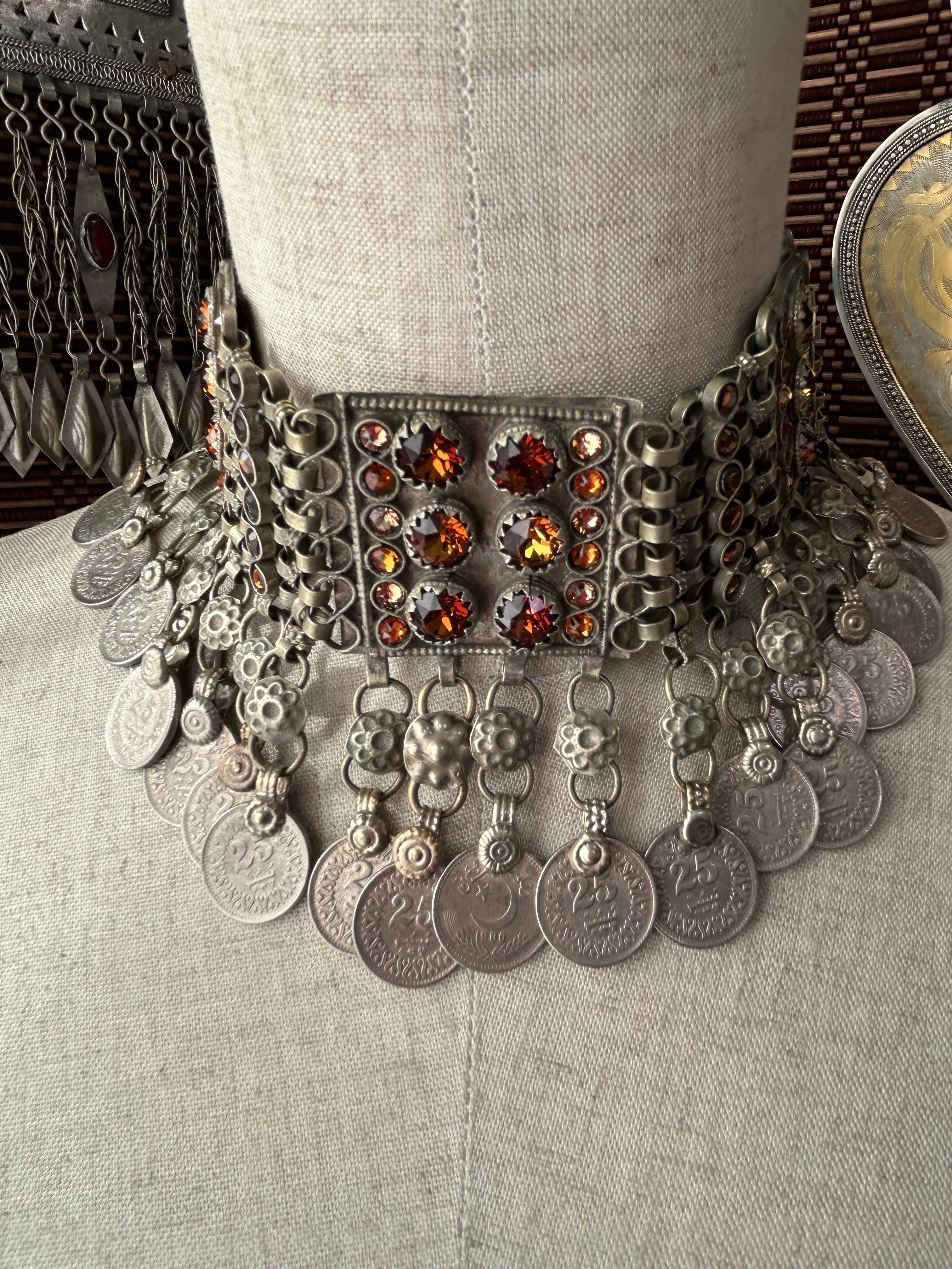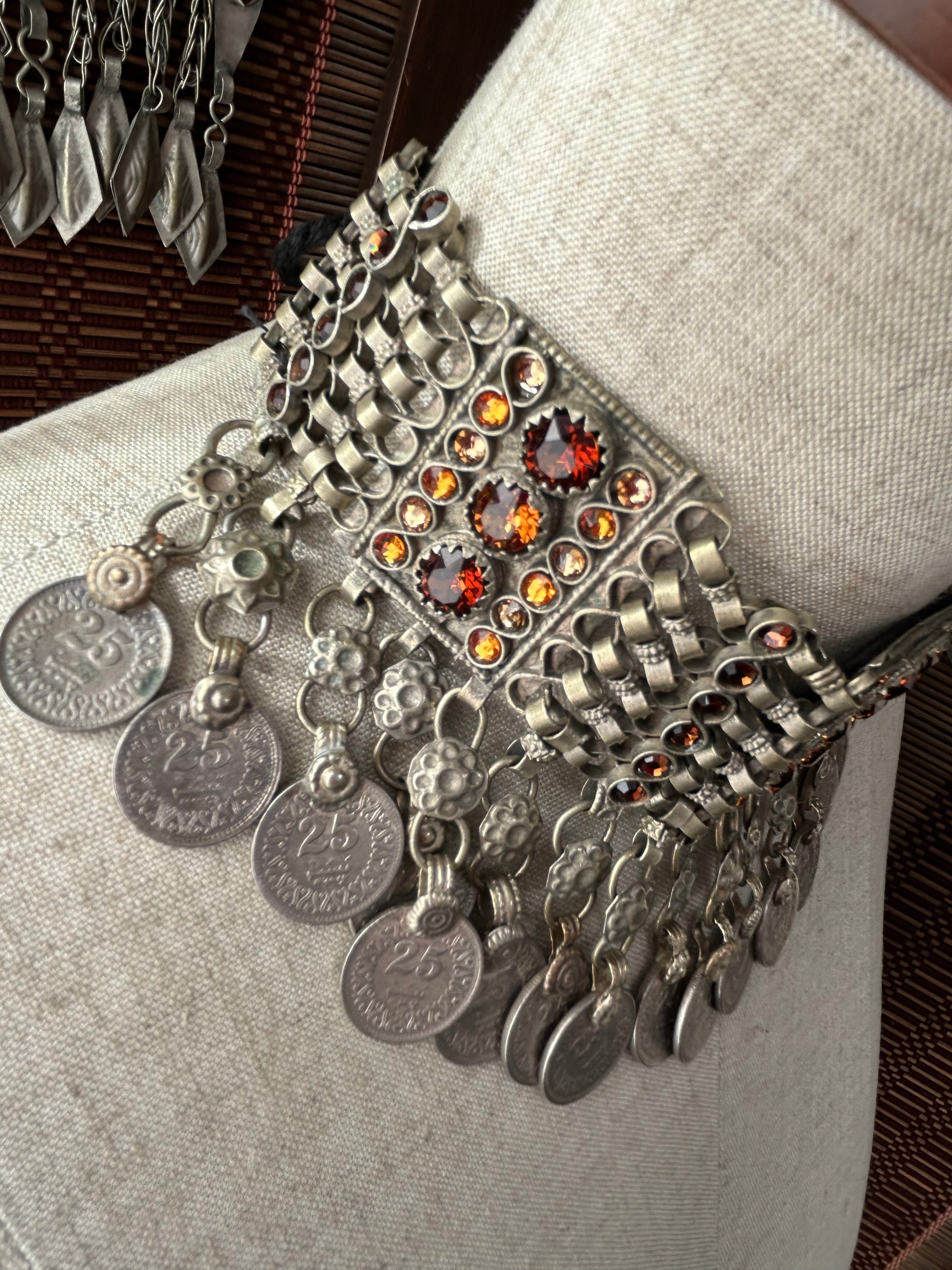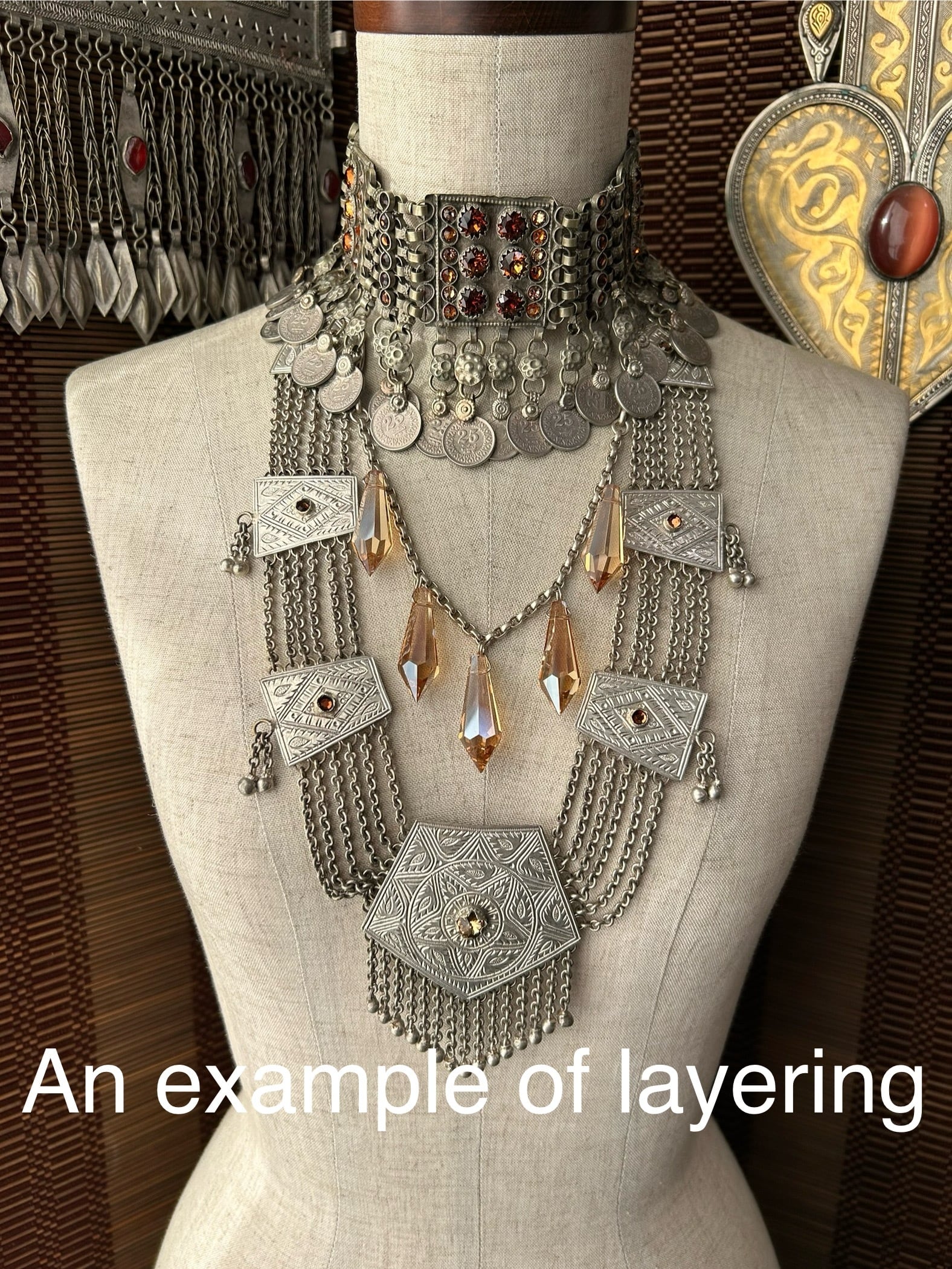 この形のチョーカーは、赤白のビーズ縁取りがされた黒い布が裏に付いていますが、白系のお衣装では合わないこともあるため除去しました。代わりに琥珀シリーズ全ての裏側にフェルトを貼っています。