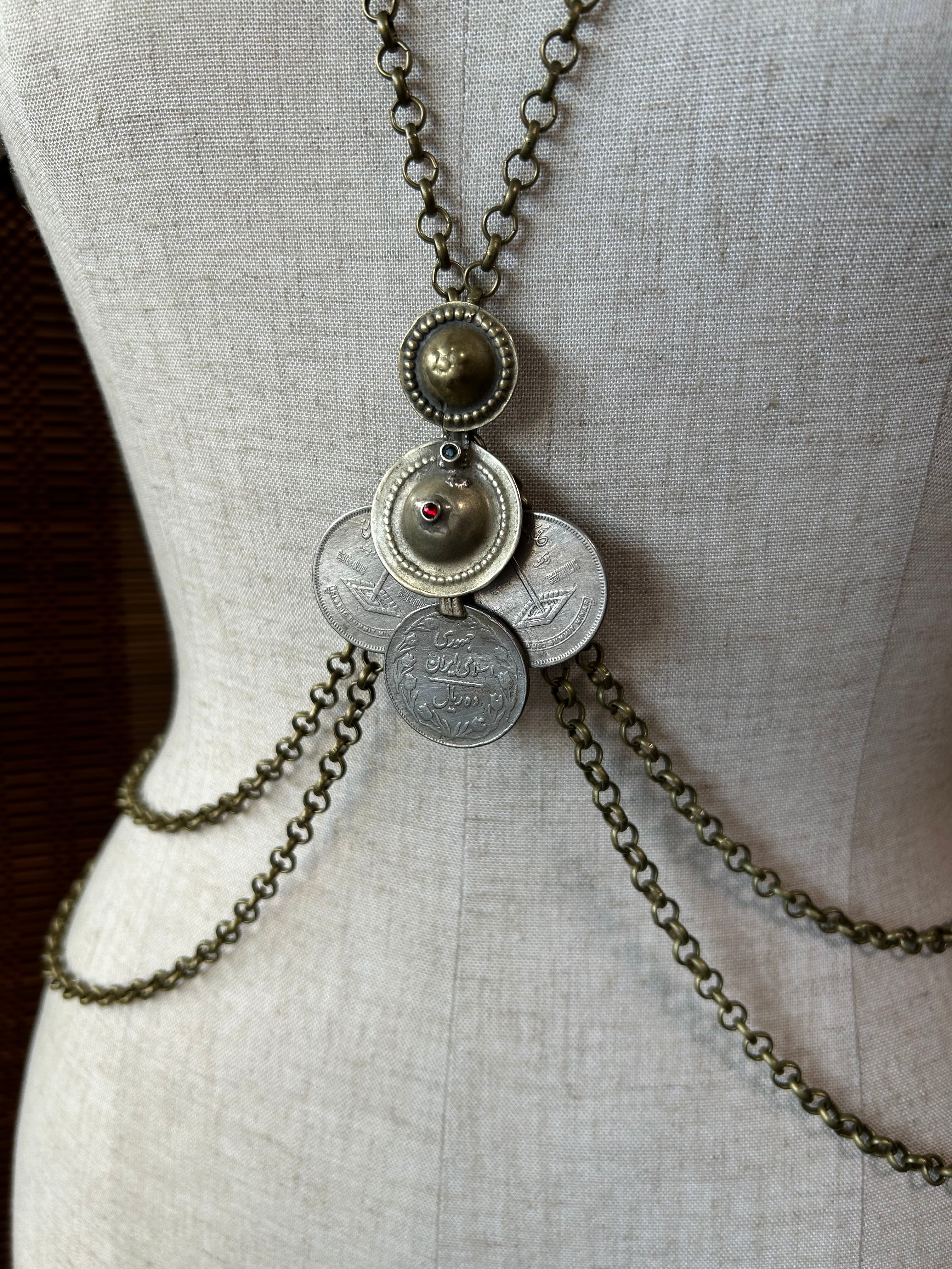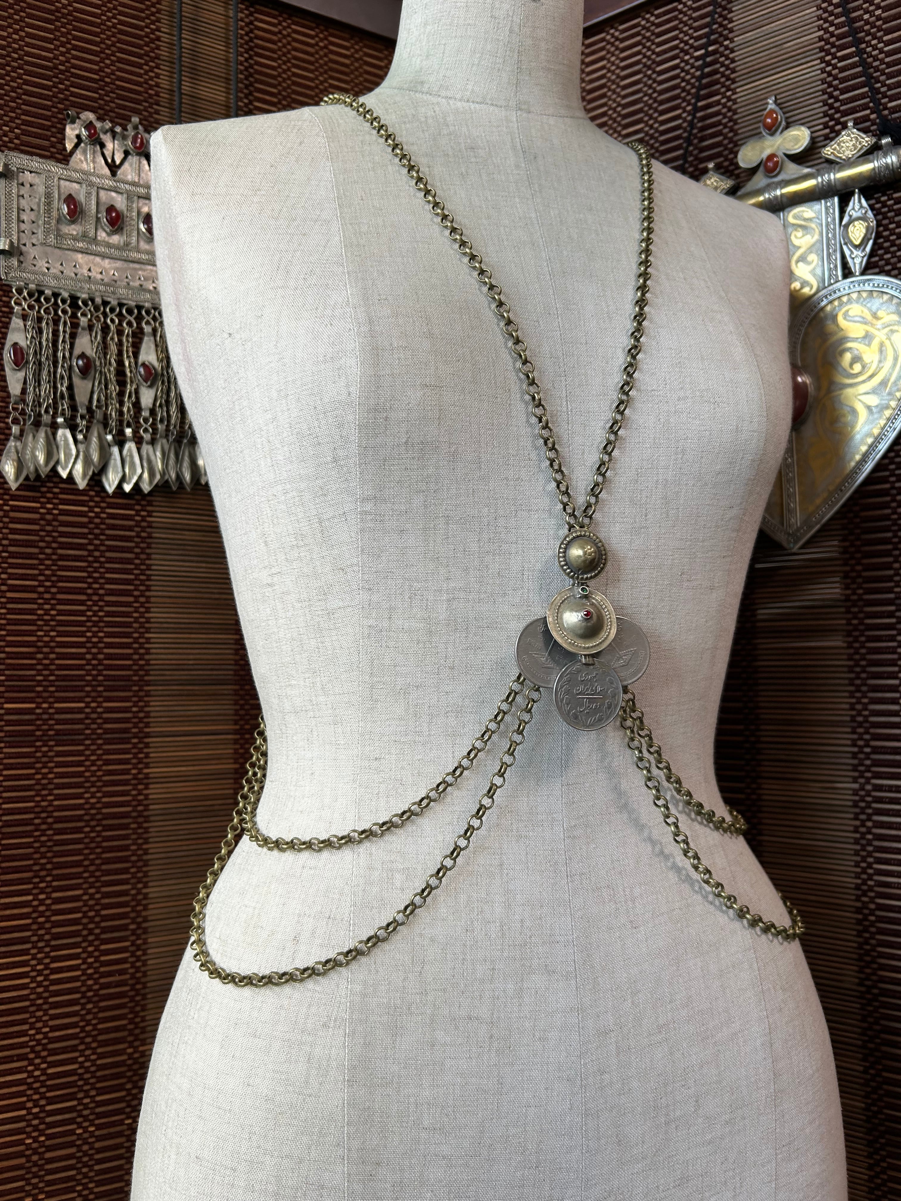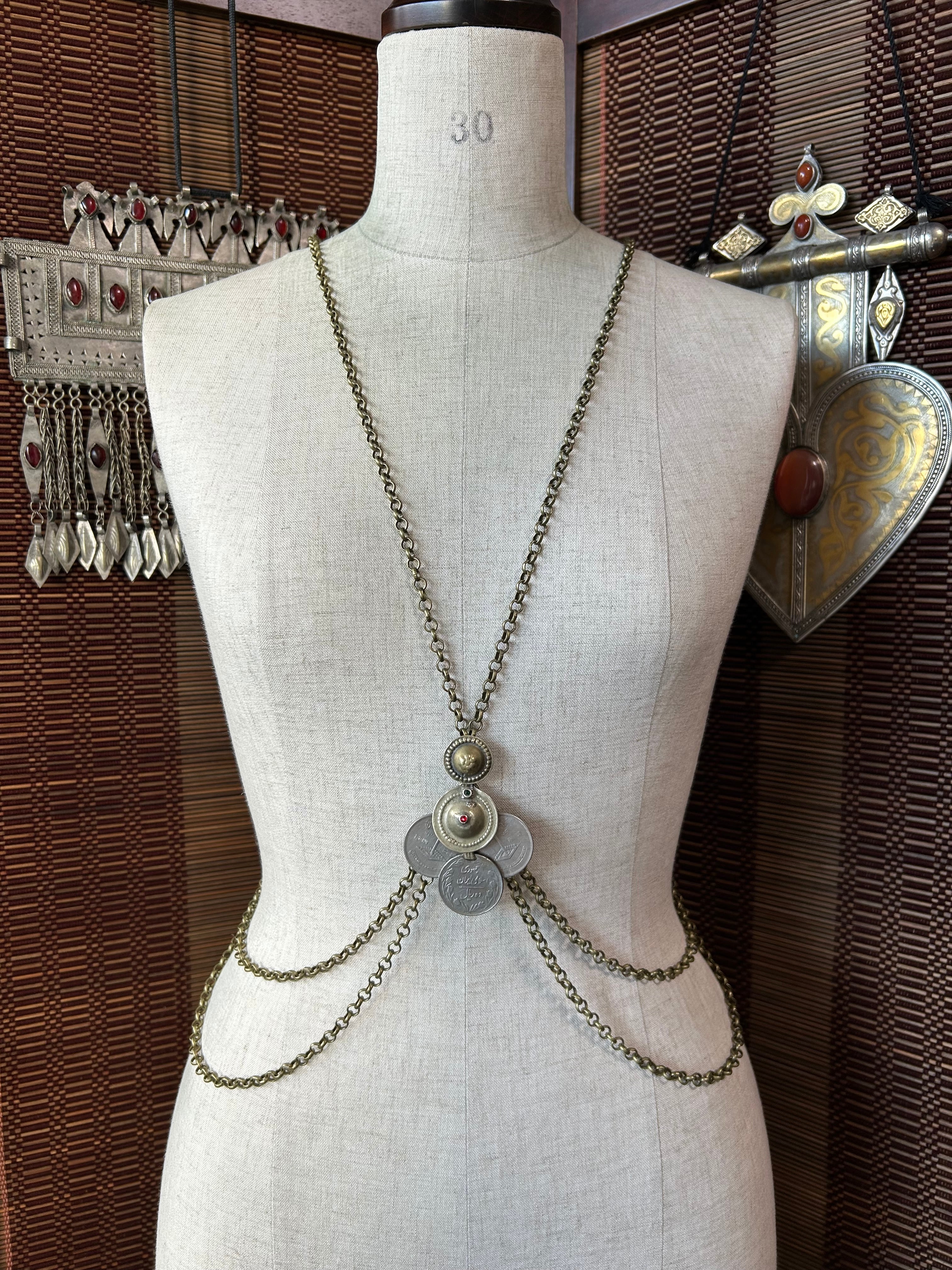 A simple design that can be used in many different ways. The chain is antique bronze in color. The main ornament is placed below the bust. The chain is slightly short to add a touch of elegance to the area below the bust, so you can easily create fades and spins. The neckline is wide enough to wear even after creating a hair garden.