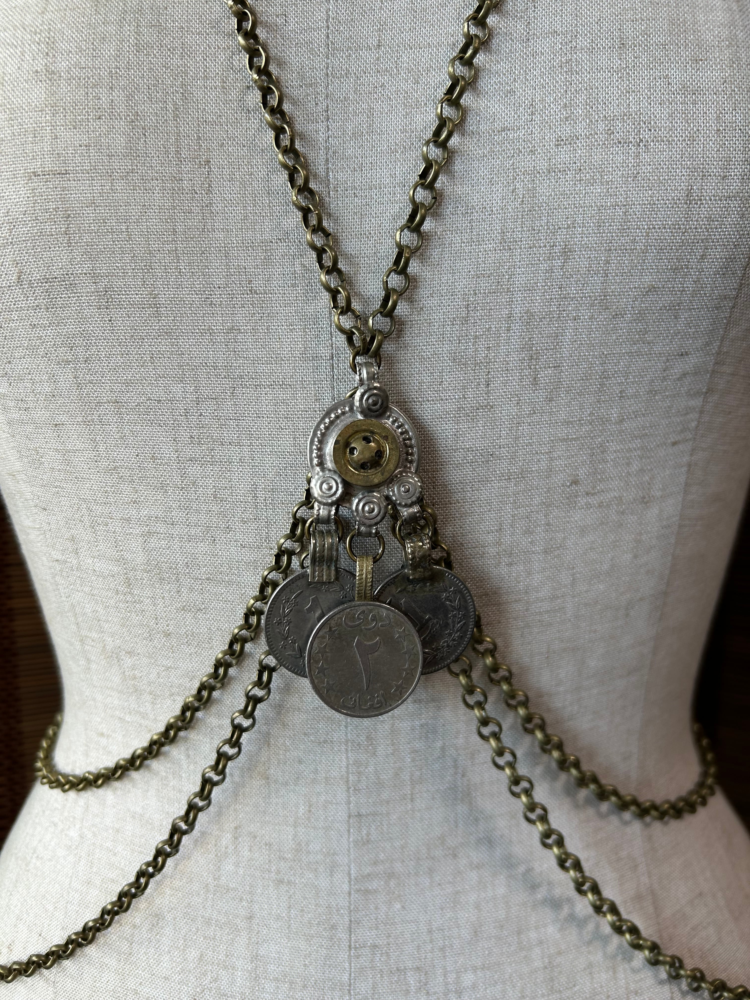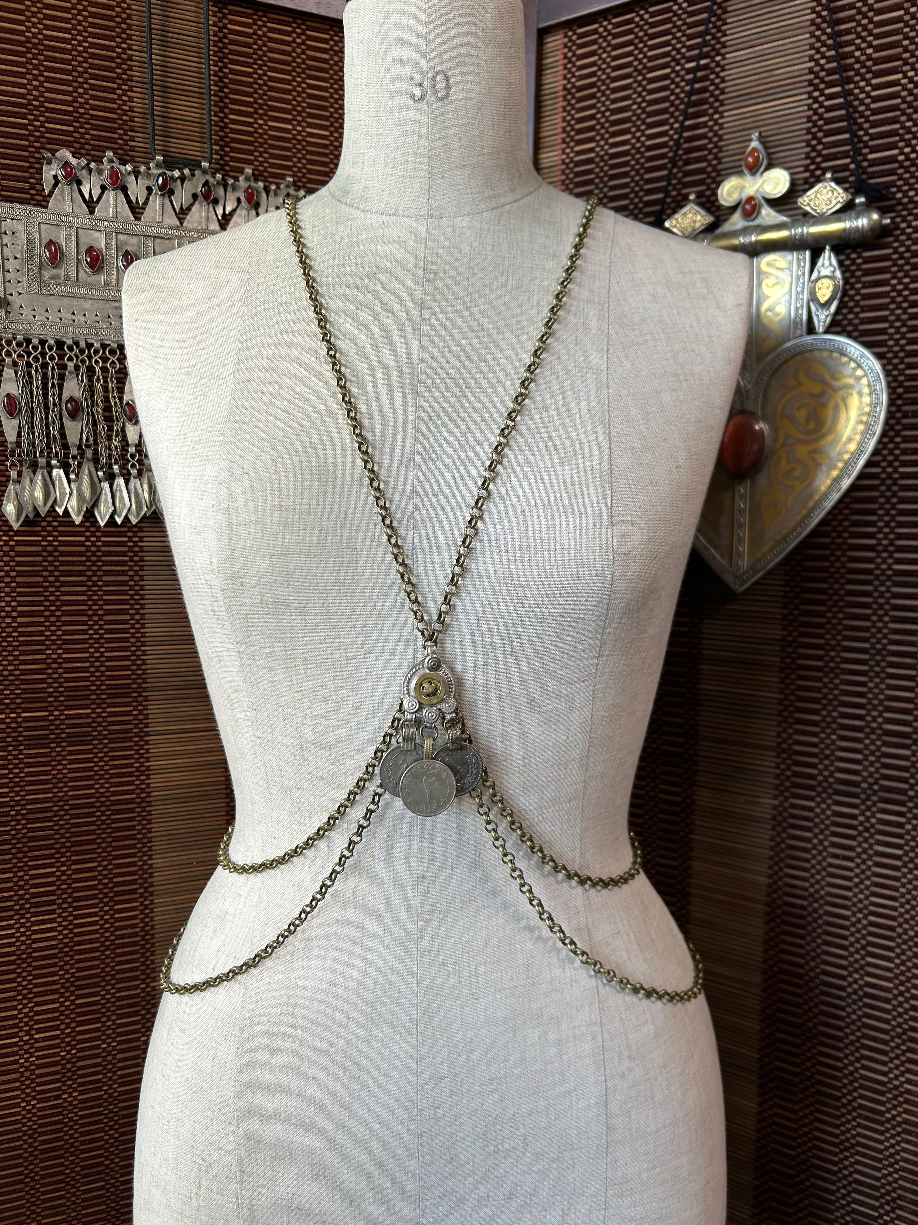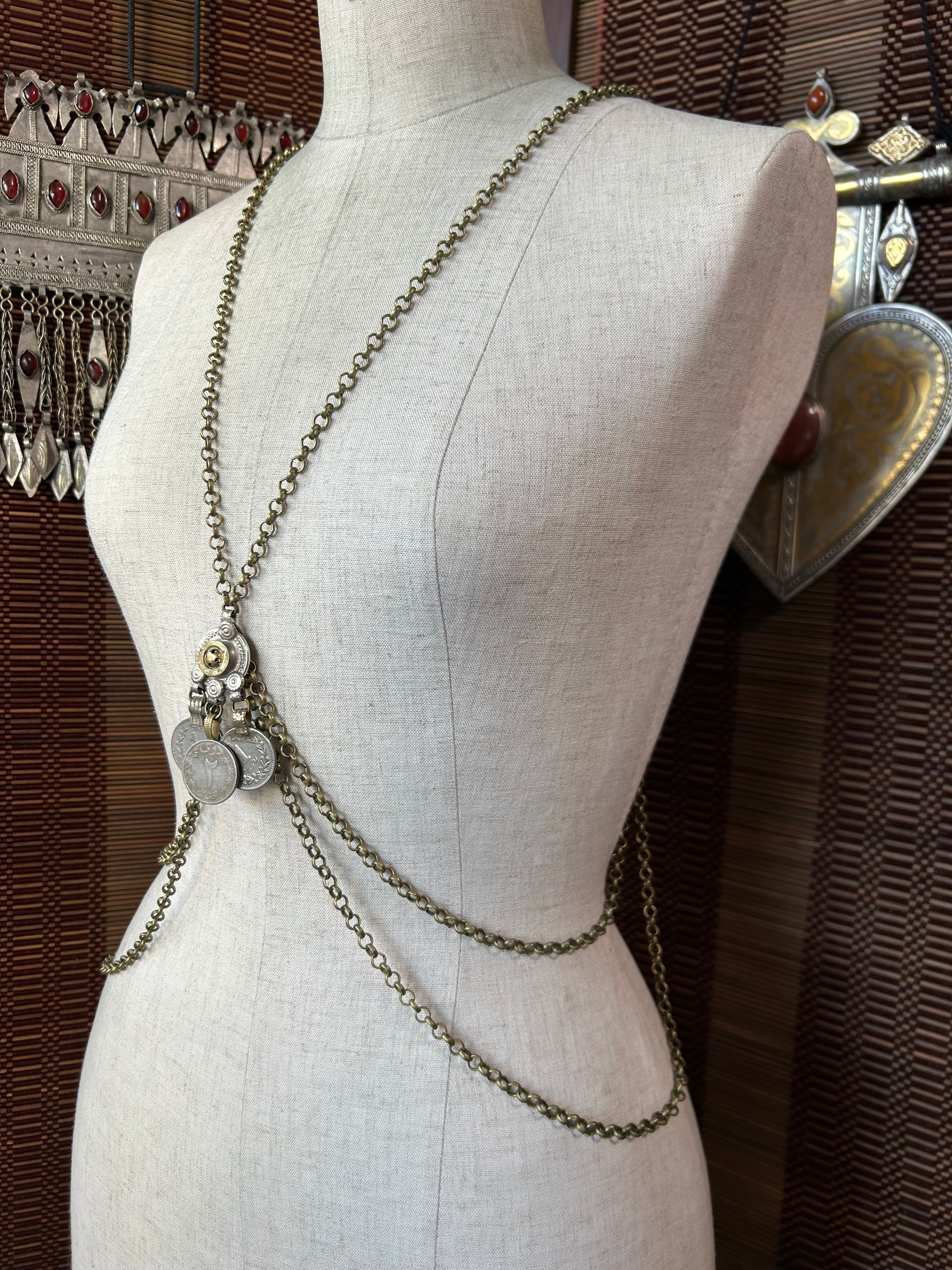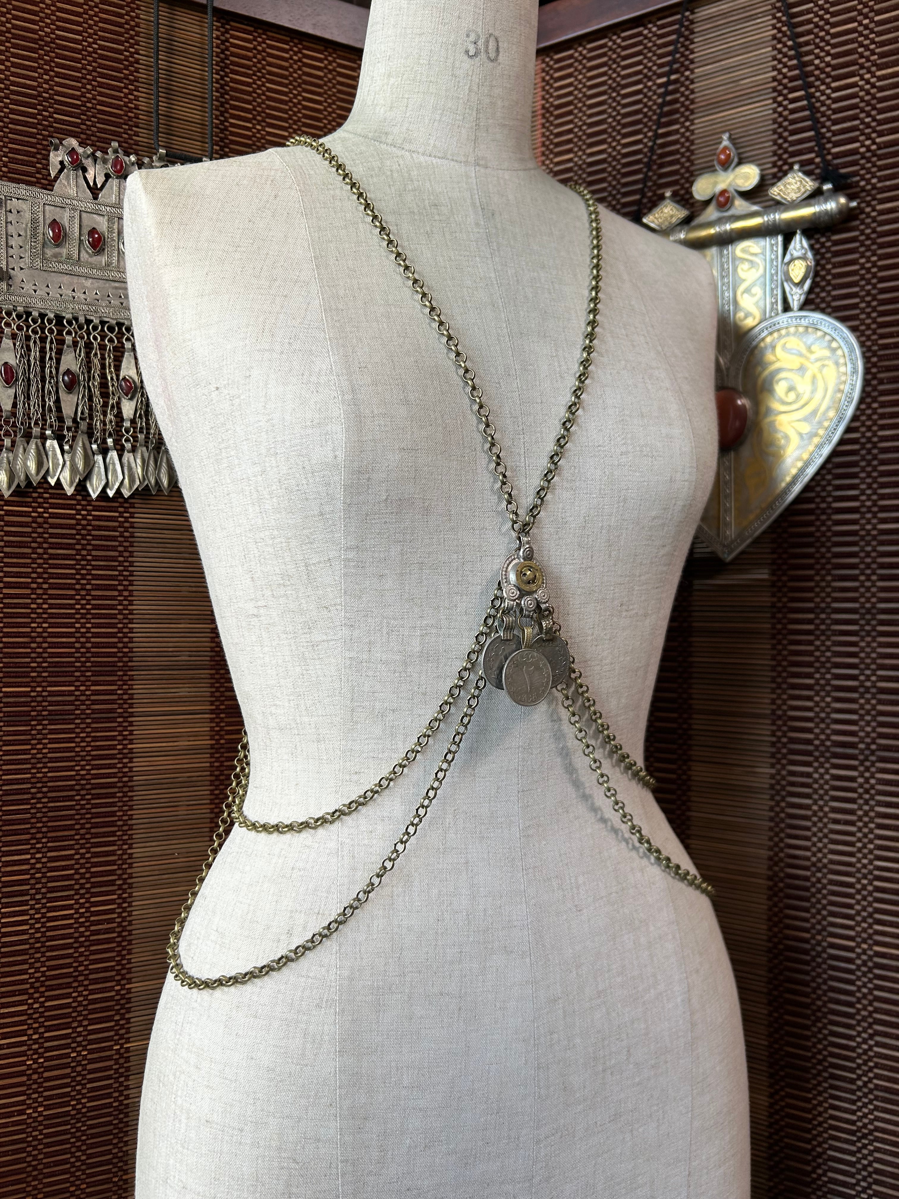 A simple design that can be used in many different ways. The chain is antique bronze in color. The main ornament is placed below the bust. The chain is slightly short to add a touch of elegance to the area below the bust, so you can easily create fades and spins. The neckline is wide enough to wear even after creating a hair garden.