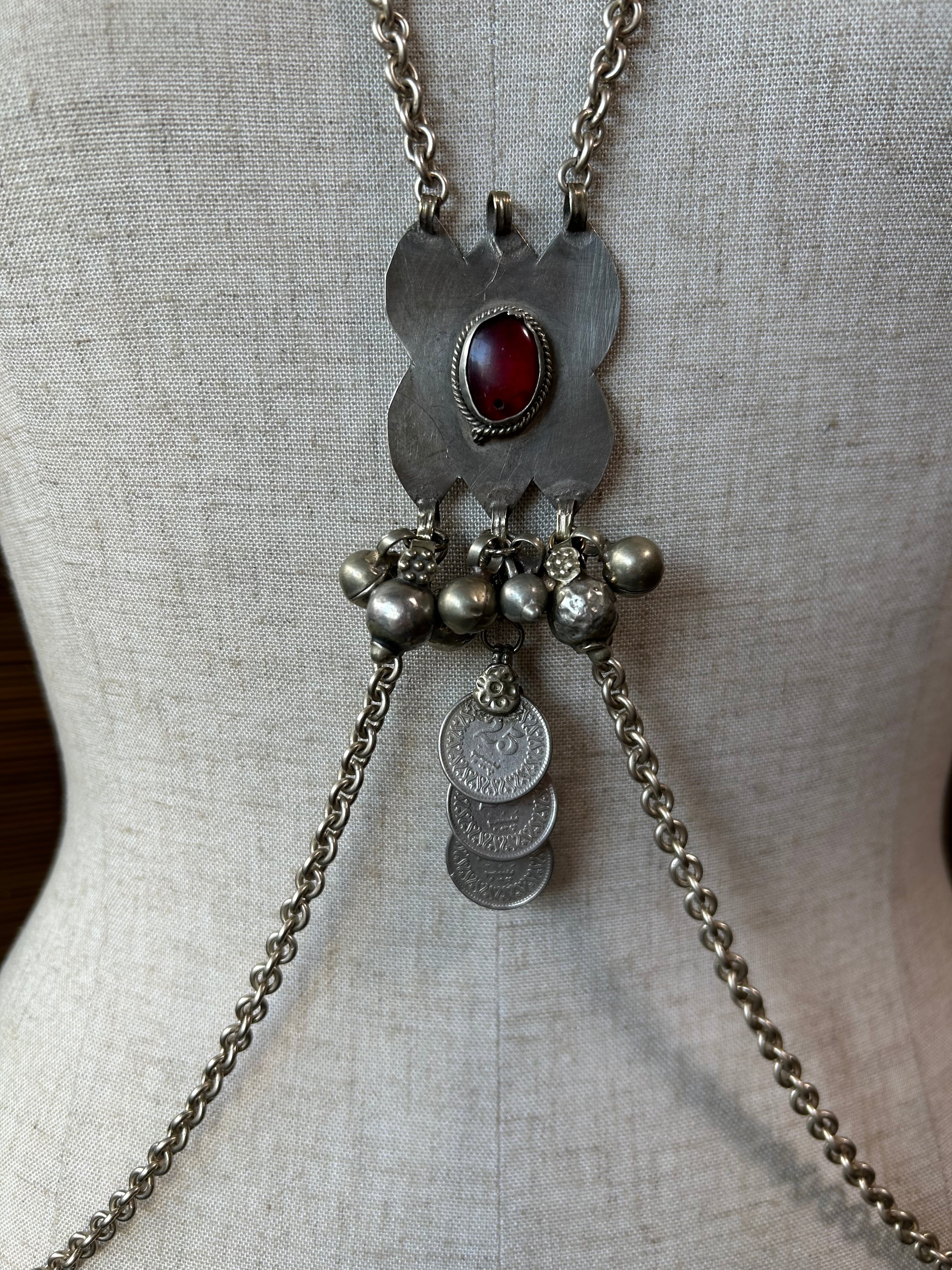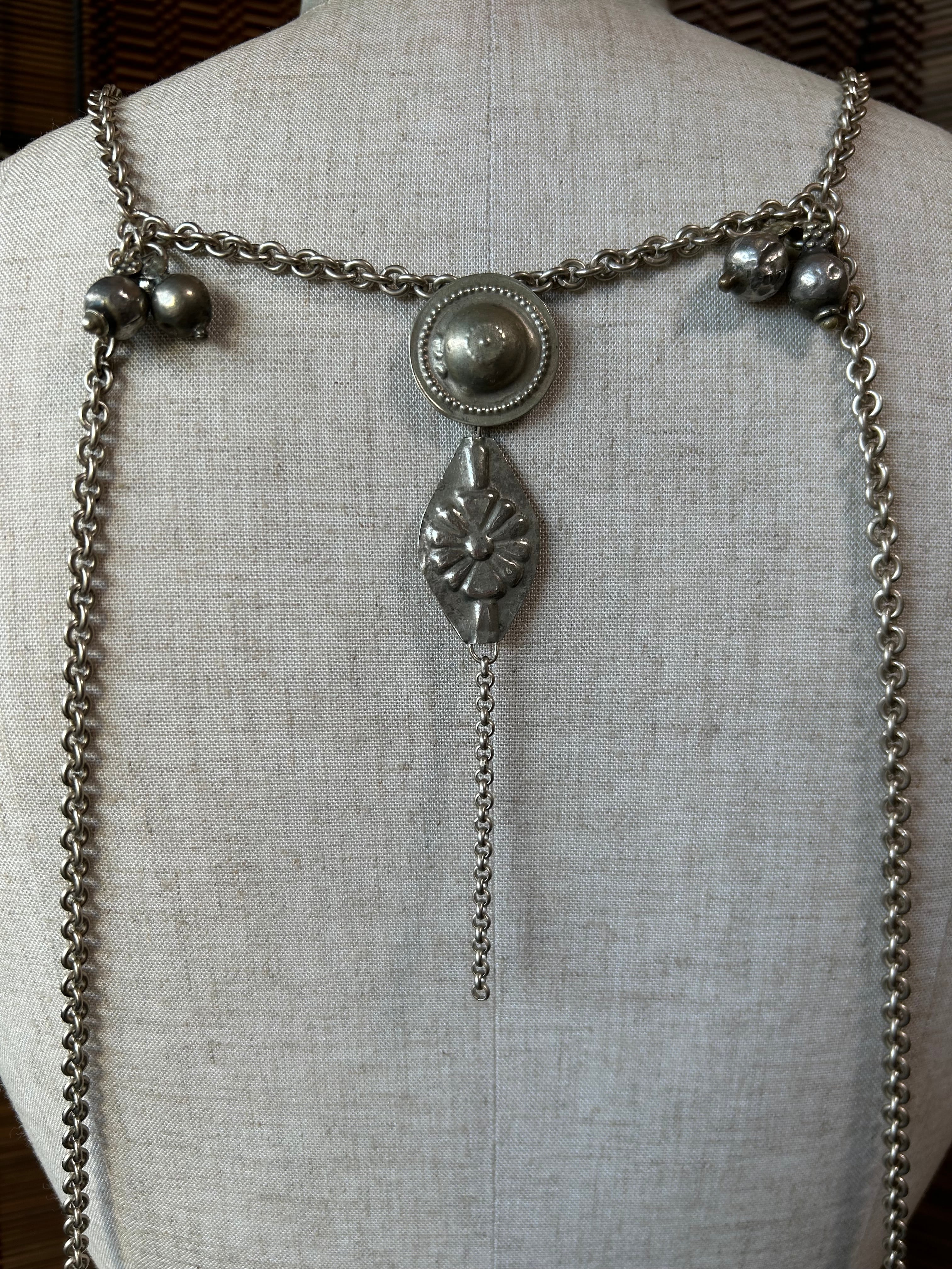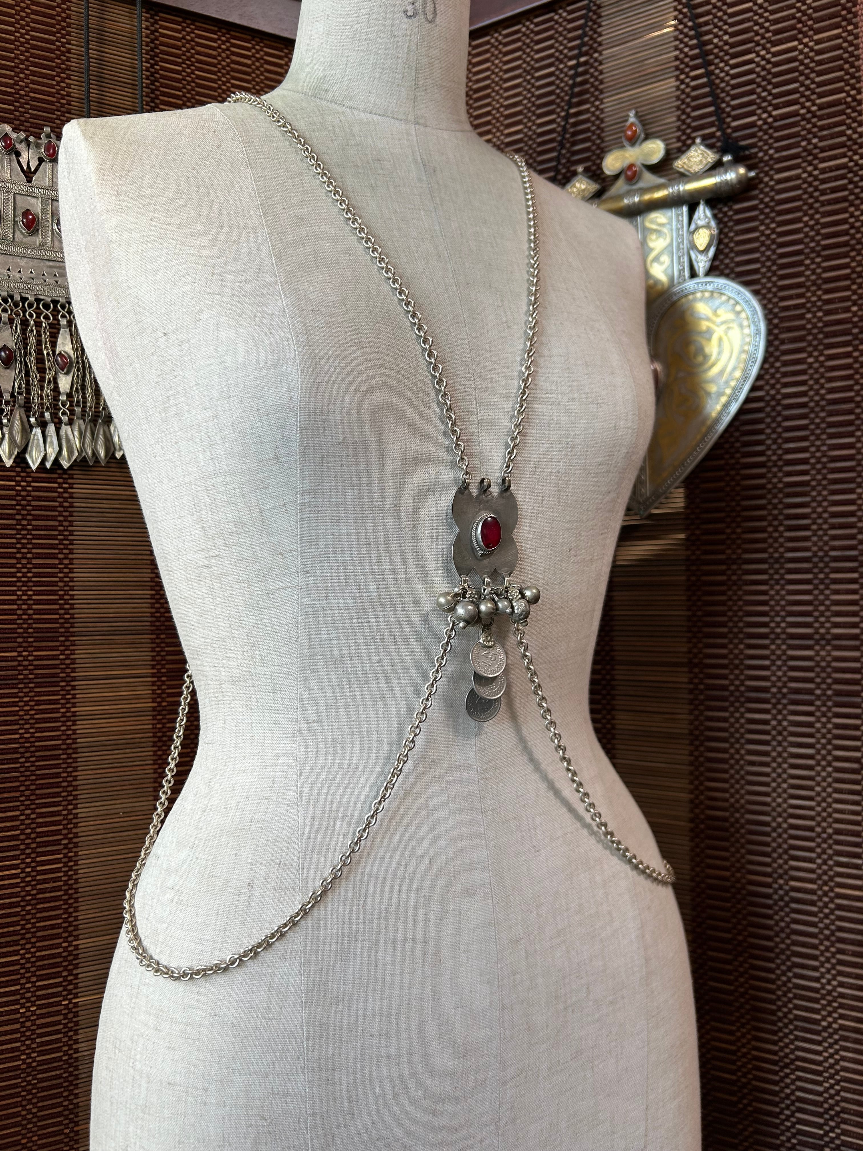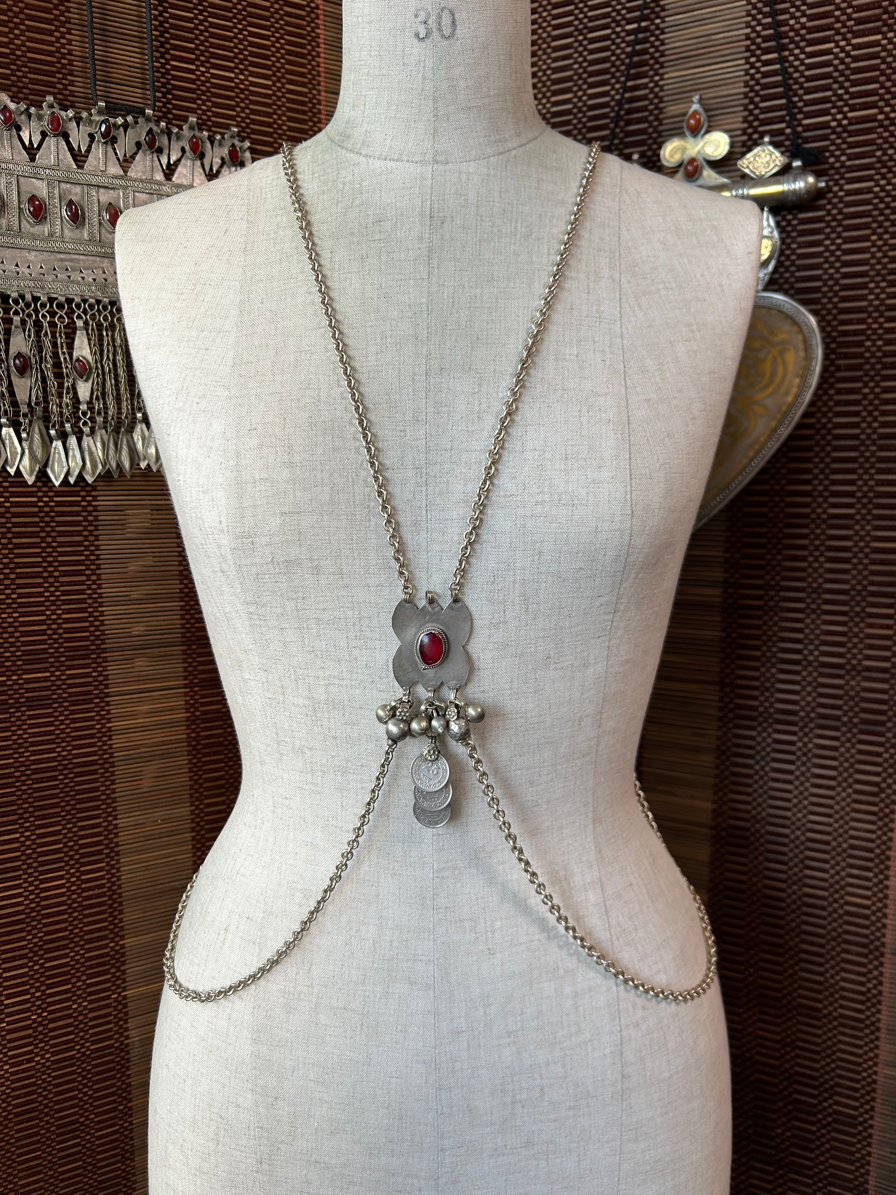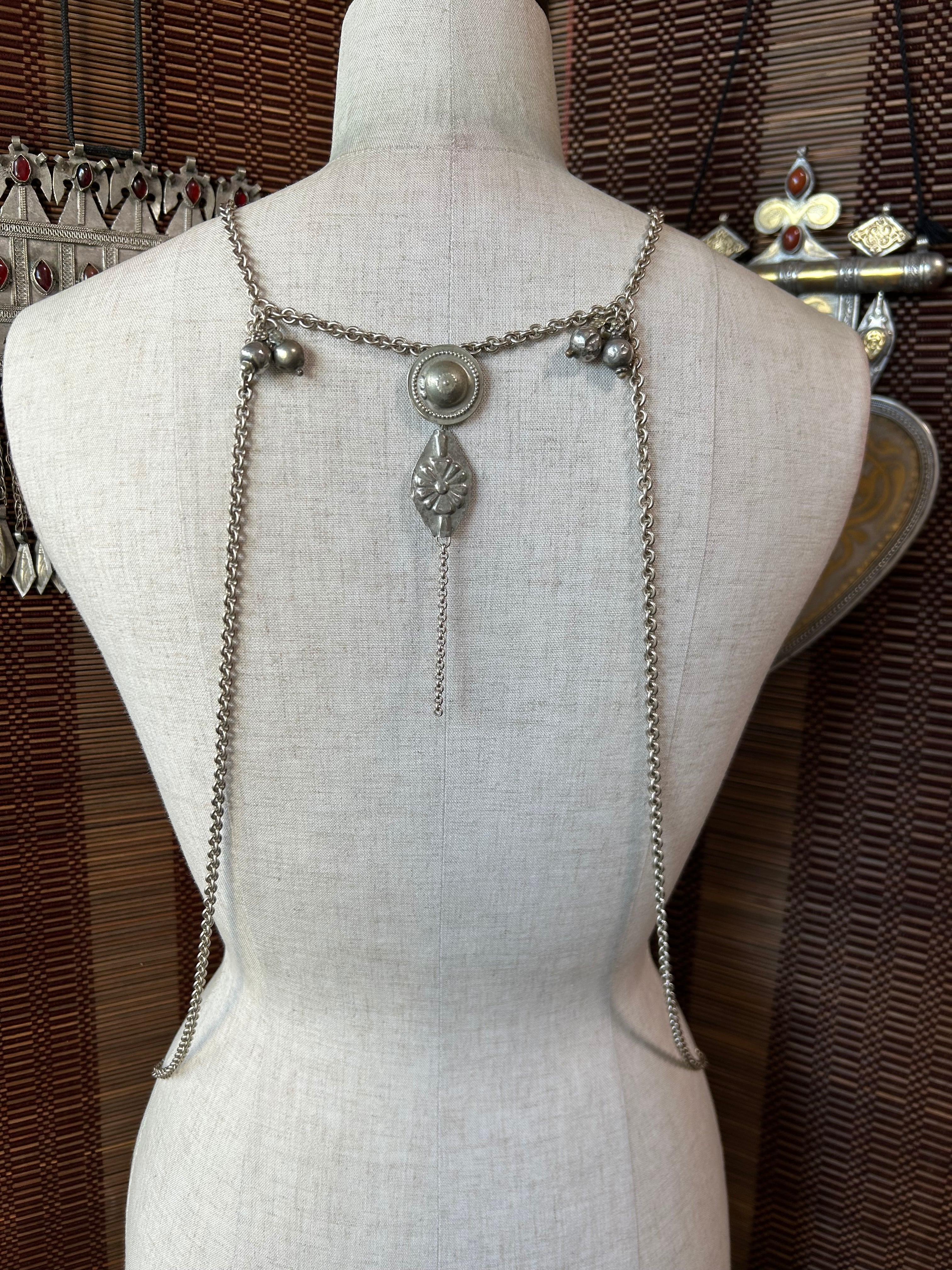 The chain is antique silver colored and coated, made in Japan. It is designed to sit just below the bust when wearing a choli.
