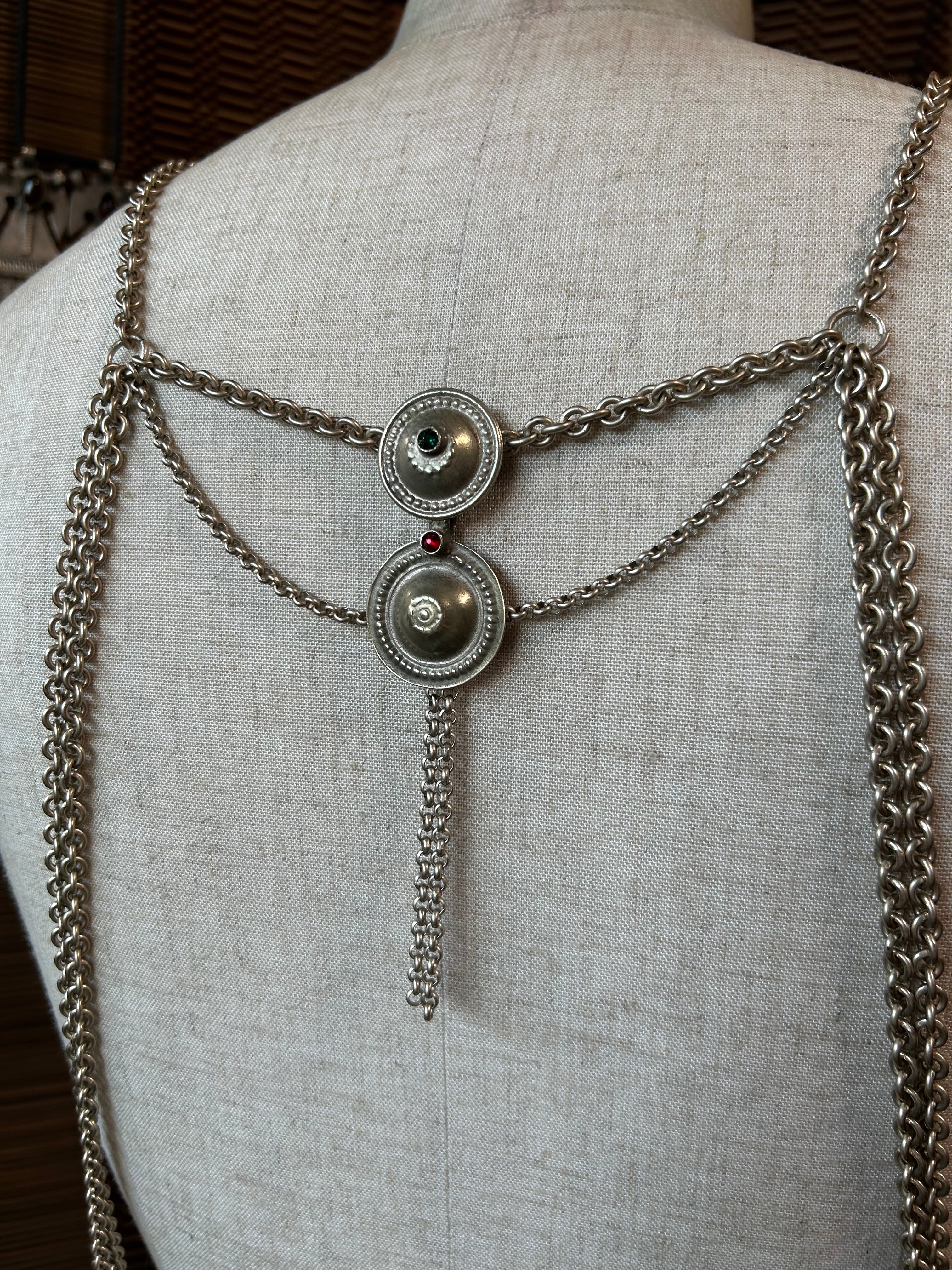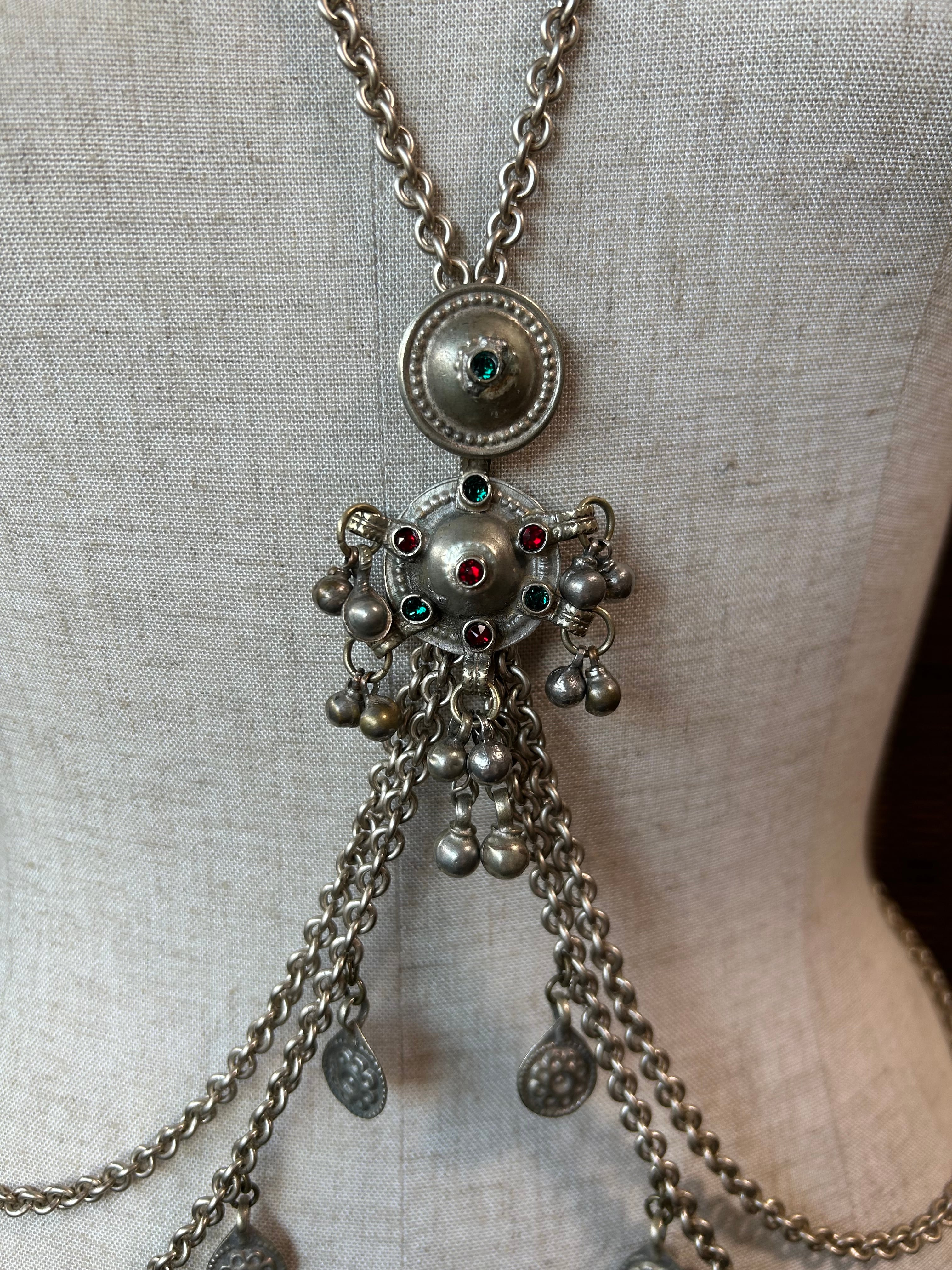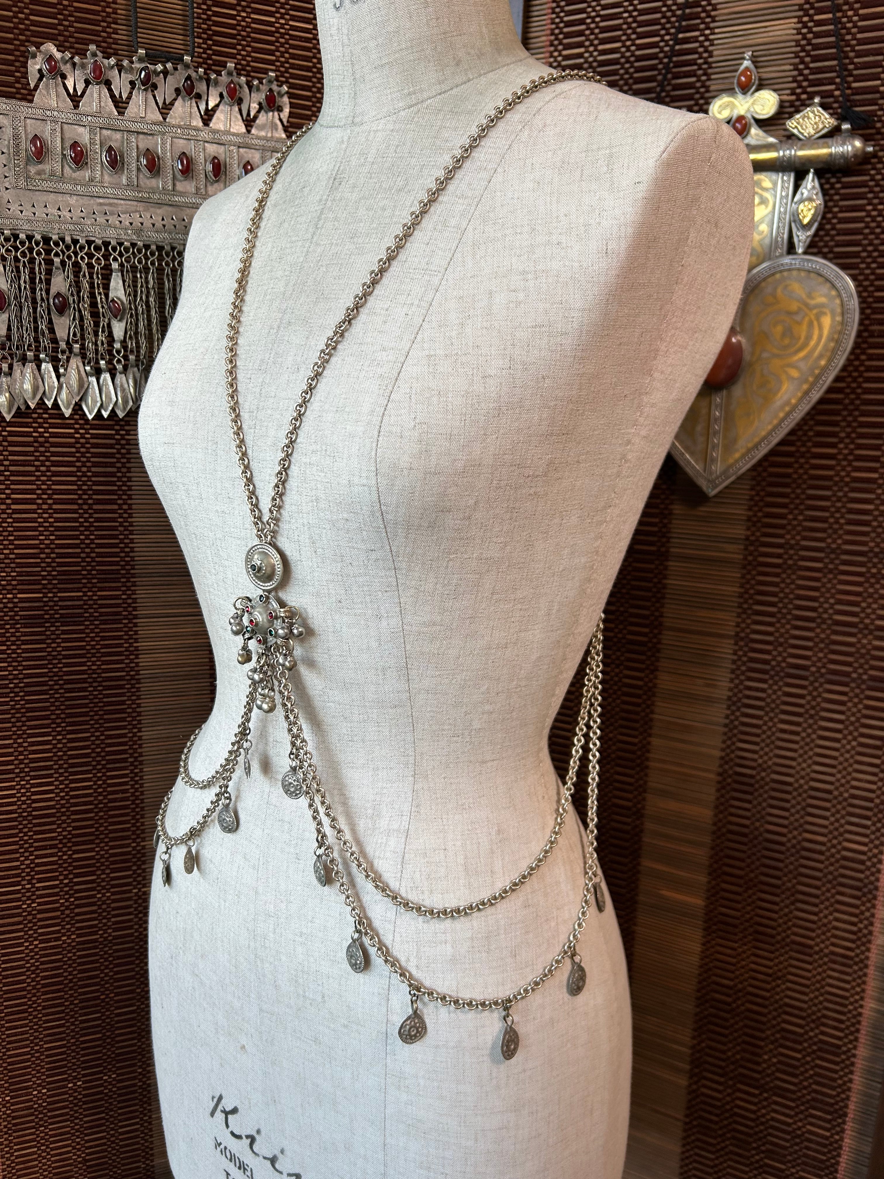 The chain is antique silver colored and coated, made in Japan. It is designed to sit just below the bust when wearing a choli.