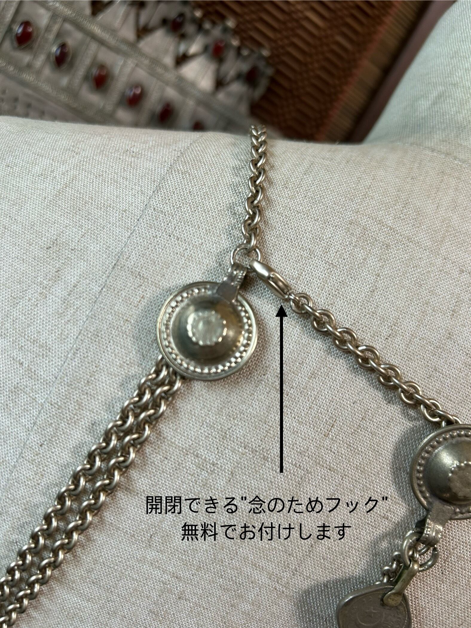 チェーンはアンティークシルバーカラ。コーティングされた日本製です。チョリを着た時の胸の下にポイントがくるようにしています。胸の下が華やかになるようチェーンはやや短めなので、フェイドやスピンも不安なく行っていただけます。首まわりはヘアガーデンを作った後からでも被れる広さ。背面にもこだわり、チョリやブラの結び紐と重ならない位置にチェーンや飾りを配置。オープンバックに映えるデザインとなっています。
