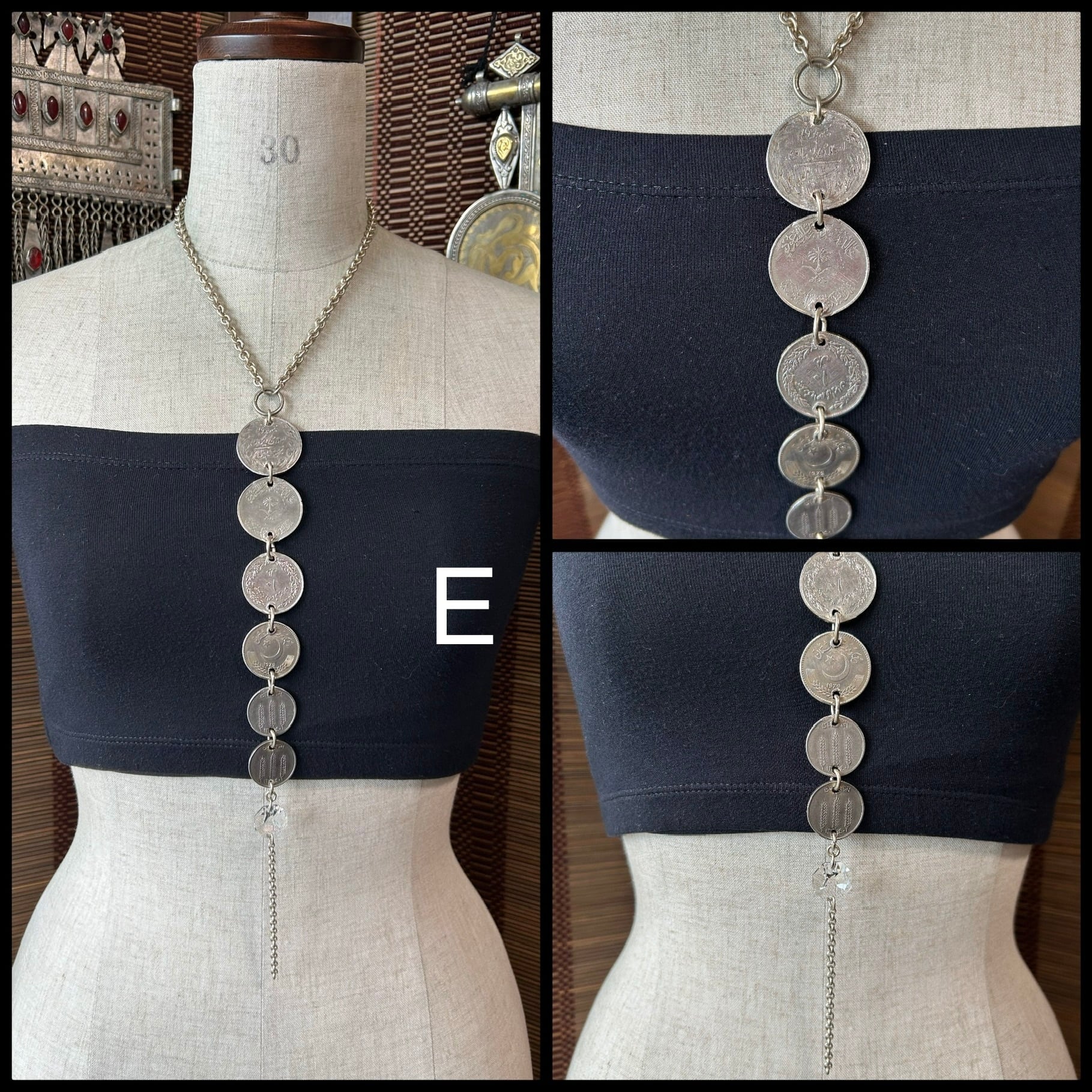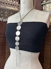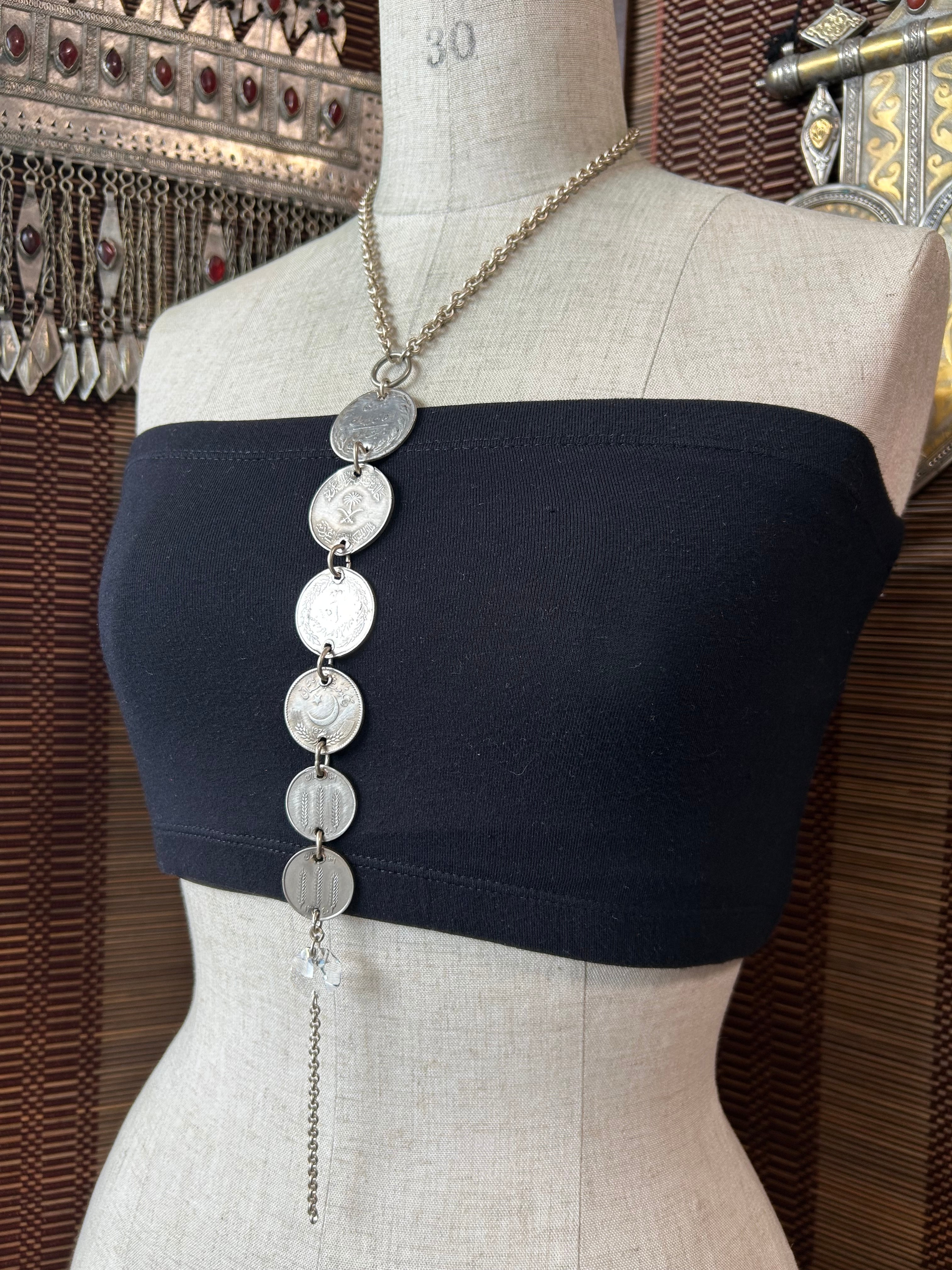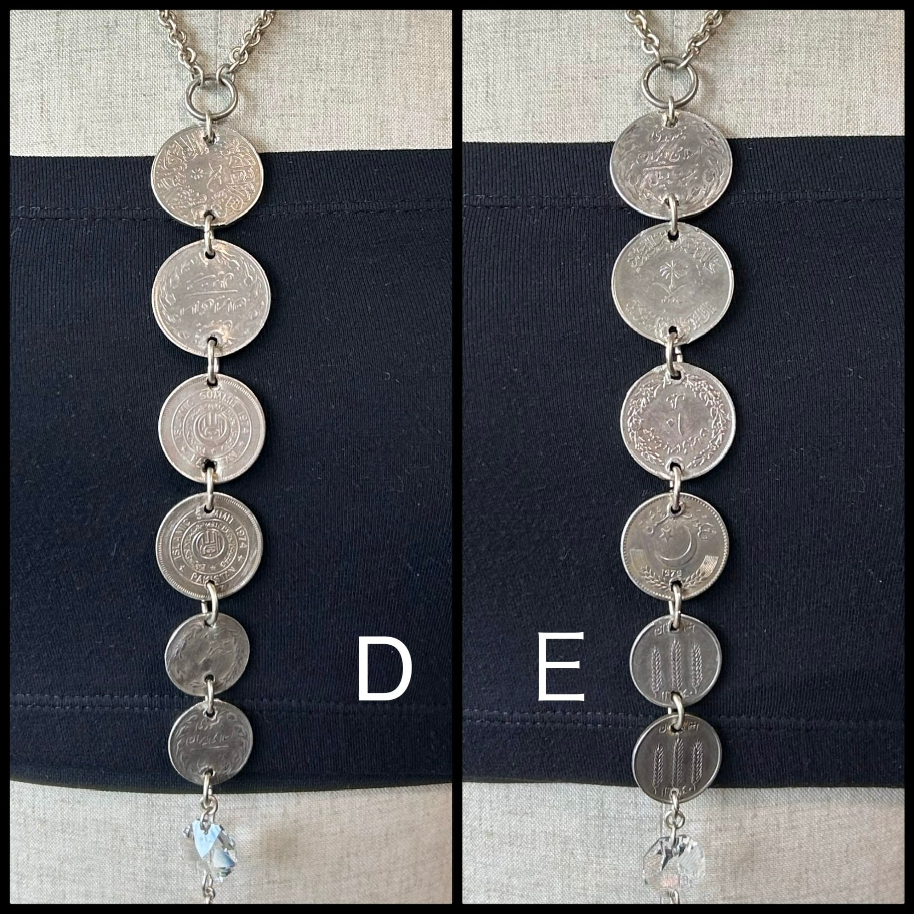 様々な国のコインを使ったネックレスに八角形のヴィンテージスワロフスキーを合わせました。チェーンや繋ぎカンはコーティングされた日本製を商品。