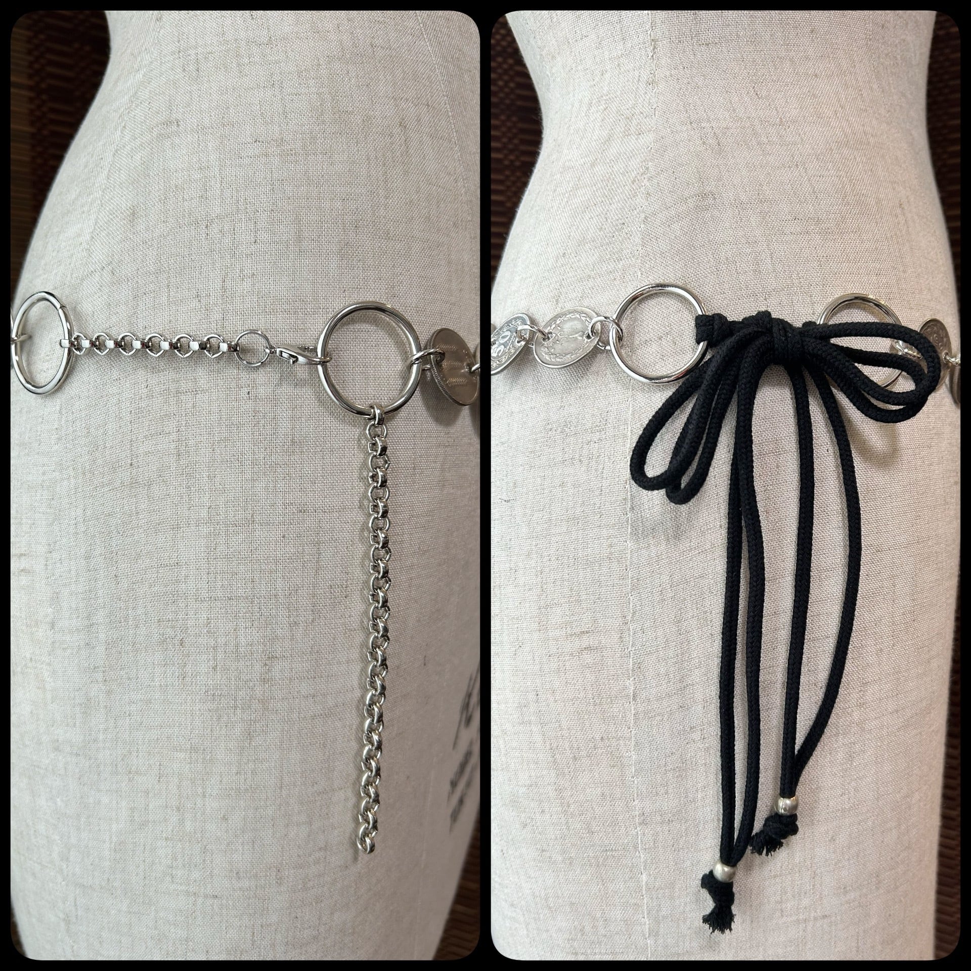 *Please choose from the options whether you would like it tied with a black string or a chain. If no selection is made, it will be sent with a knotted string.The coin belt has a simple design and can of course be worn alone, but we also recommend layering it with a belt you already own. You can separate it in the middle and use it as a headpiece, or let it hang from your waist. Feel free to remake it however you like.