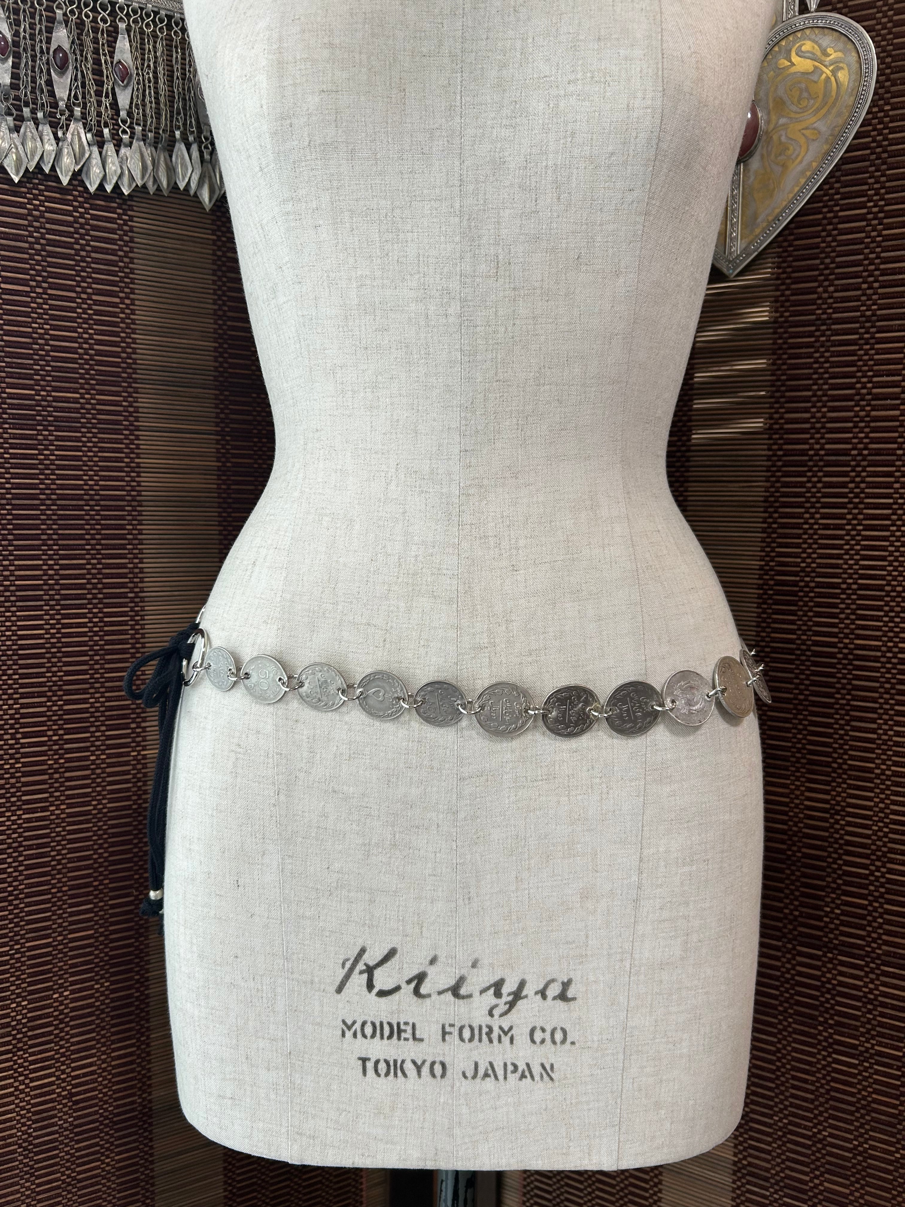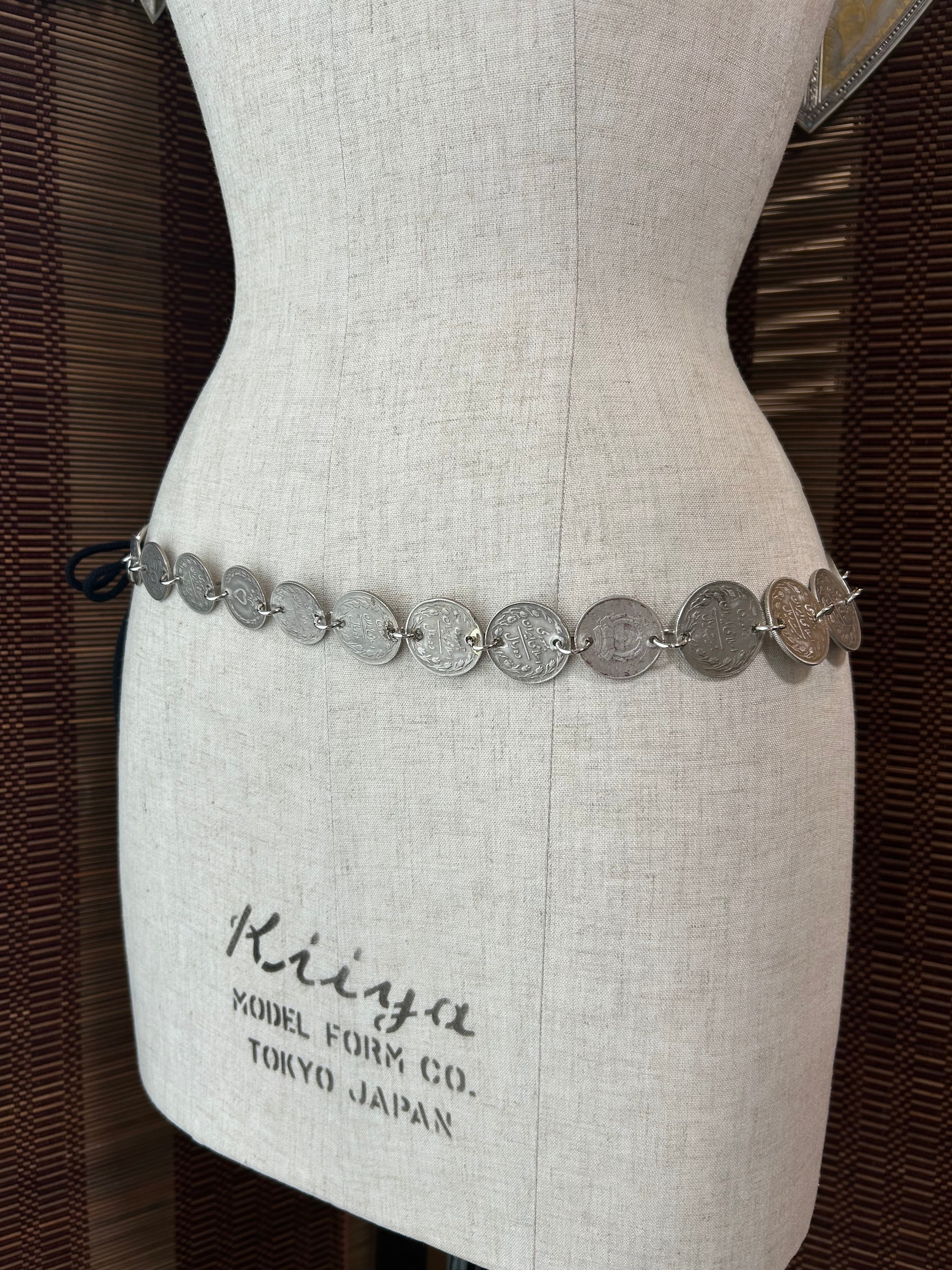 シンプルなデザインのコインベルト。もちろん単体でも使えますし、お手持ちのベルトとの重ねづけもおすすめです。途中で分けてヘッドドレスとして使ったり、腰から垂らしても。いかようにもリメイクされてください。