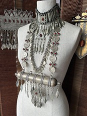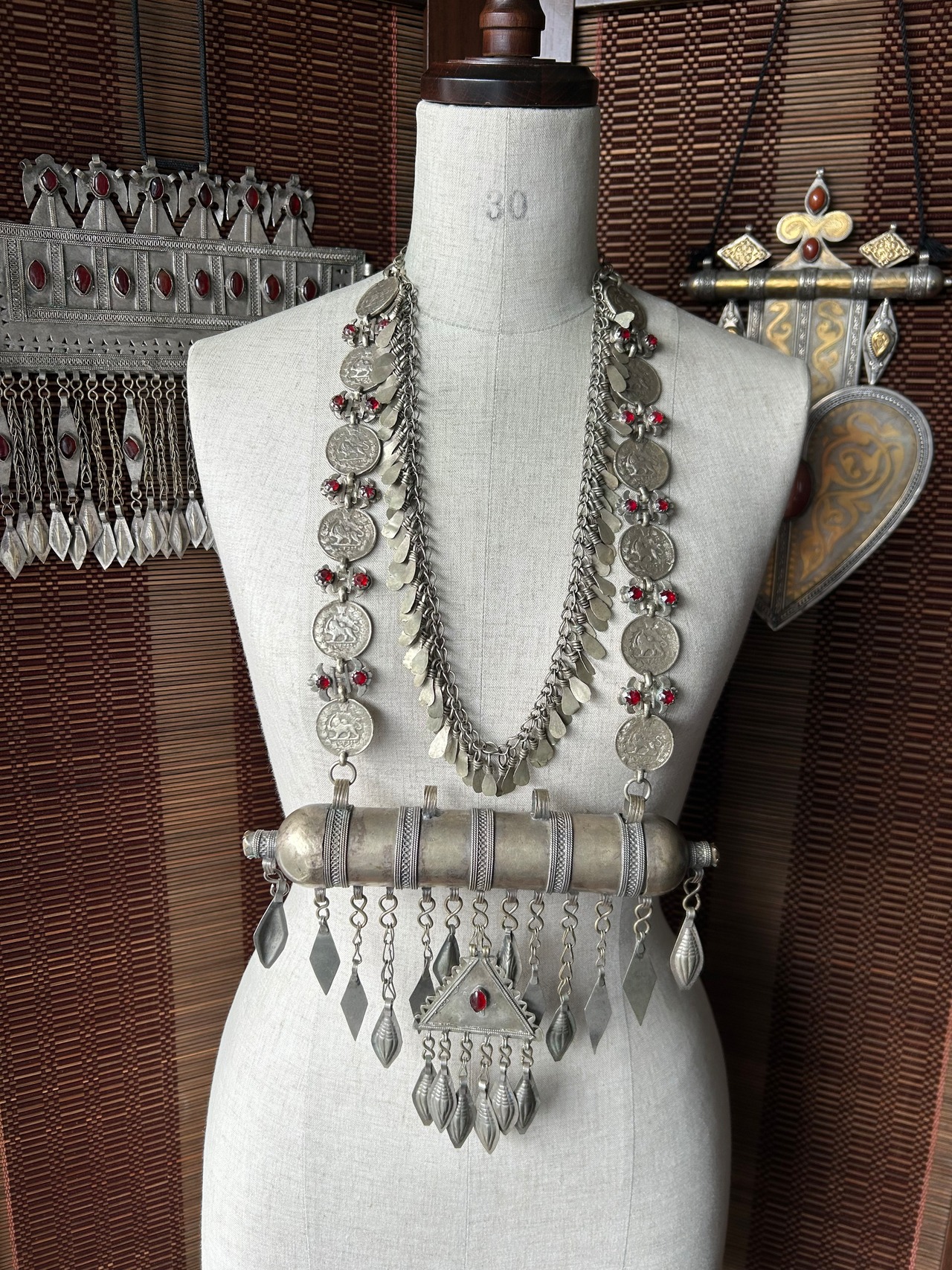 大きなタンク型のトルクメンペンダントは、本来は横から開けることができるのですが、壊れそうなので開けていません。昔は中に魔除けの護符などを入れて使われていました。