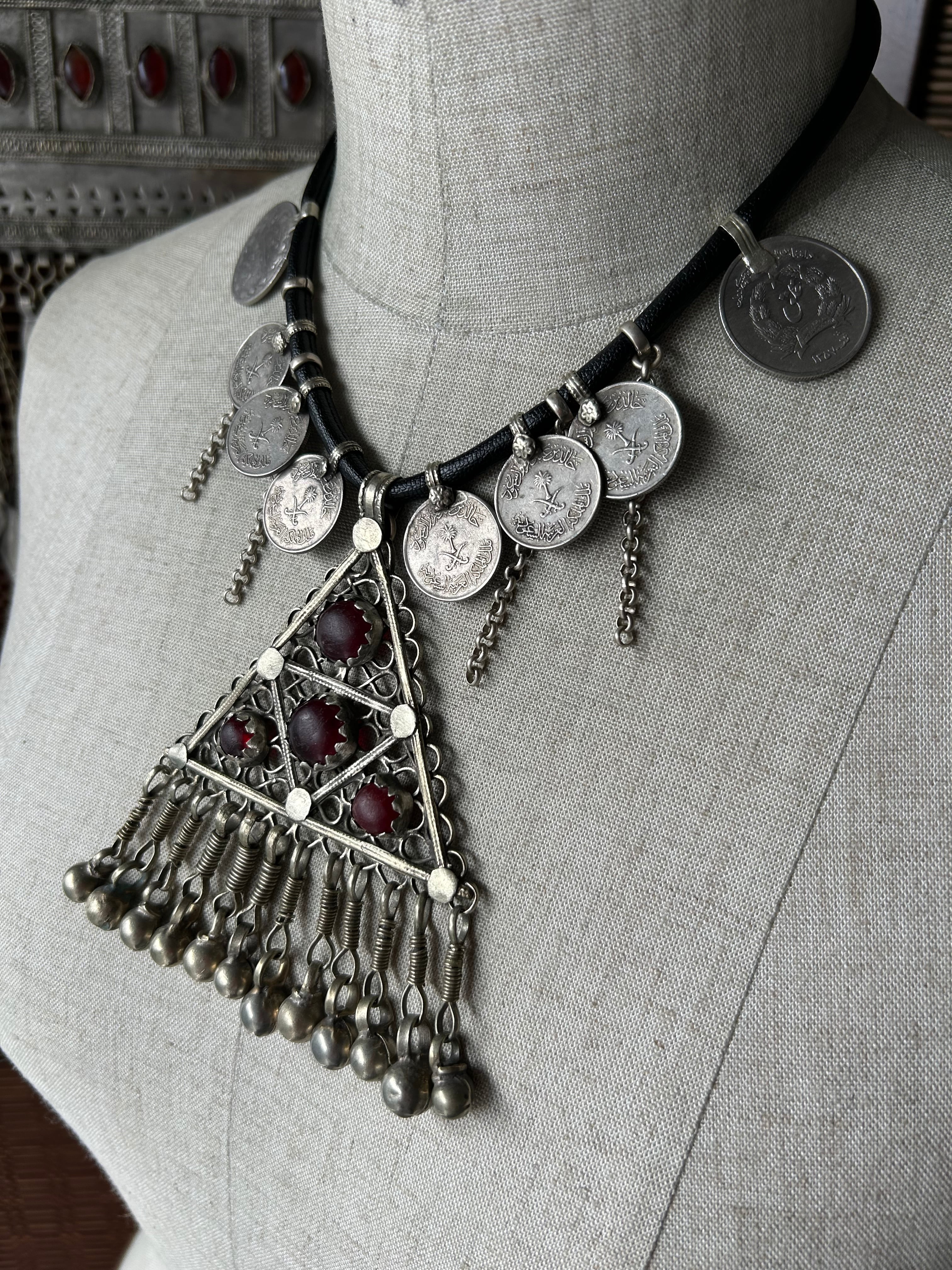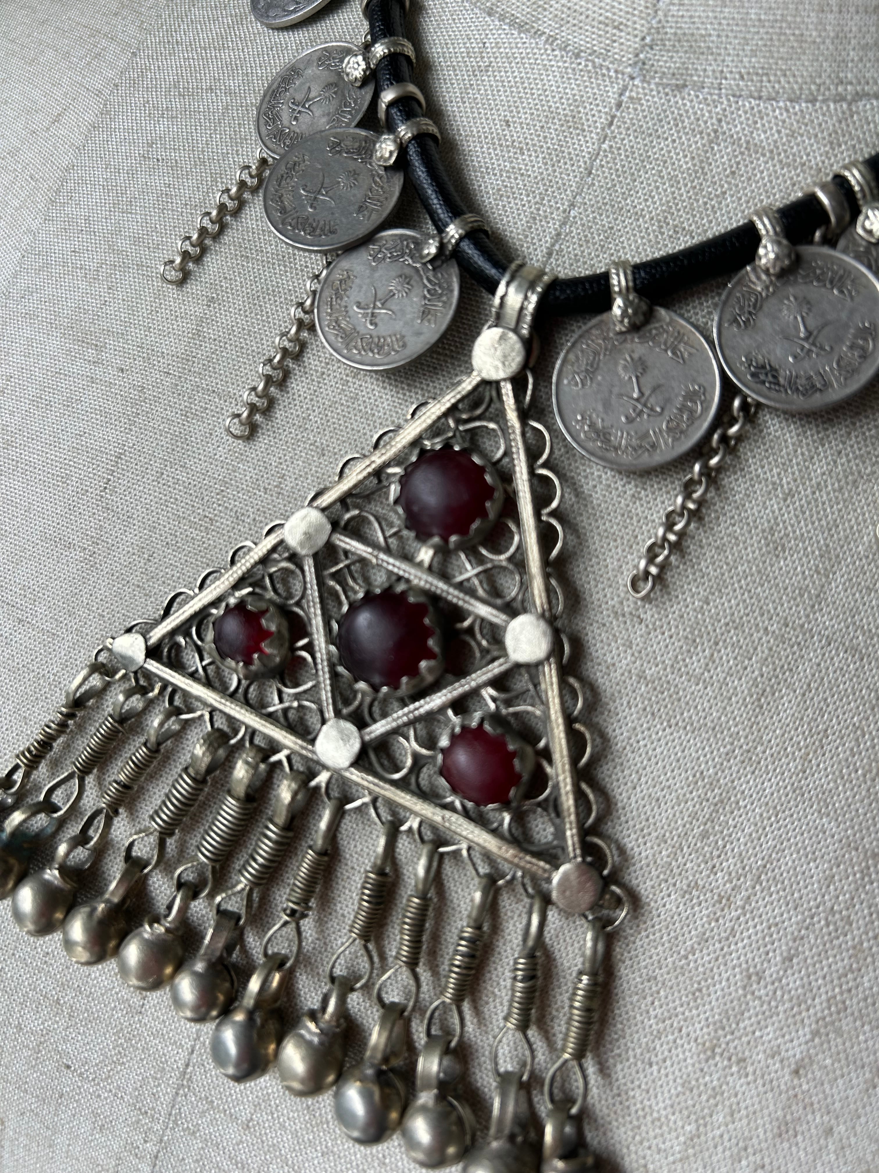 上質の小さなヴィンテージコインを合わせています。首まわりに優しいヴィーガンレザーの丸紐を使用。