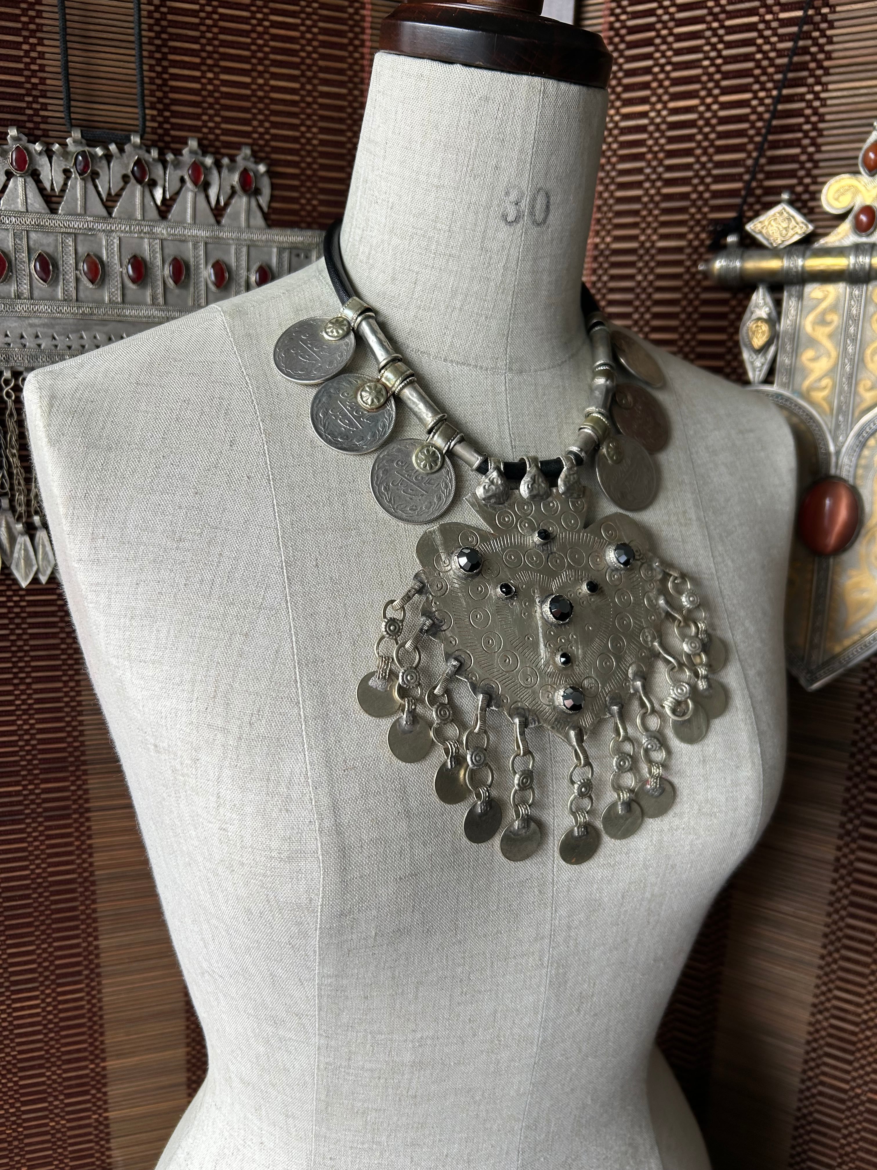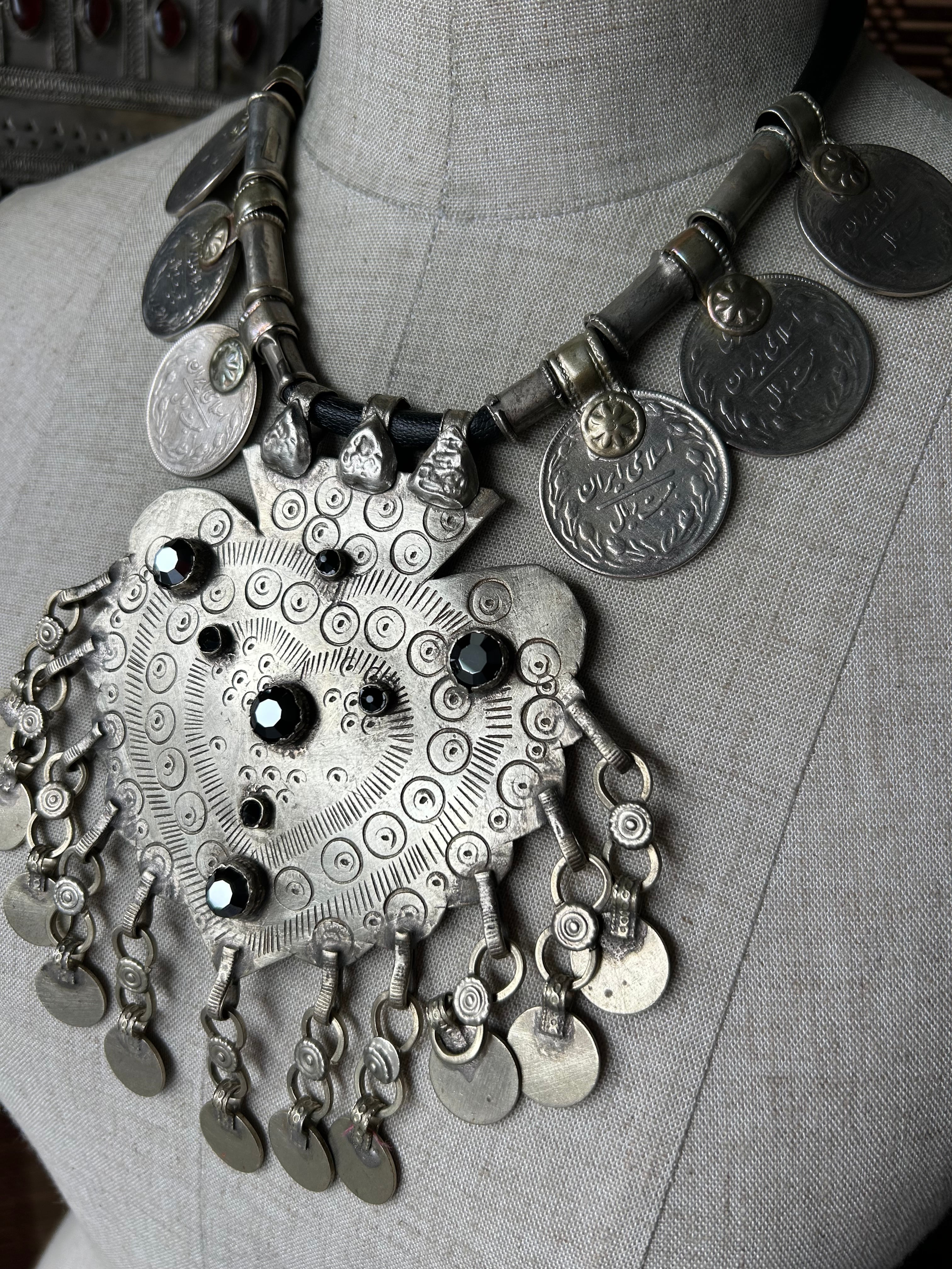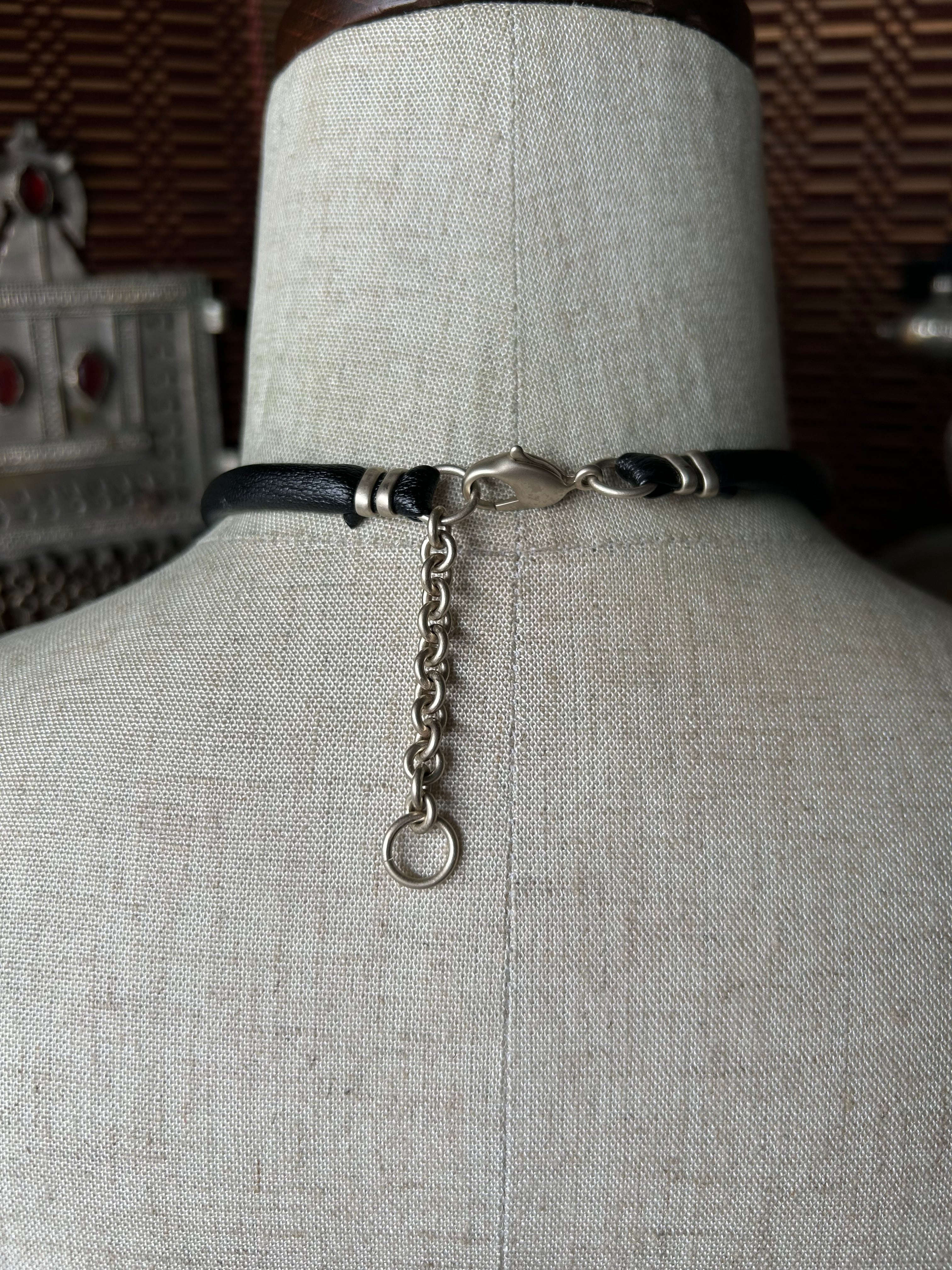 インパクトあるラージペンダントを使ったネックレス。アクリルの飾りをヘマタイトカラーのスワロフスキーに入れ替えました。ヘマタイトはシークでありながら黒ほどはっきりしすぎないので、様々な色のお衣装に合わせやすくなっています。マカロニ型のヴィンテージメタルビーズで甘さを抑え、ゴリっと民族調に仕上げています。ヴィーガンレザーの丸紐は首あたりが優しいので、金属が苦手な人にもおすすめです。