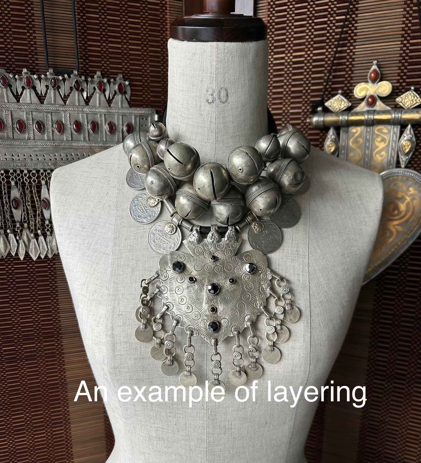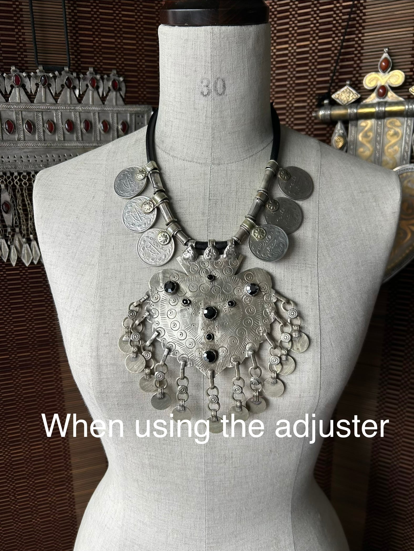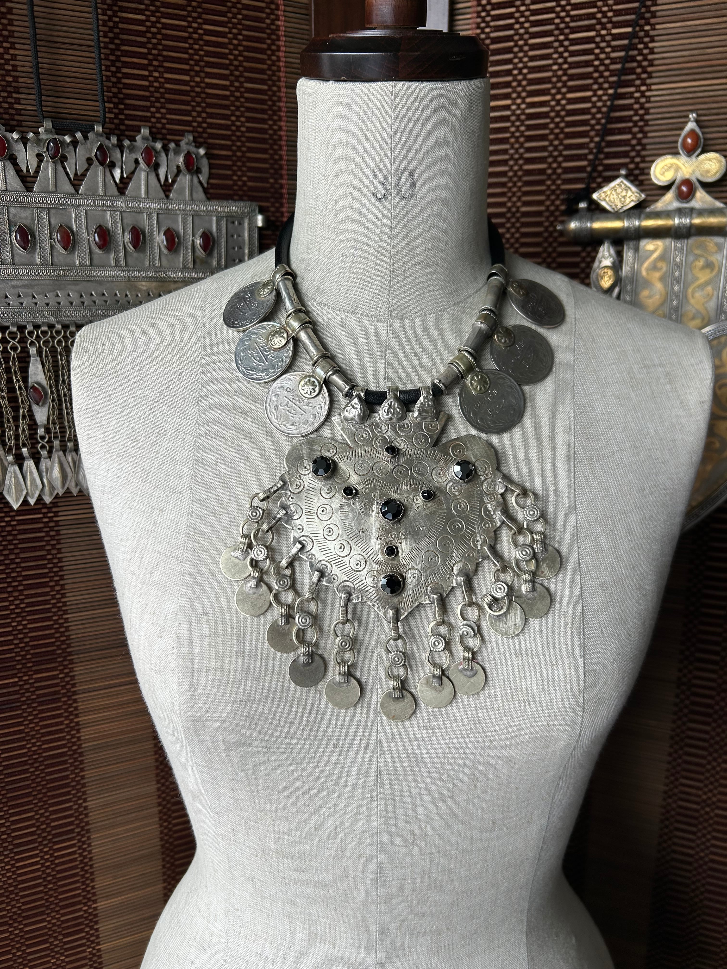 インパクトあるラージペンダントを使ったネックレス。アクリルの飾りをヘマタイトカラーのスワロフスキーに入れ替えました。ヘマタイトはシークでありながら黒ほどはっきりしすぎないので、様々な色のお衣装に合わせやすくなっています。マカロニ型のヴィンテージメタルビーズで甘さを抑え、ゴリっと民族調に仕上げています。ヴィーガンレザーの丸紐は首あたりが優しいので、金属が苦手な人にもおすすめです。