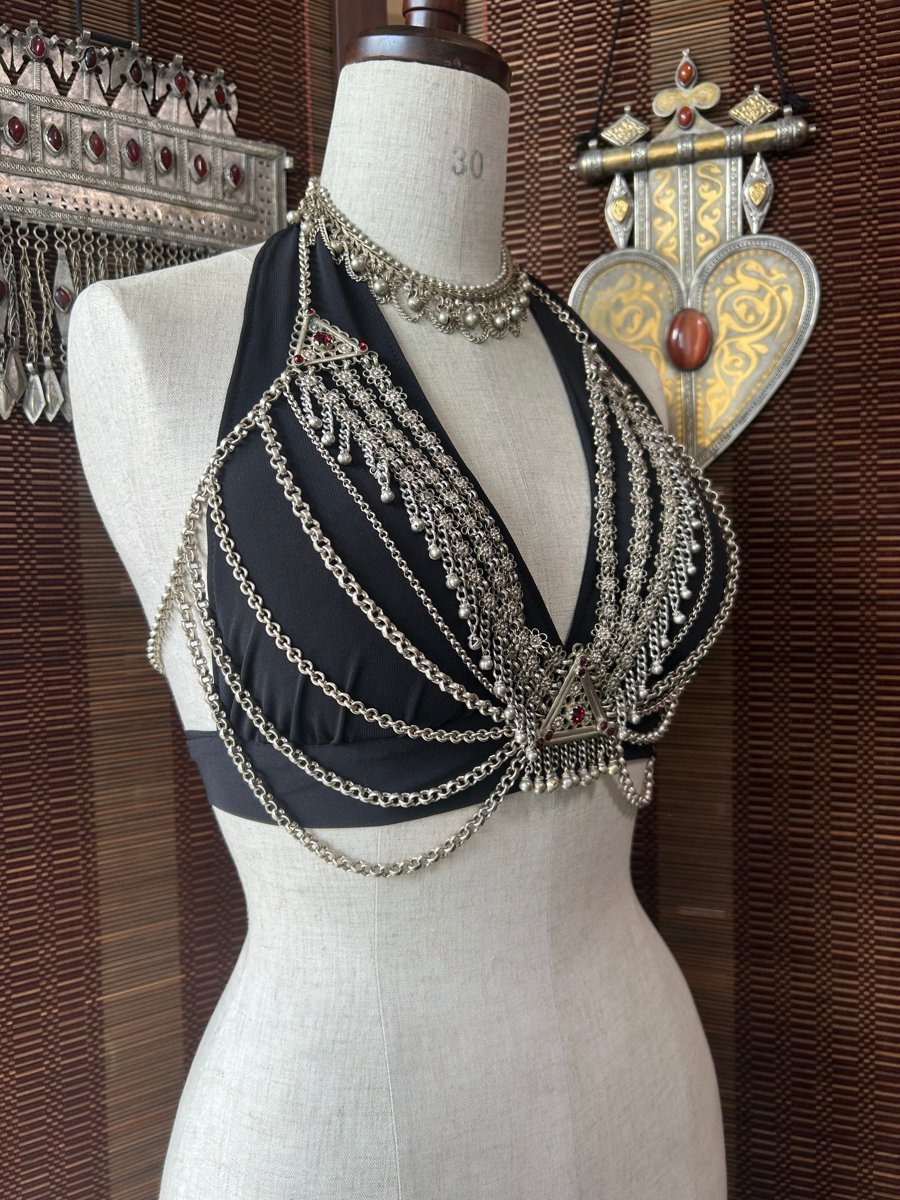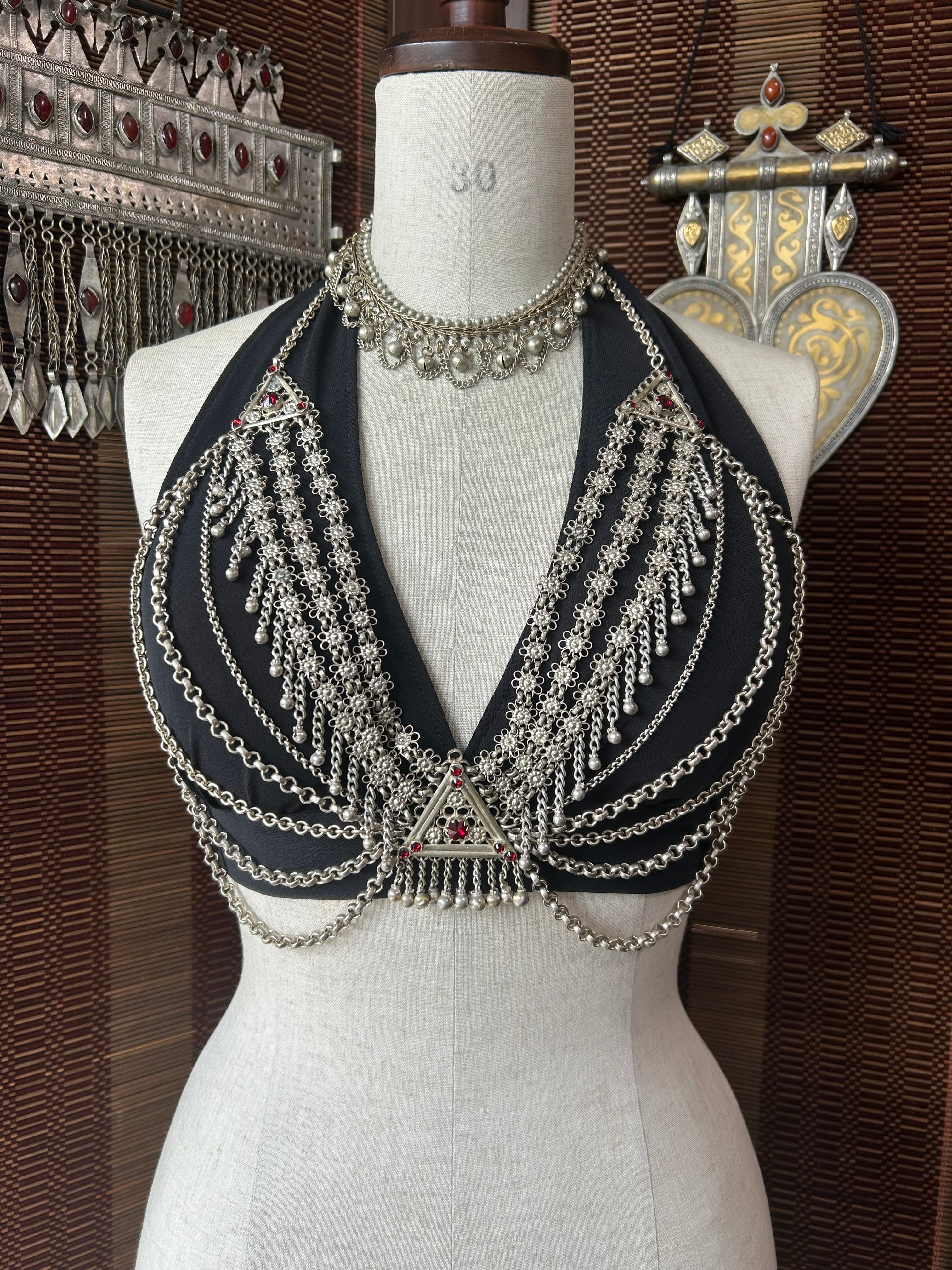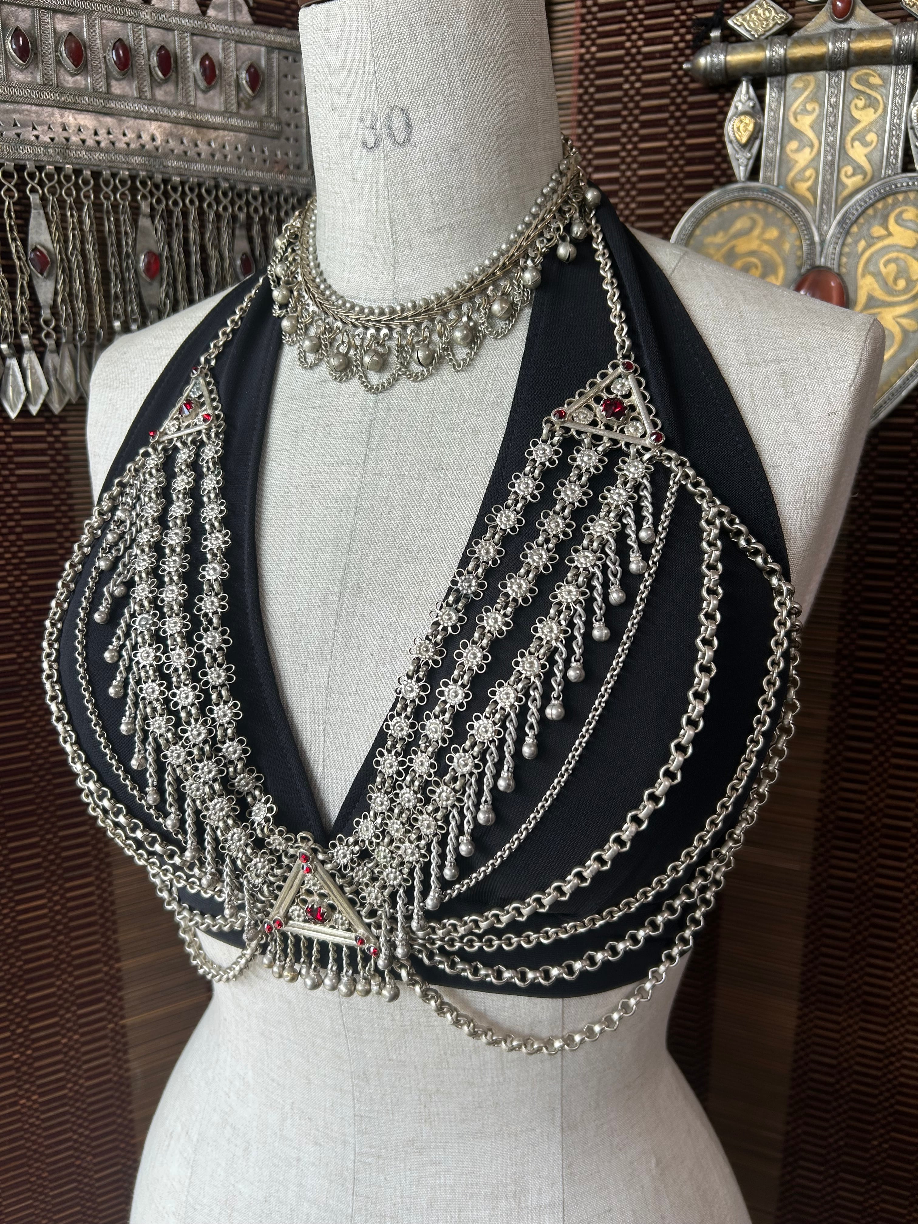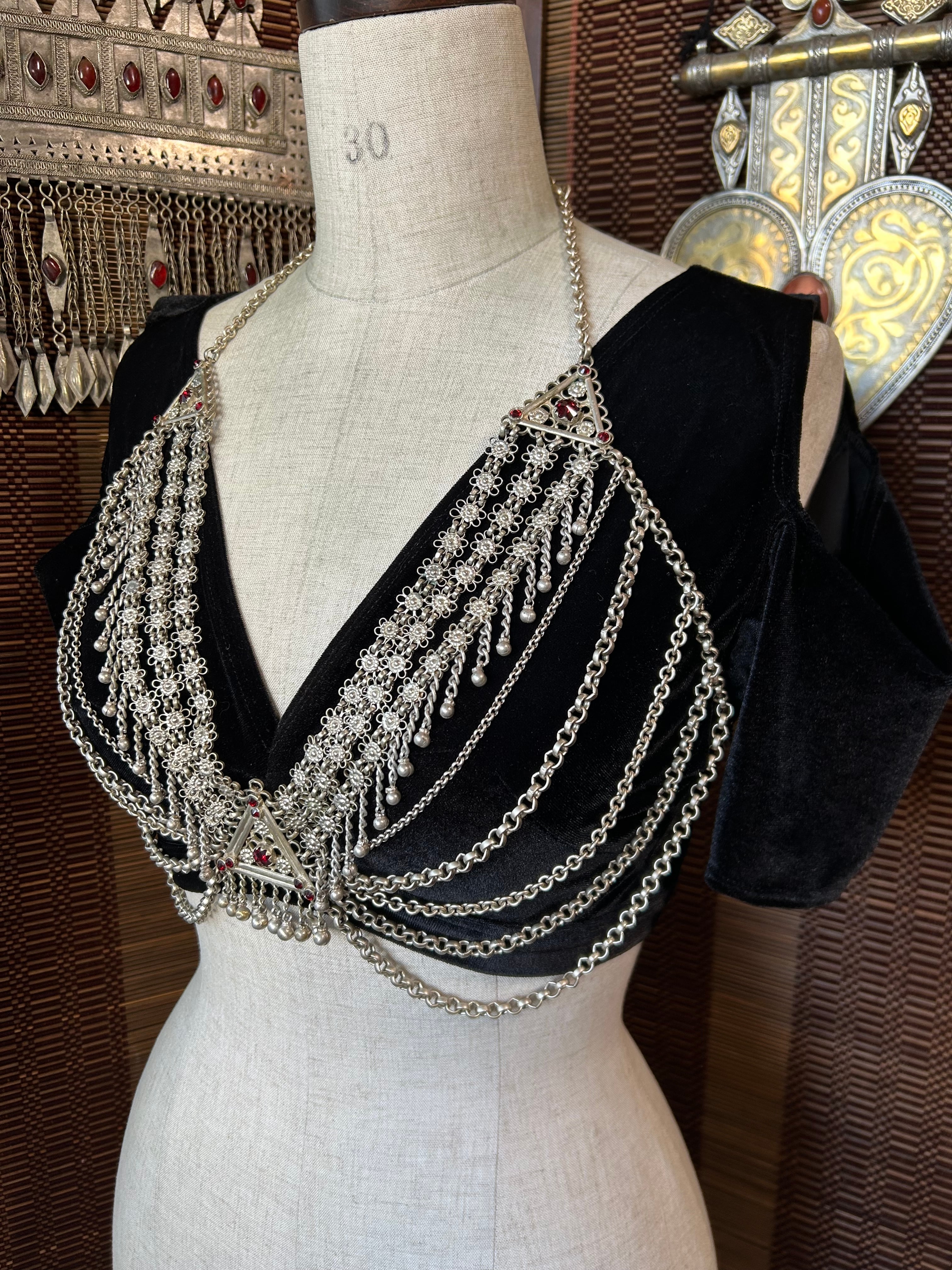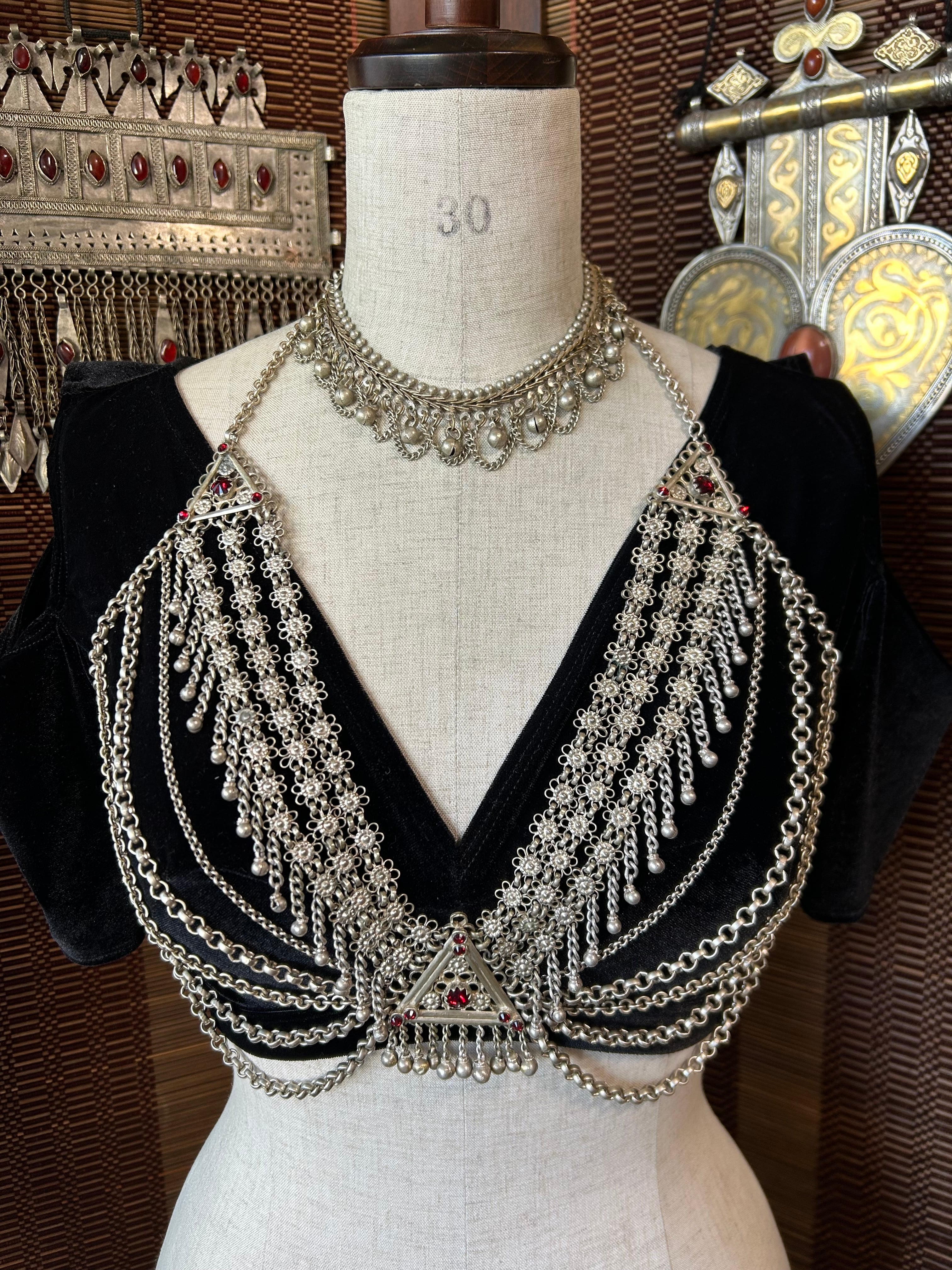 もとはV字型のネックレスだったのをチェーンブラに組み上げました。カシミール地方のアンクレットを使ったチョーカーもセットです。