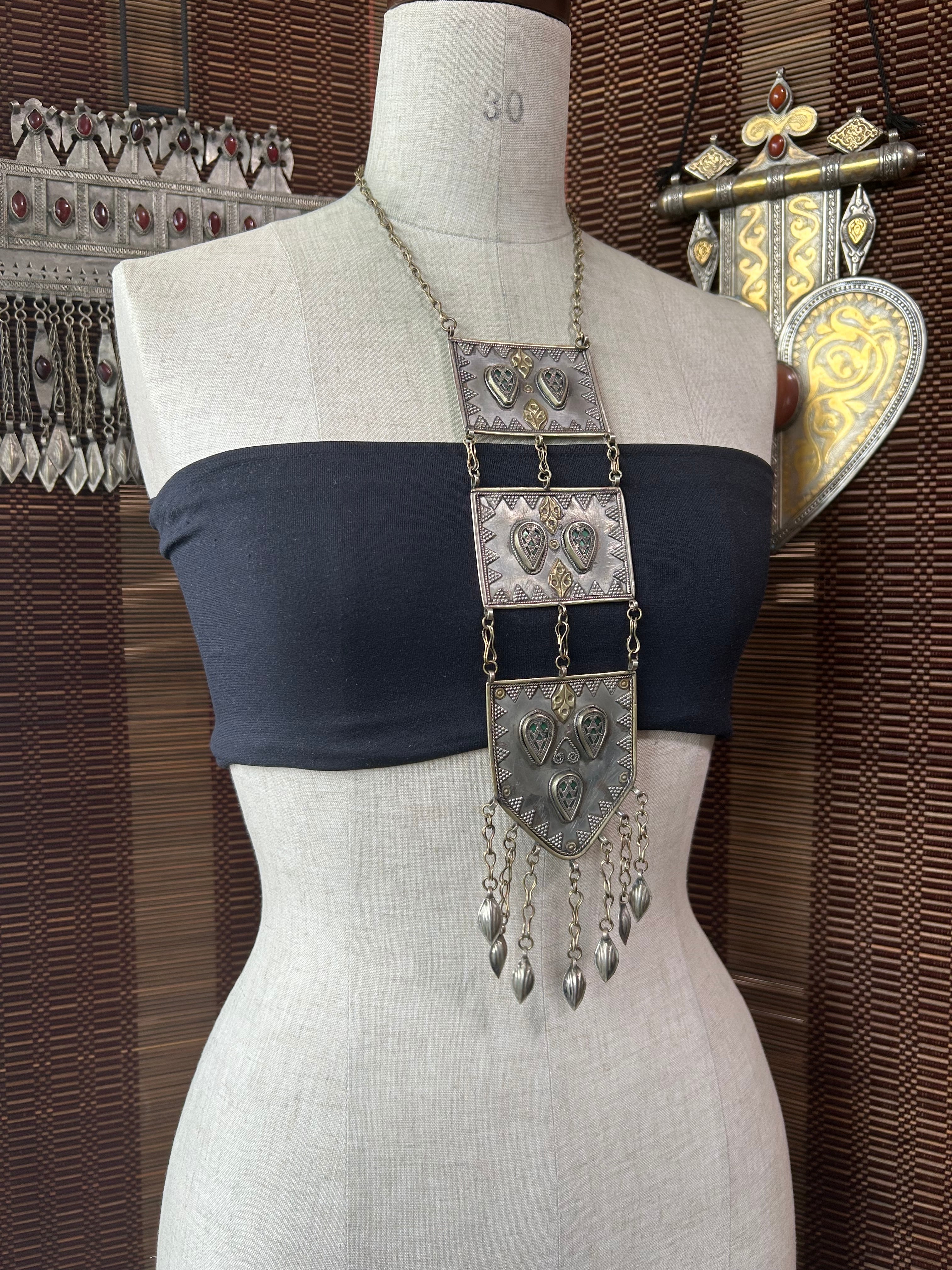 This three-pendant necklace features beautiful three-dimensional decorations and gold accents. The chain was old, so it has been replaced with a new one in better condition.