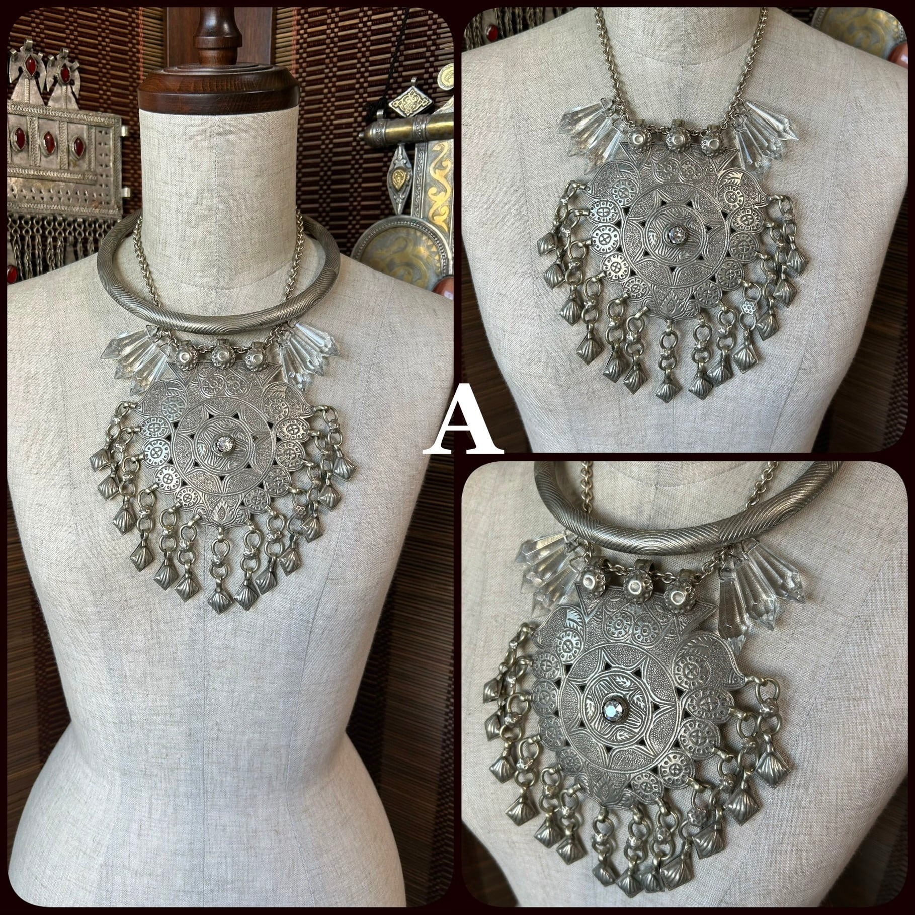 A necklace set featuring a large Kashmir pendant and an Indian-made choker. The crystal-like glass adds a touch of glamour.