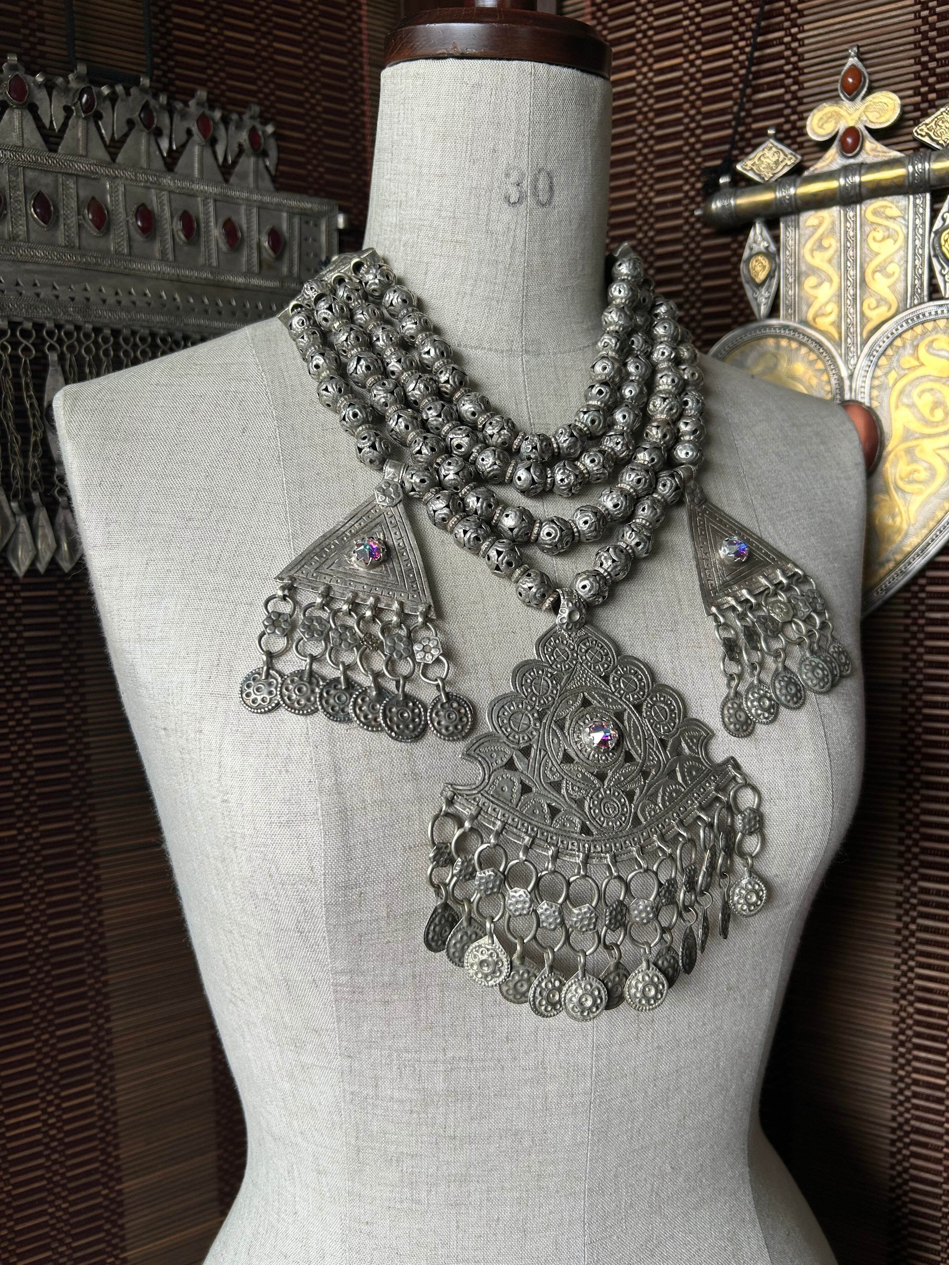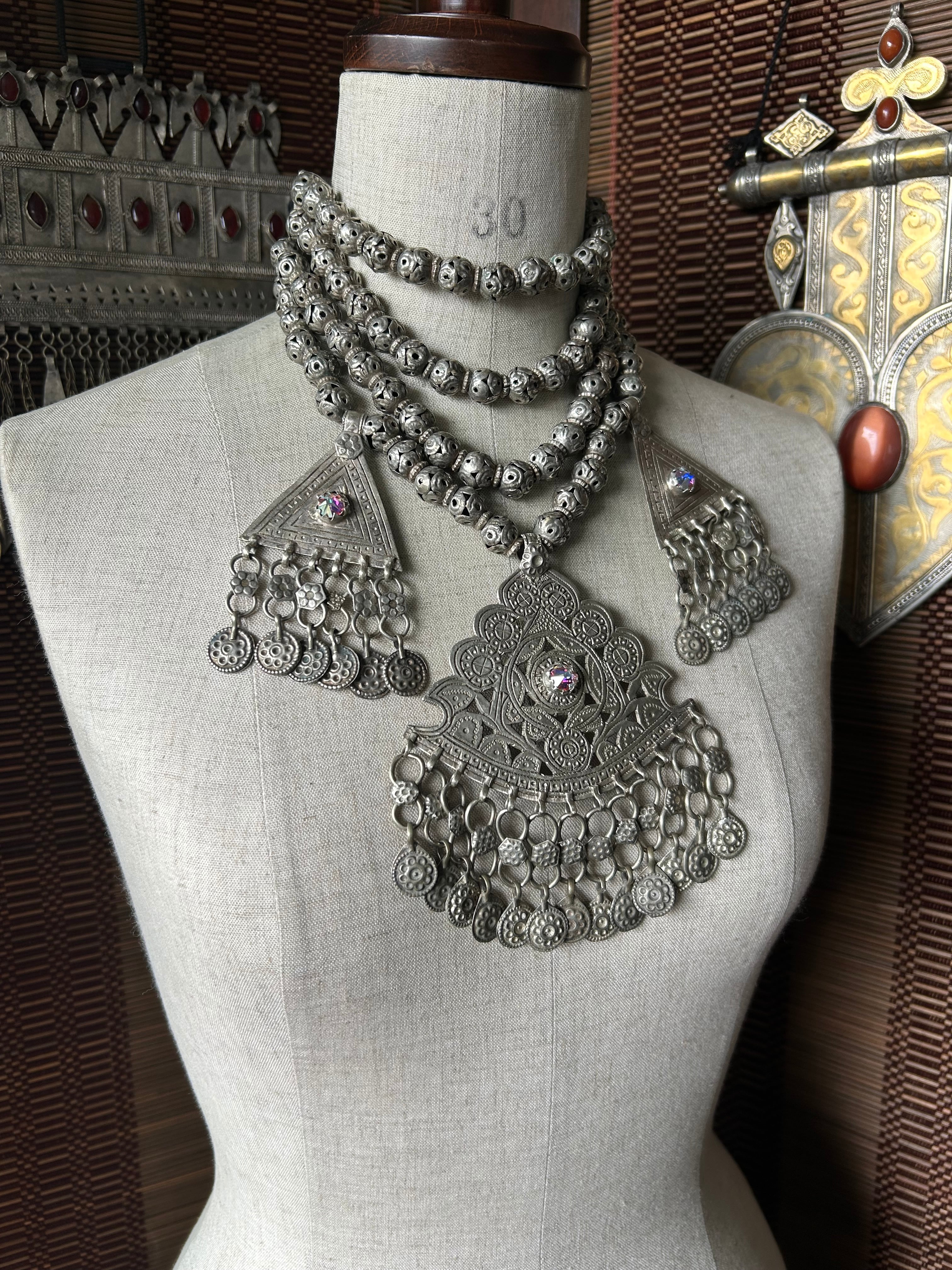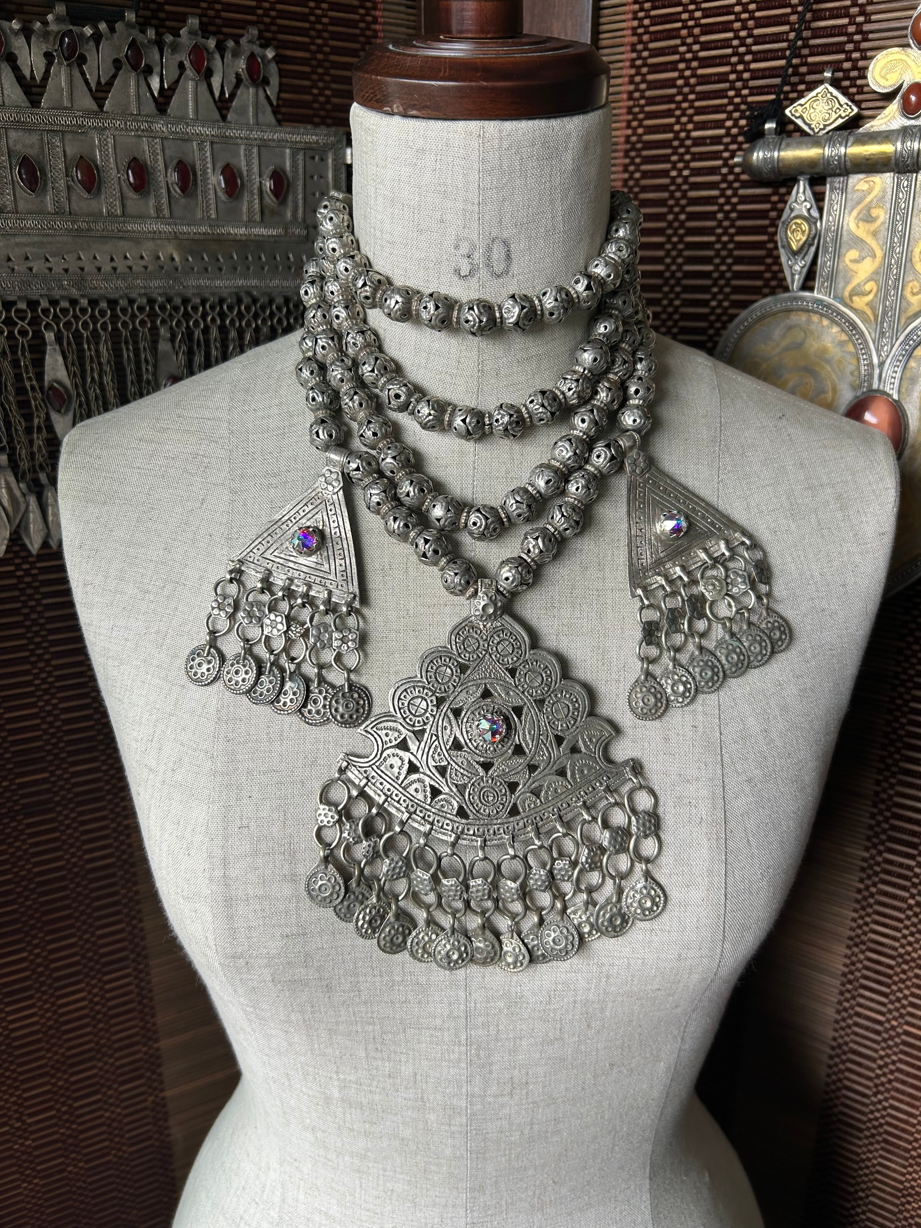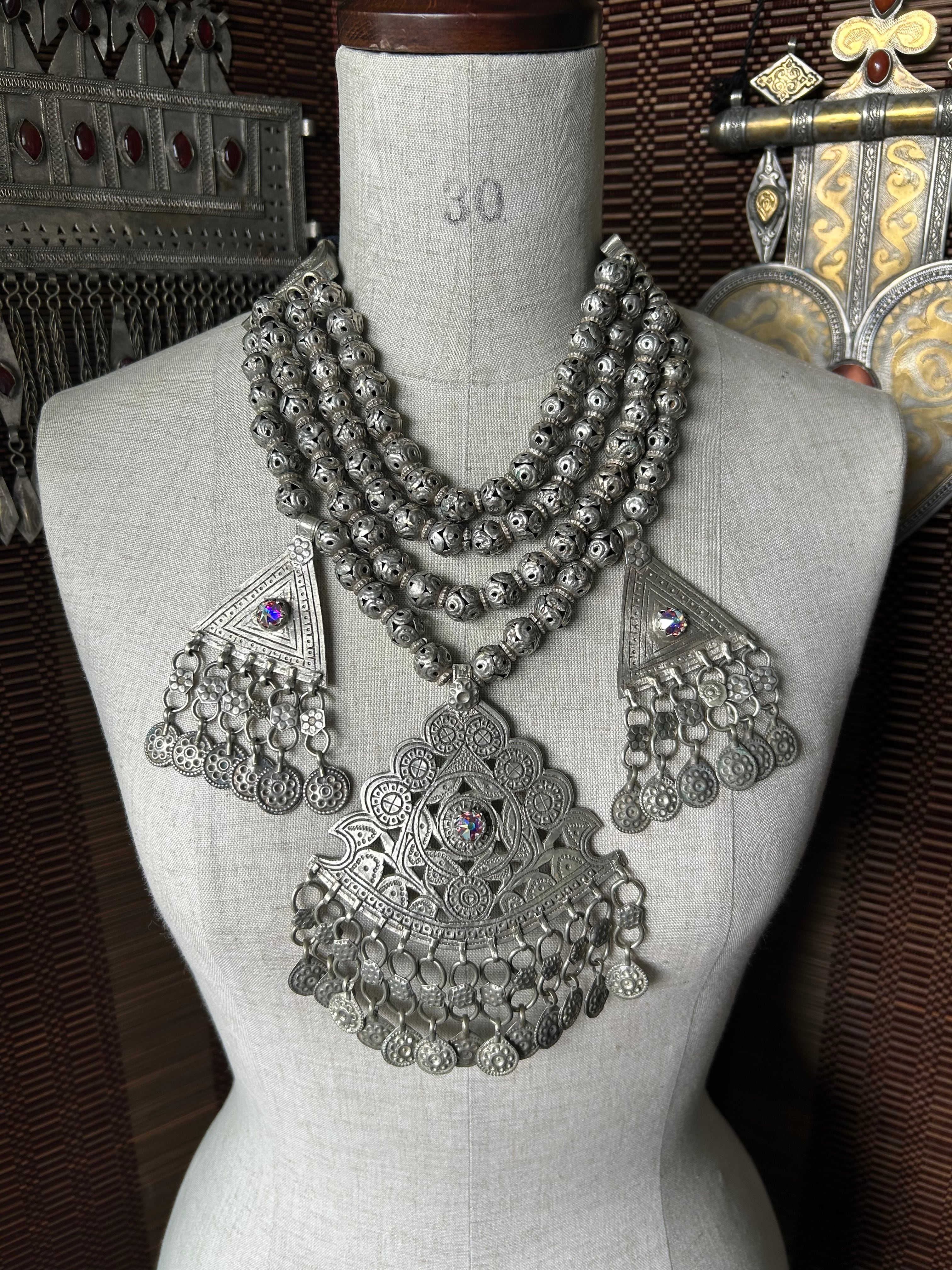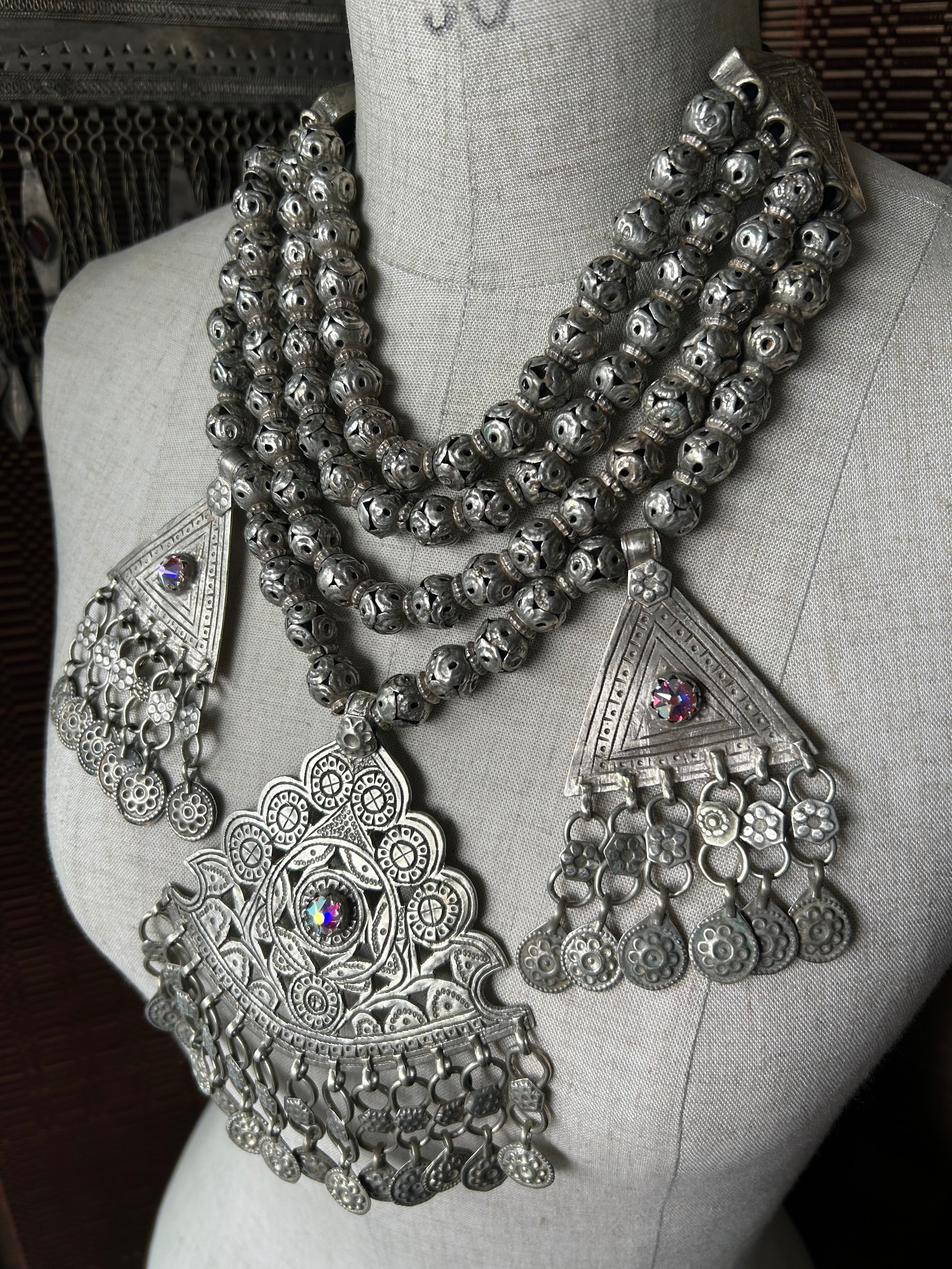 Since it has become difficult to obtain inexpensive, ready-made items, I source parts from vintage Kashmir necklaces and assemble them using traditional methods. I use thin cotton cord instead of yarn, so it won't irritate your neck. The Swarovski crystals are aurora-colored, changing and sparkling in various hues.