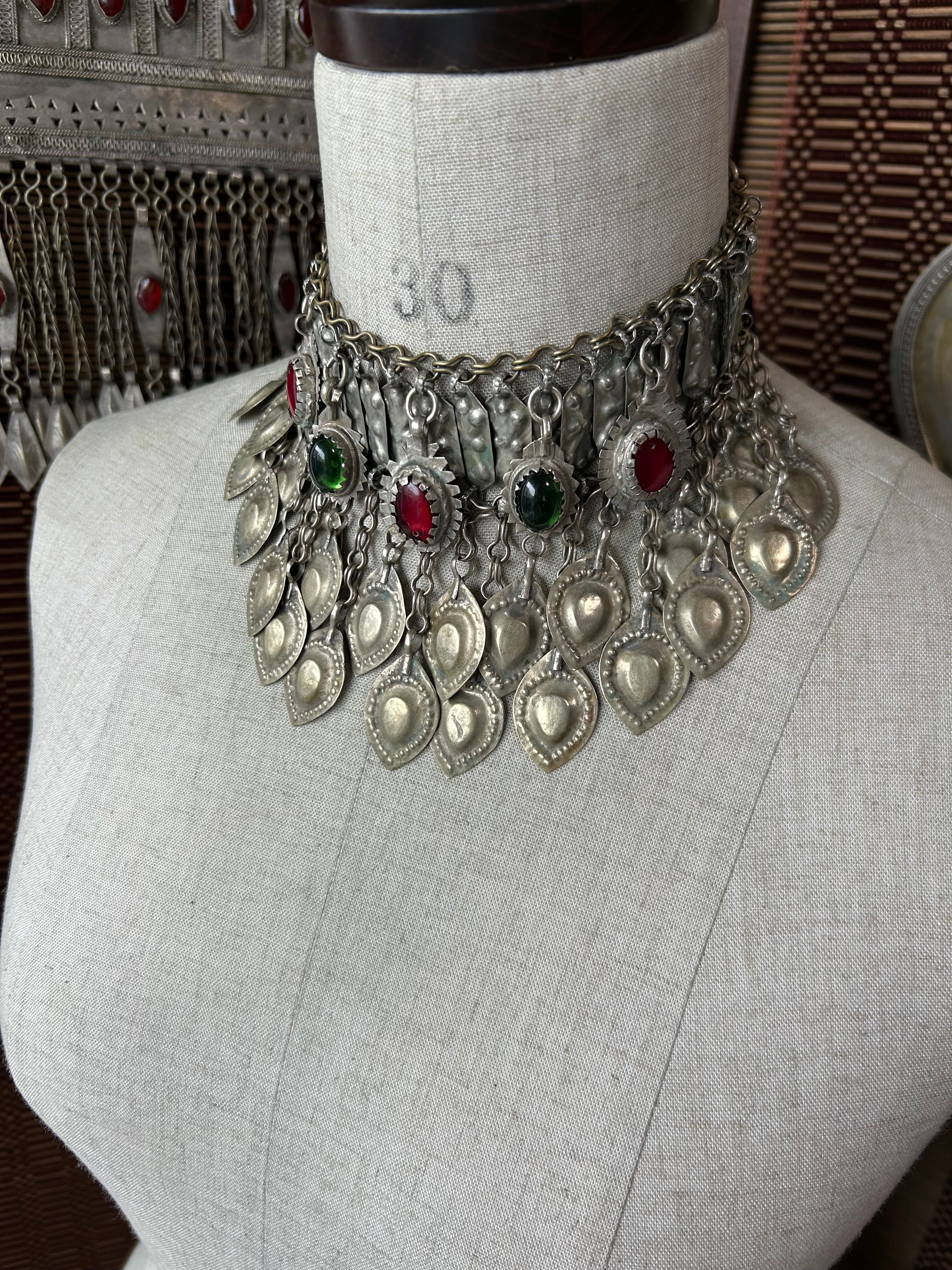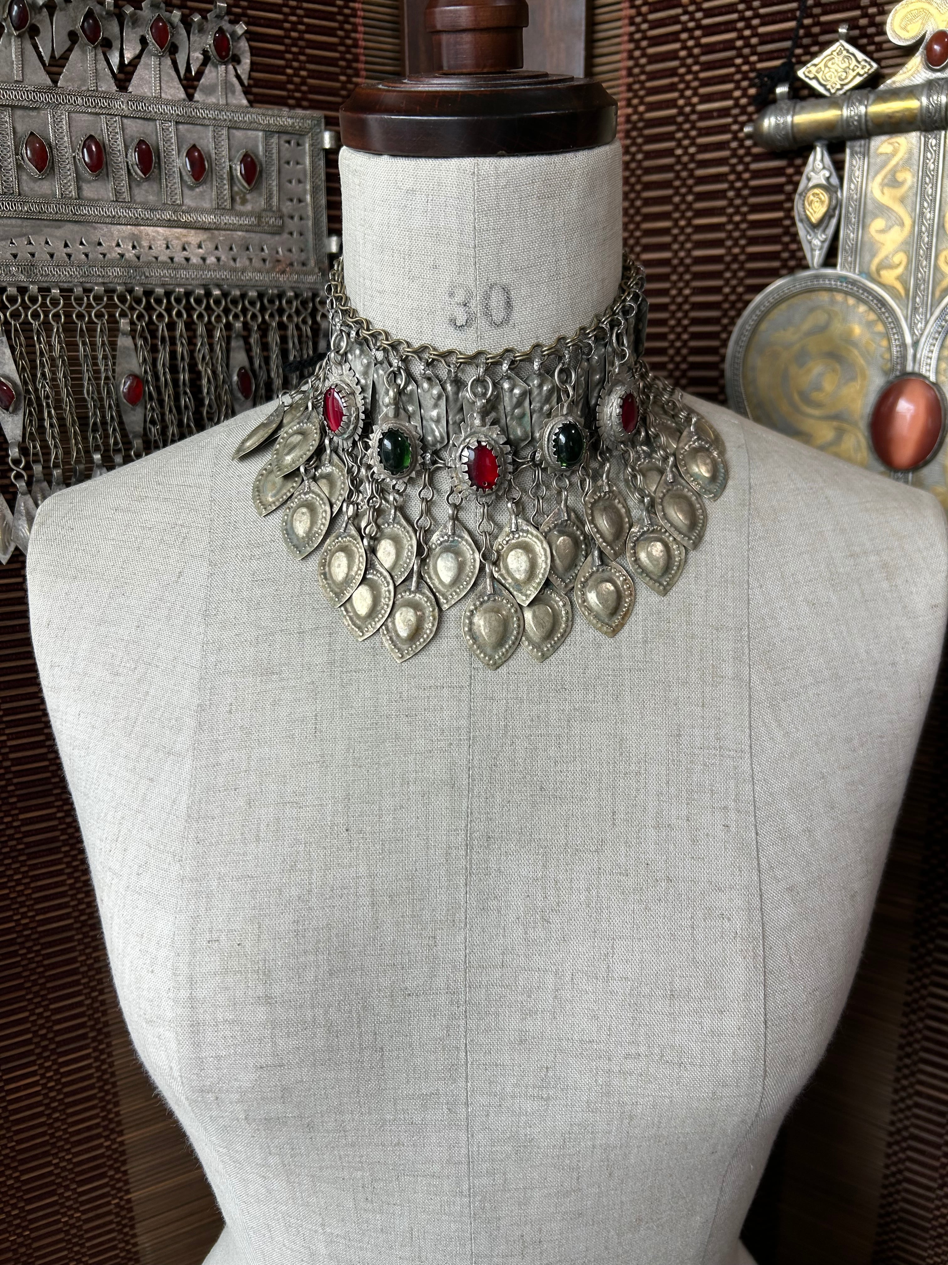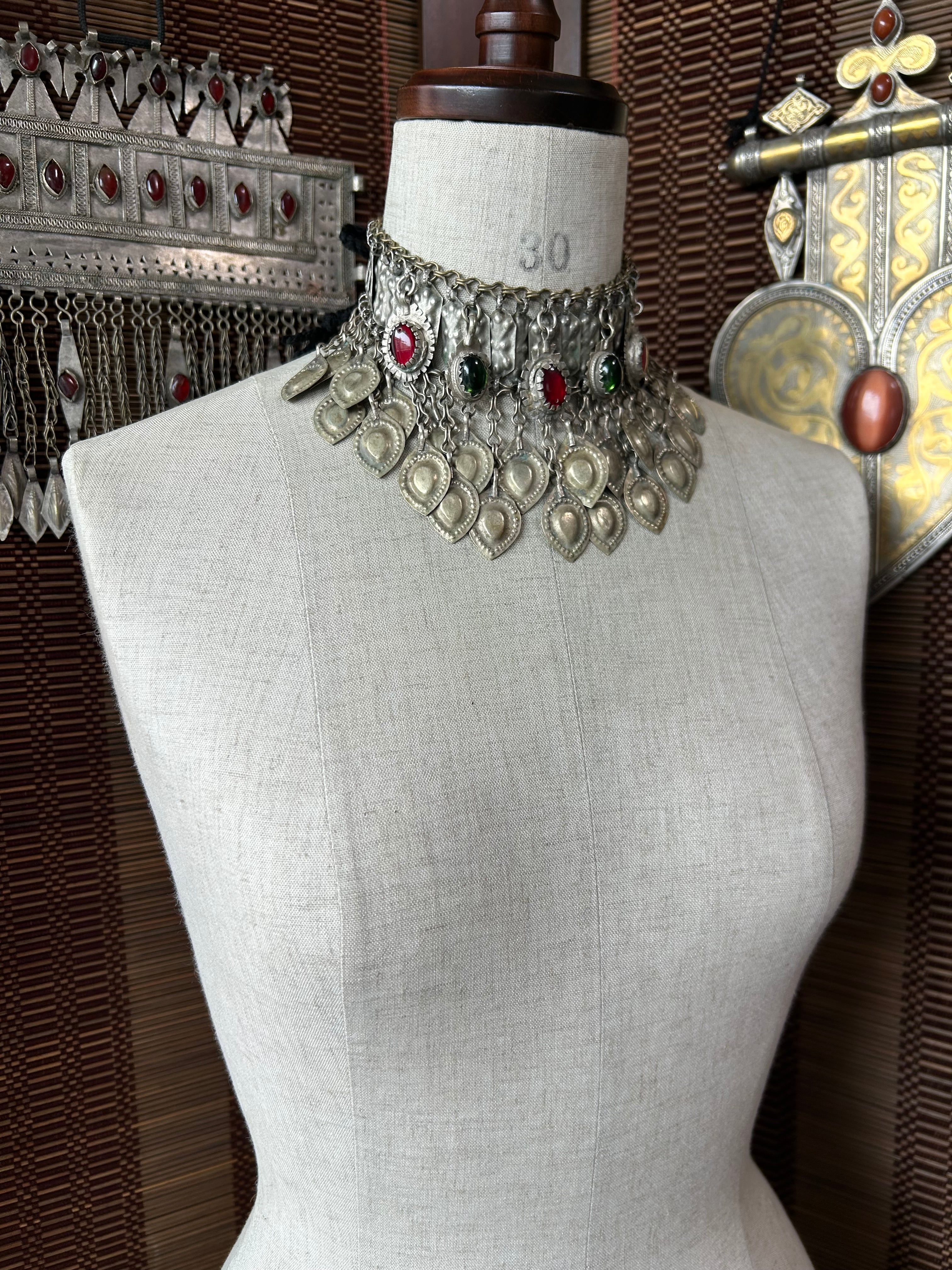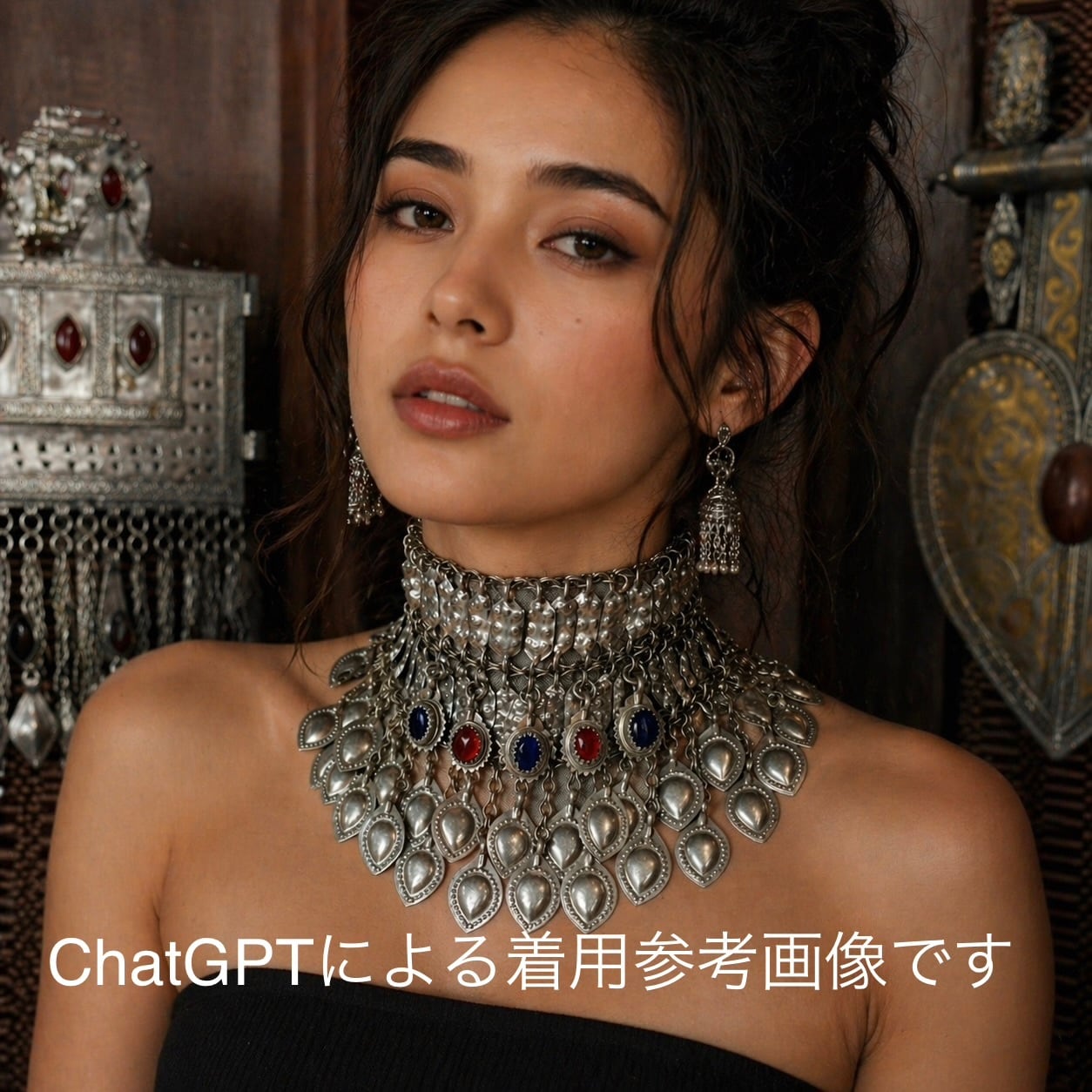 This was originally a headdress, but I've transformed it into a choker. The fringe adds a touch of elegance to your neckline. While the other items I have listed (A, B, and C) have two tiers, this one has a single tier, and the color has a slightly golden tint. The red and green embellishments can be removed with pliers, so you can enjoy wearing them with or without them as you like.