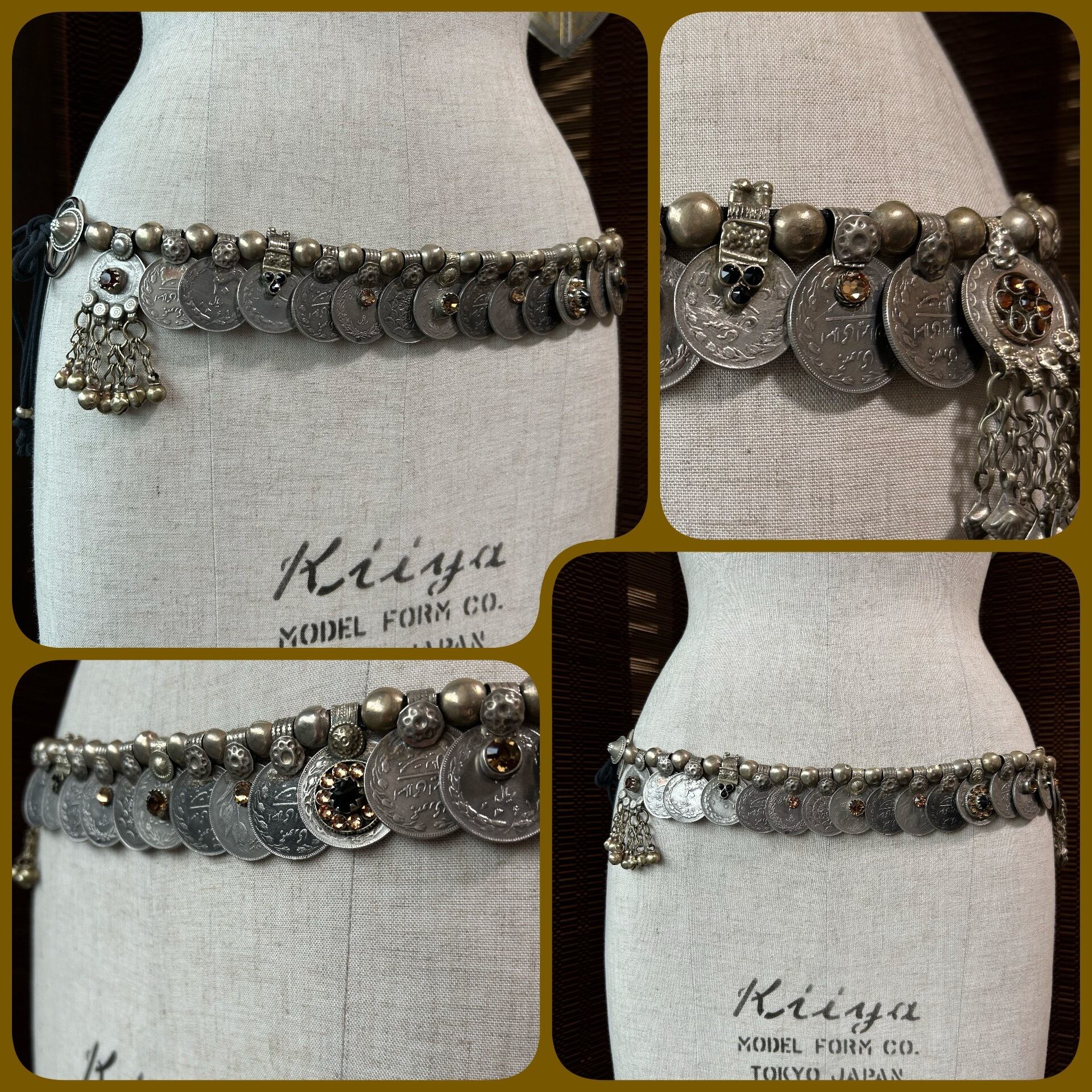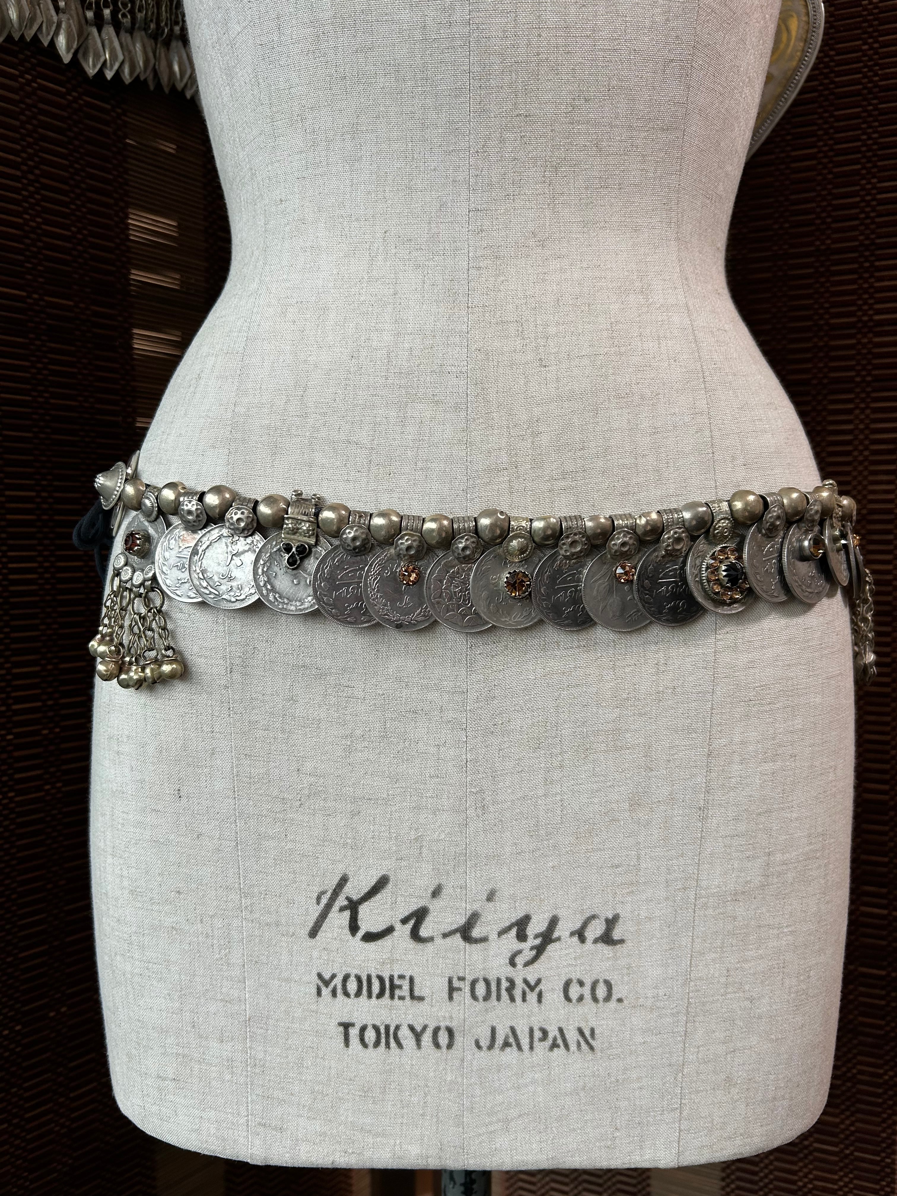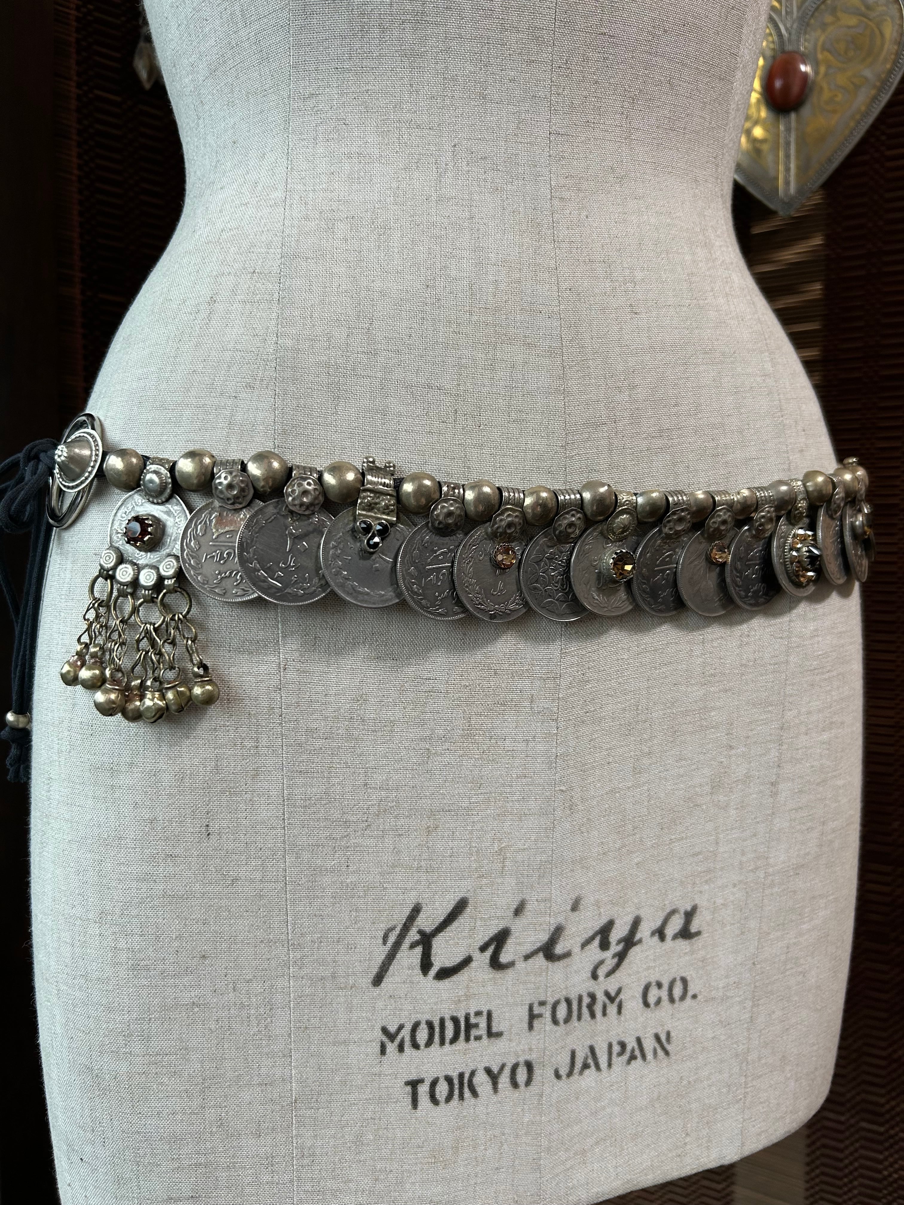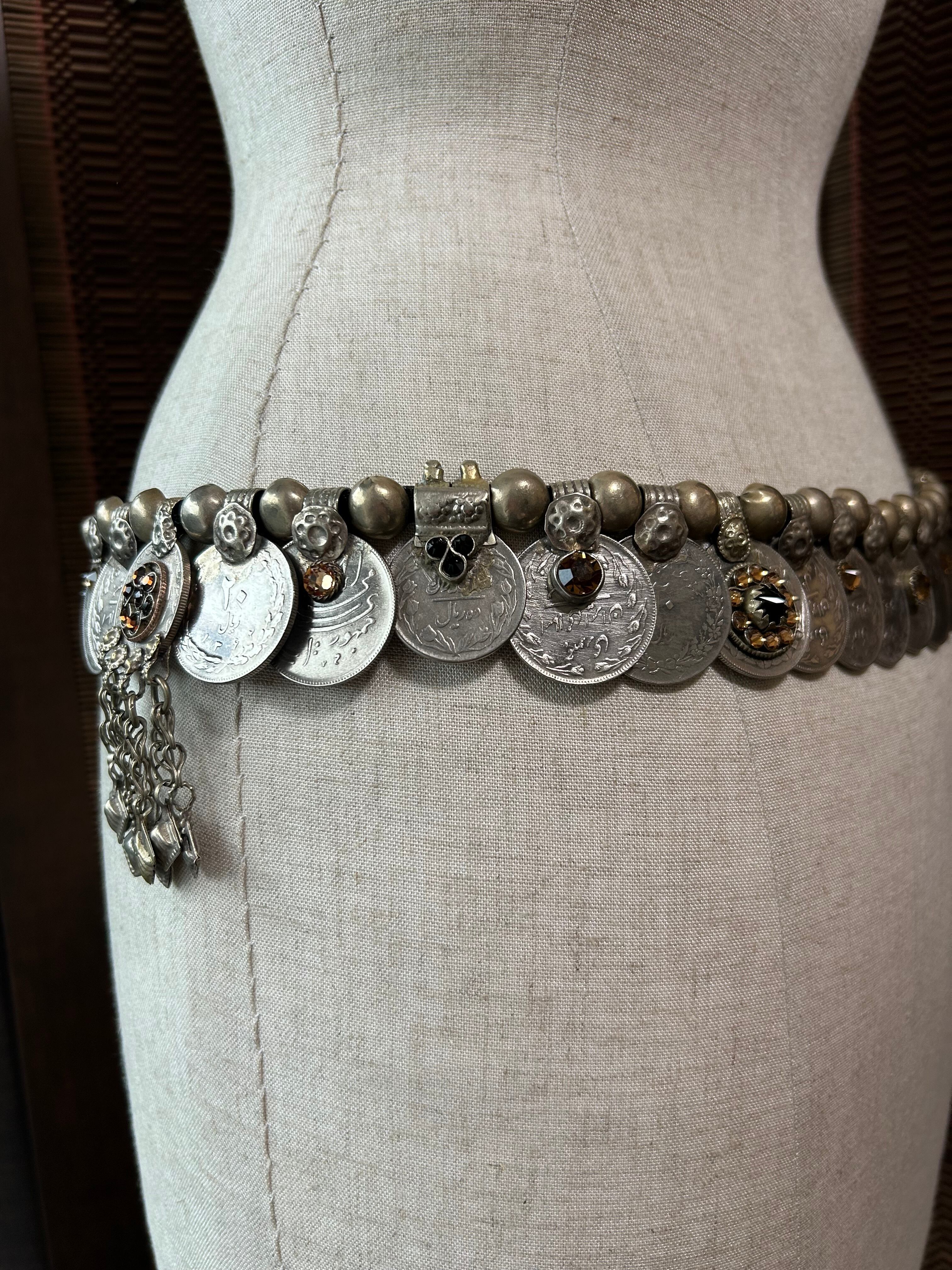 Approximately 80cm in length. Made with rare large-sized coins and decorated coins. Adorned with black and amber Swarovski crystals for a touch of glamour.