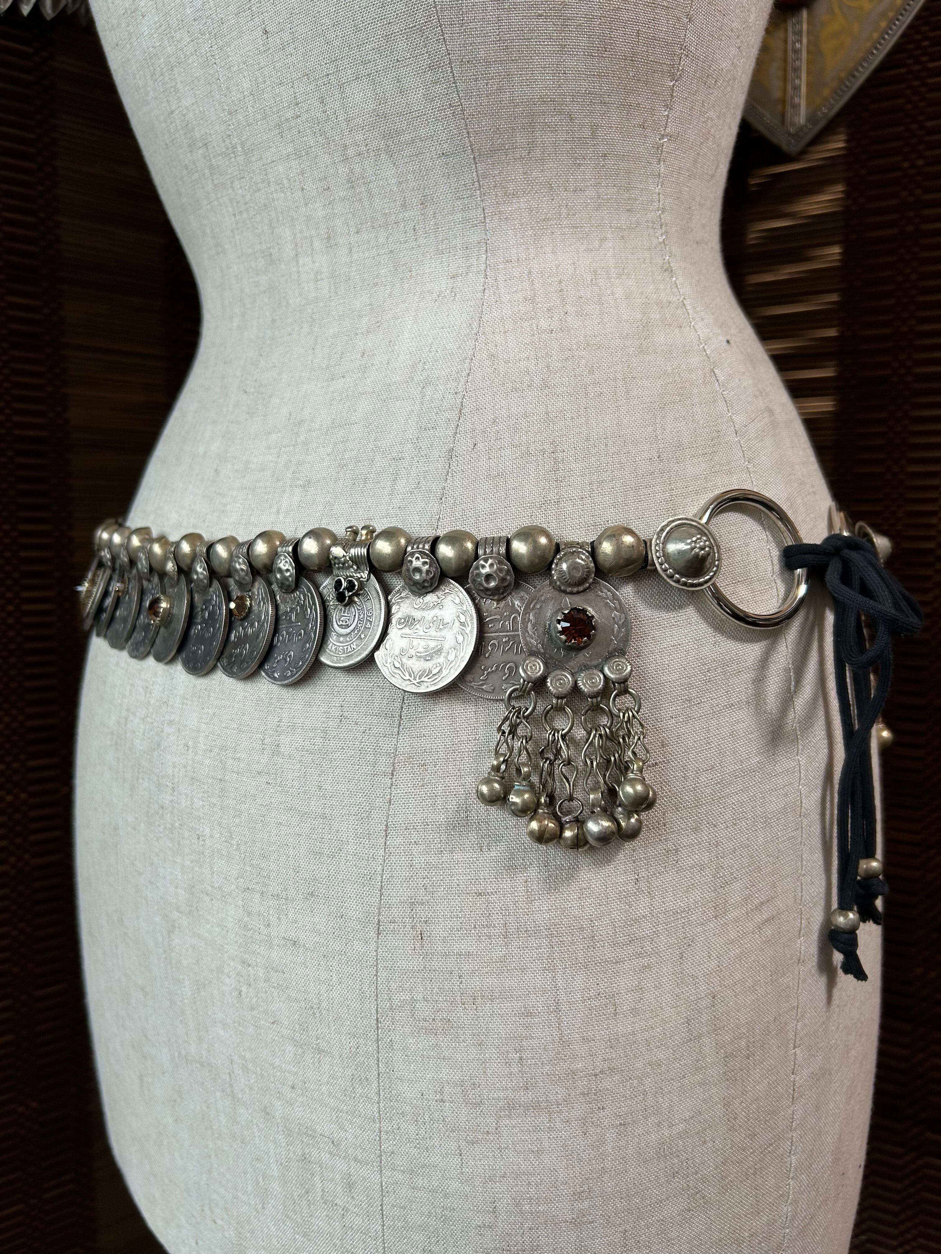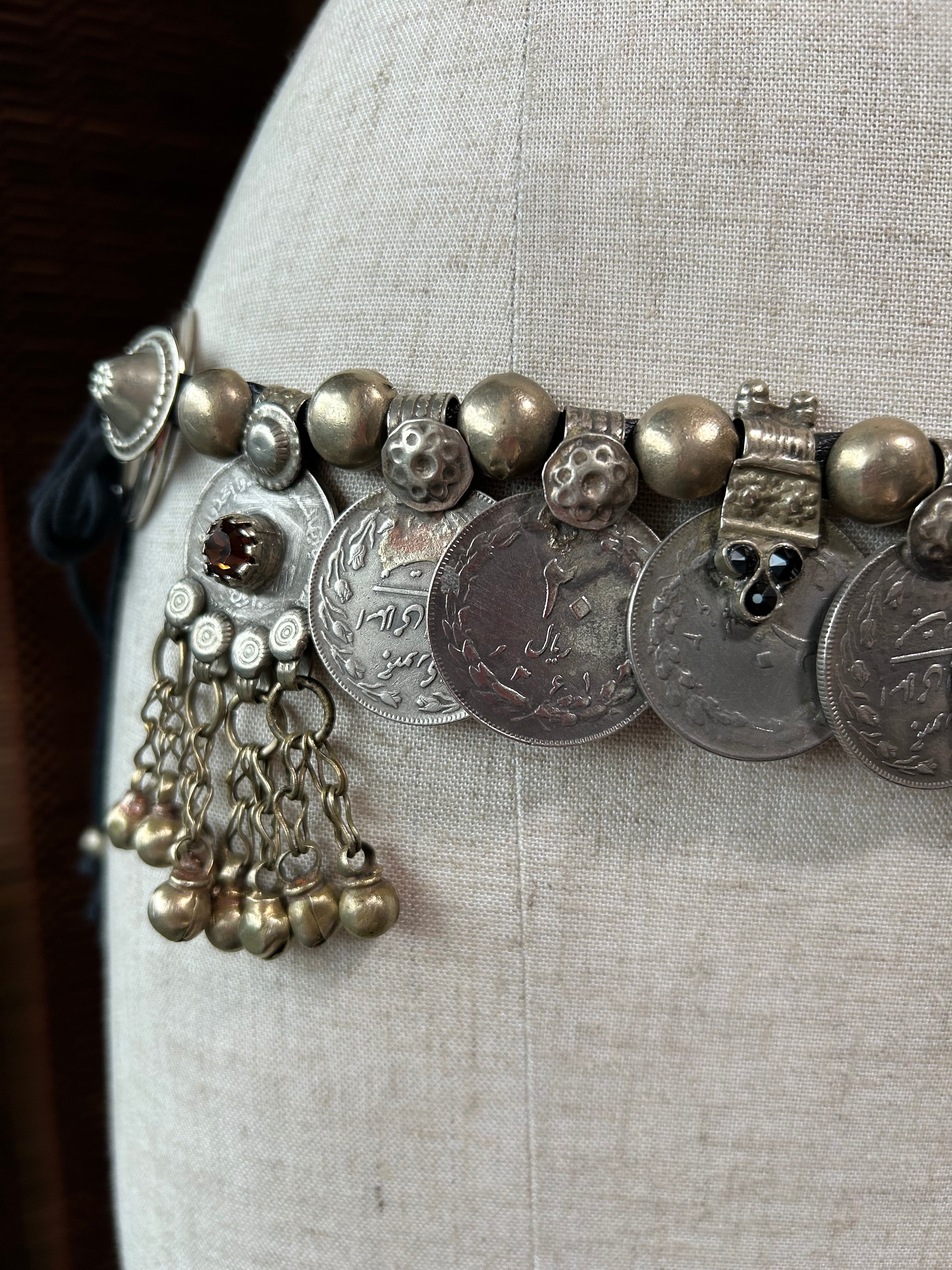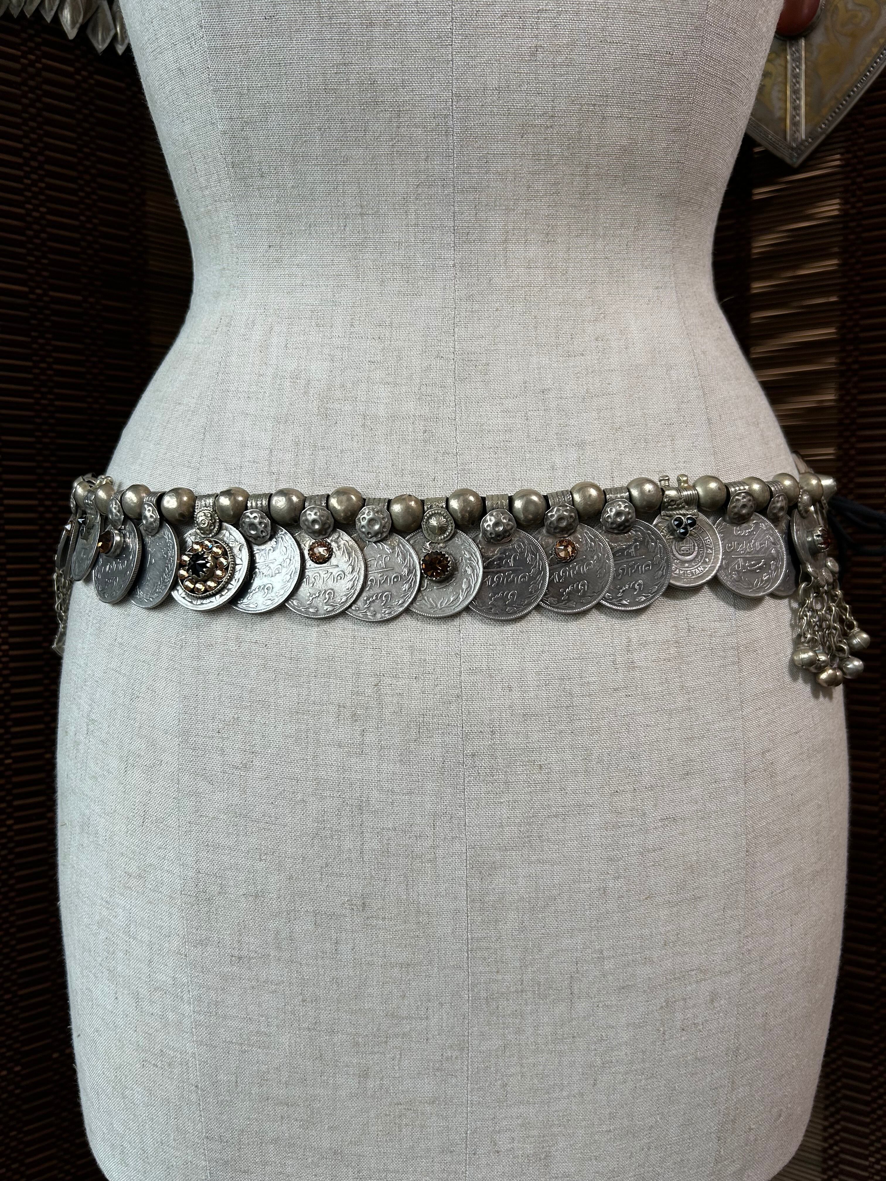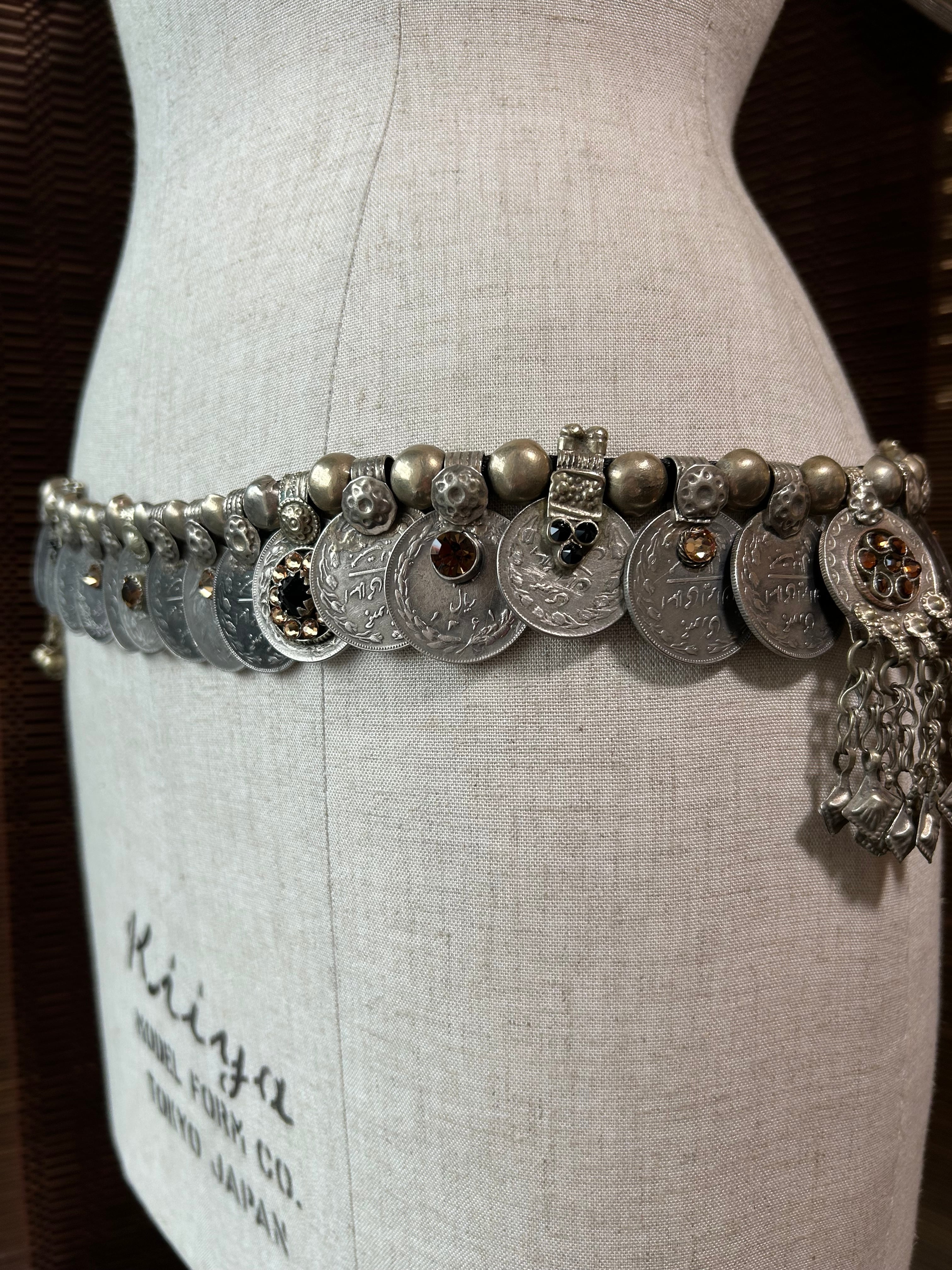 Approximately 80cm in length. Made with rare large-sized coins and decorated coins. Adorned with black and amber Swarovski crystals for a touch of glamour.